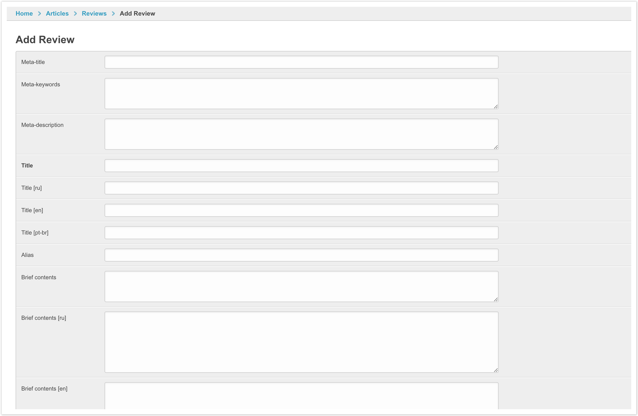 O acesso à seção de publicação de artigos e blogs é realizado na parte administrativa do portal na seção "Artigos", que inclui seções: Para adicionar ou editar um artigo, use os links Adicionar ou Editar na seção Artigos, que abre uma janela de artigo de adicionar ou editar semelhante à abaixo. |
