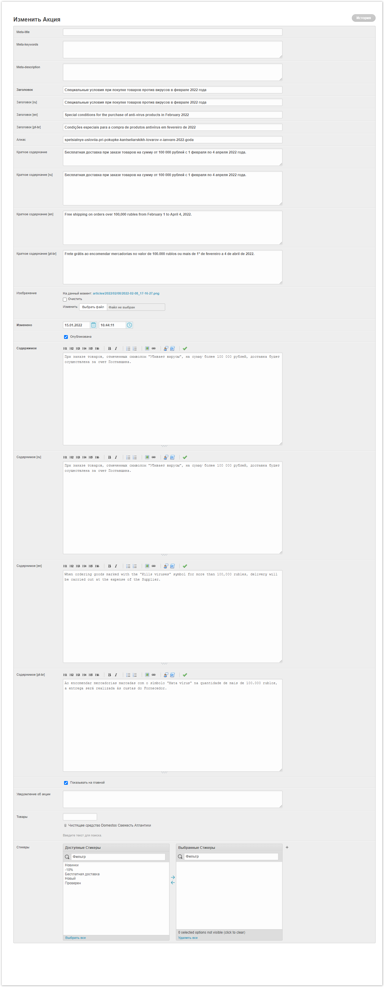 Access to the section for publishing articles and blogging is carried out in the administrative part of the portal in the "Articles" section, which includes sections: To add or edit an article, use the "Add" or "Change" links in the "Articles" section, and a window for adding or editing an article similar to the one below will open. |
