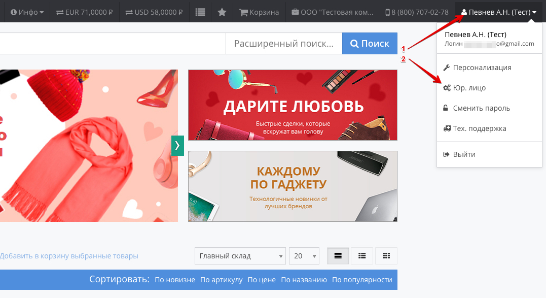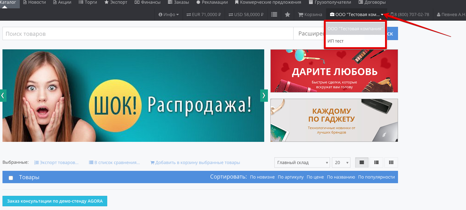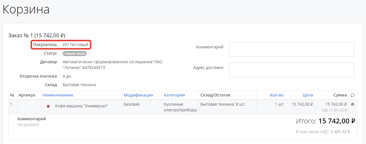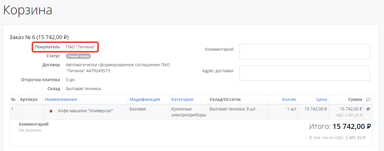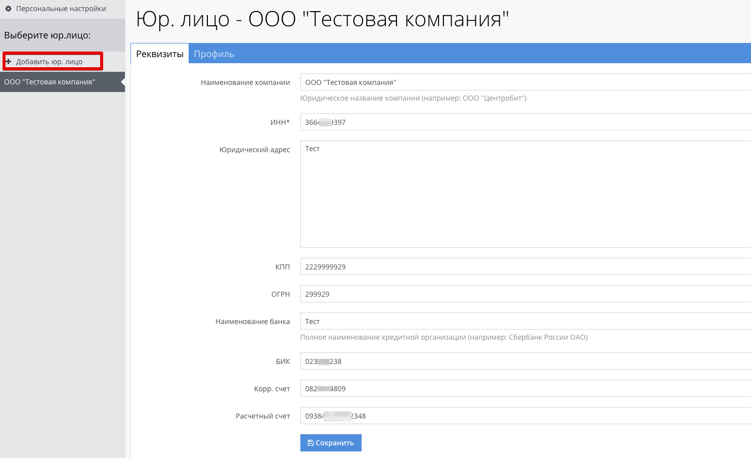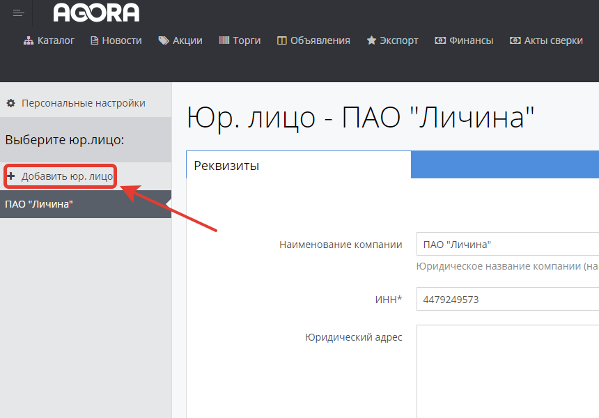 Чтобы добавить еще одну организацию, используя которую можно делать заказы, перейдите в настройки юр. лиц: В открывшемся окне нажмите кнопку Добавить юр. лицо: Выберите тип организации (юр. лицо или индивидуальный предприниматель), укажите ее реквизиты. Для сохранения изменений нажмите кнопку Сохранить. После сохранения можно будет выбирать организацию в качестве покупателя. Выбор организации осуществляется в верхнем меню: При этом заказ будет оформлен на выбранную организацию: |