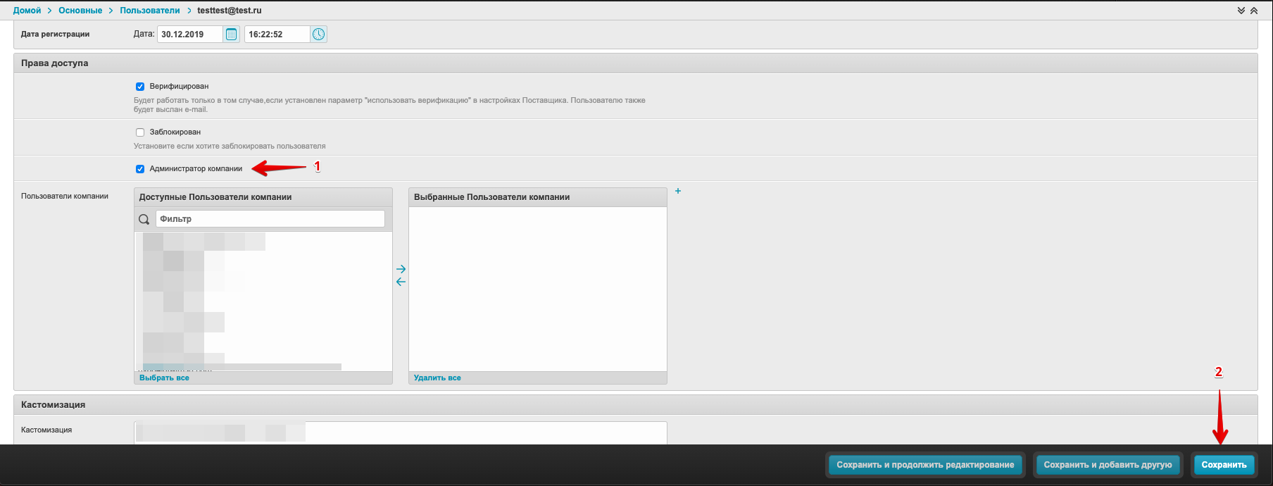 Выберите нужного пользователя, которому вы хотите предоставить возможность заводить пользователей связанных с покупателем, и перейдите на страницу настроек, кликнув по логину: В разделе Права доступа установите чекбокс Администратор компании и нажмите Сохранить: В меню этого личного кабинета появится раздел Админ.Компании: Для создания нового Пользователя необходимо кликнуть по кнопке Создать пользователя: Далее необходимо заполнить данные пользователя: После сохранения данных будет показано уведомление о успешном создании Пользователя: При клике на кнопку Вернуться к списку откроется страница со списком созданных пользователей через этот аккаунт: Пользователь также доступен в разделе Пользователи административной панели проекта: Пользователю будет доступен обычный функционал личного кабинета Покупателя: Администратор компании может заблокировать и разблокировать созданных пользователей в разделе Администрирование компании: Администратор компании может авторизоваться в созданном аккаунте пользователя компании с помощь кнопки Вход в блоке Личный кабинет: |