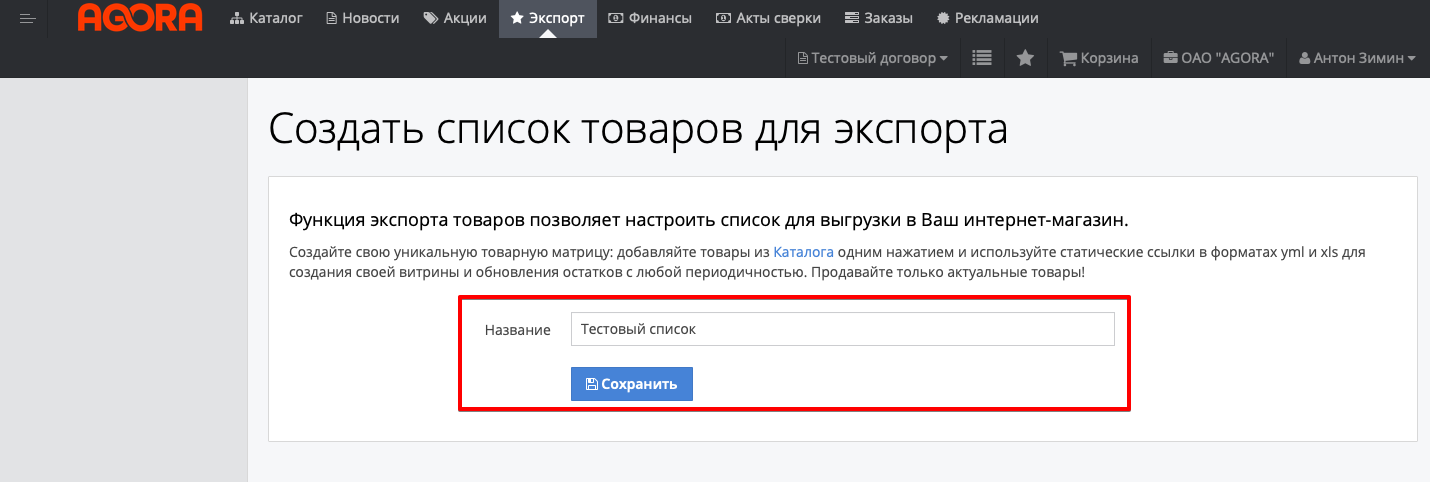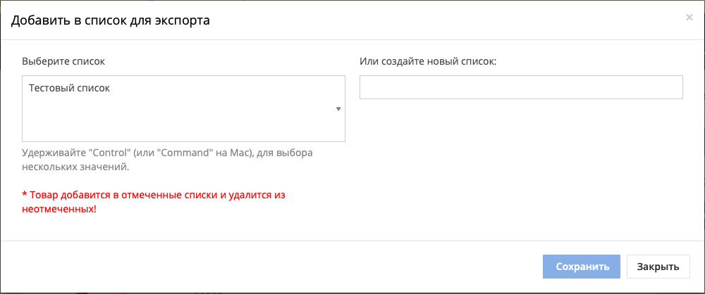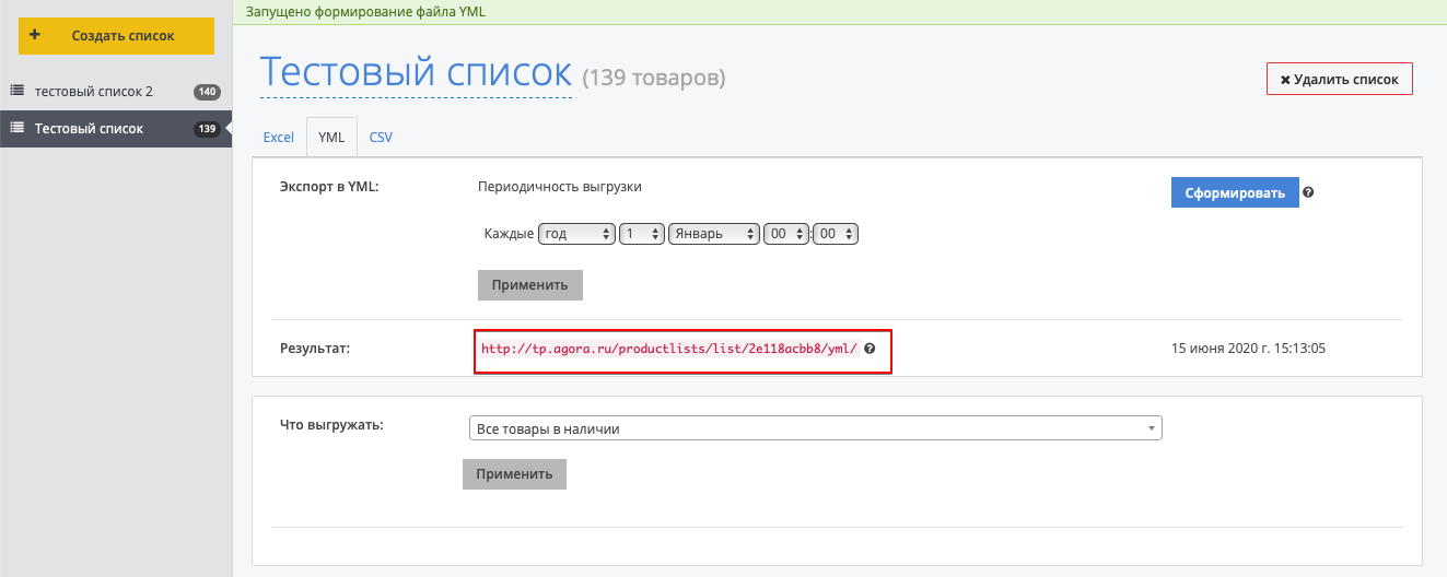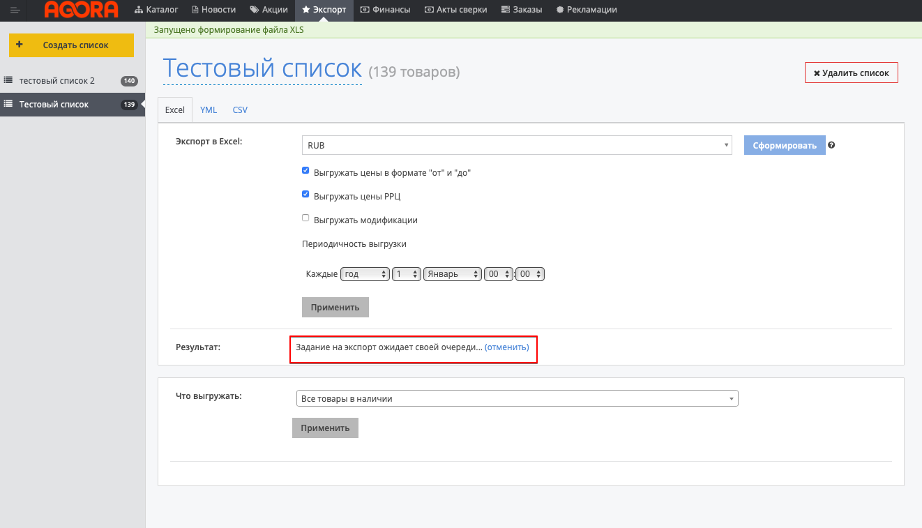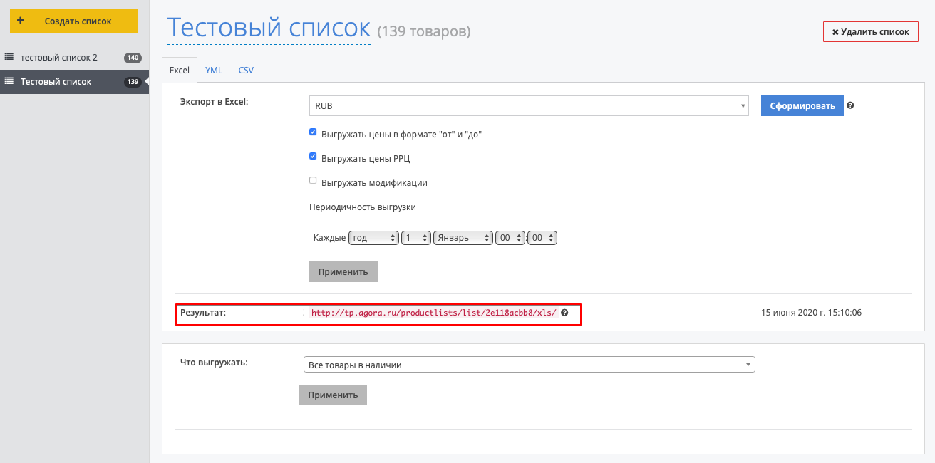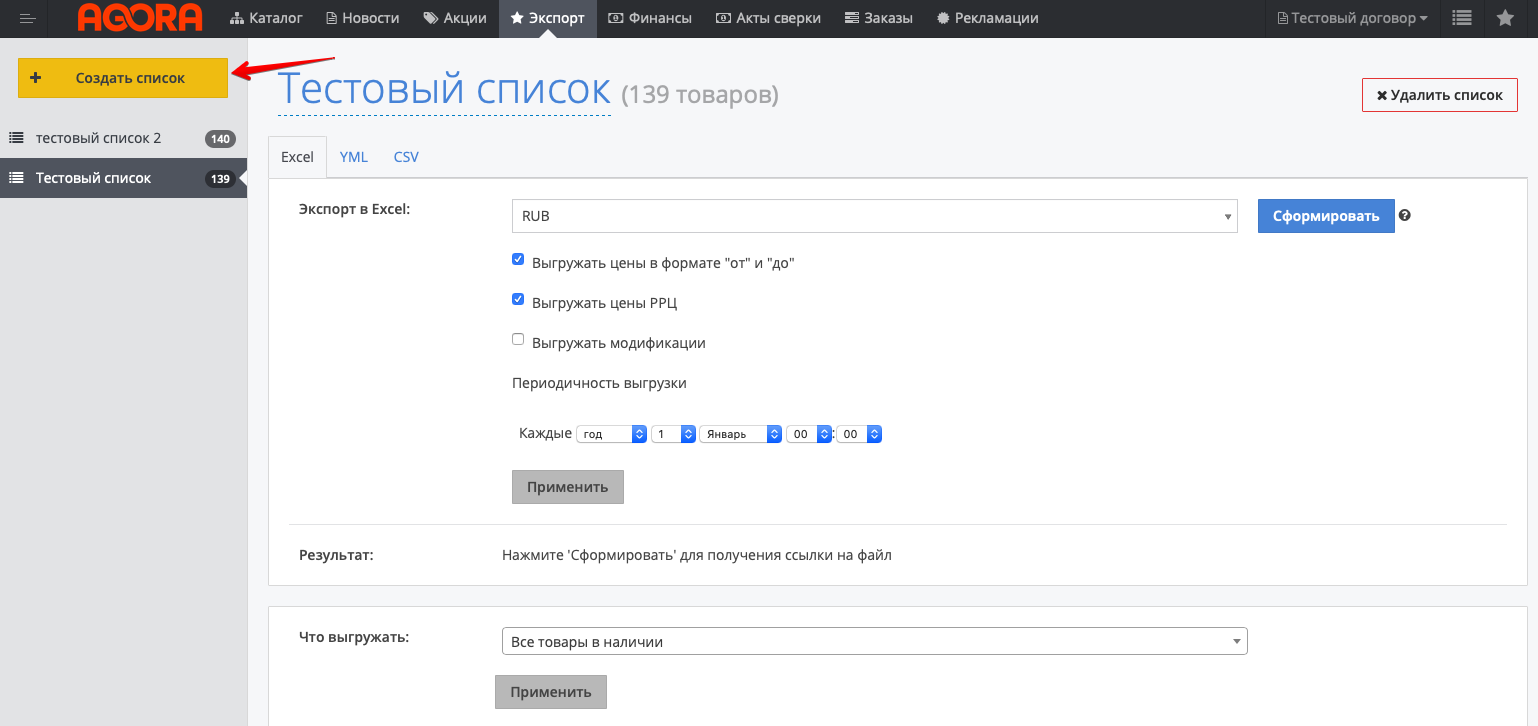 There are 3 ways to export product lists from the system to the online store. You can use static links in XLS, YML, and CSV formats to create product displays and balance updates. 1. Preparation of the list of products for exportTo export products, go to the "Export" section in the admin panel of the site. This will open a page where you can unload the products according to the already prepared list of products. If the list of products for unloading has not been previously created, it will be proposed to create a new list. 1.1. Create Product ListTo create a list of products, indicate its name and click the "Save" button. 1.2. Adding products to the listAfter creating a list of products, you must add products to it. There are several options for this: 1.2.1. Adding products from the product catalogIn the product catalog, you can mark one or more products with the help of checkboxes and click “Export products”. Next, you will be asked to choose which list to export these products to export to - you can select an existing list (left field of the form) or create a new list (right field of the form) and click on the "Save" button. All selected products will be added to the list for export. After the necessary products are added to the export list, they will be marked with a “banner” in the catalog with the name of the list: 1.2.2. Adding products using filtersOn the page of the selected export list, you can configure filters for selecting products in the "What to unload" section. Can choose: