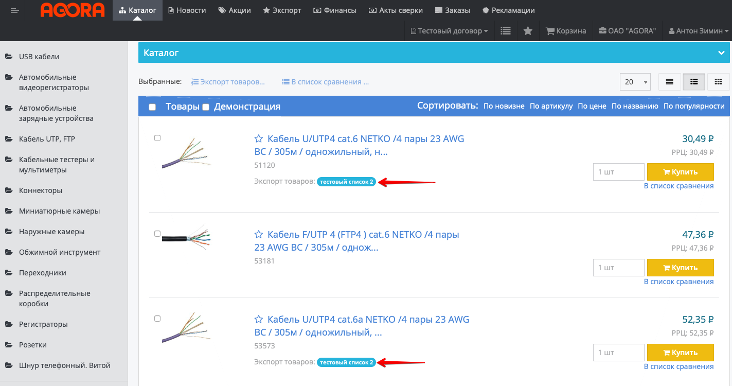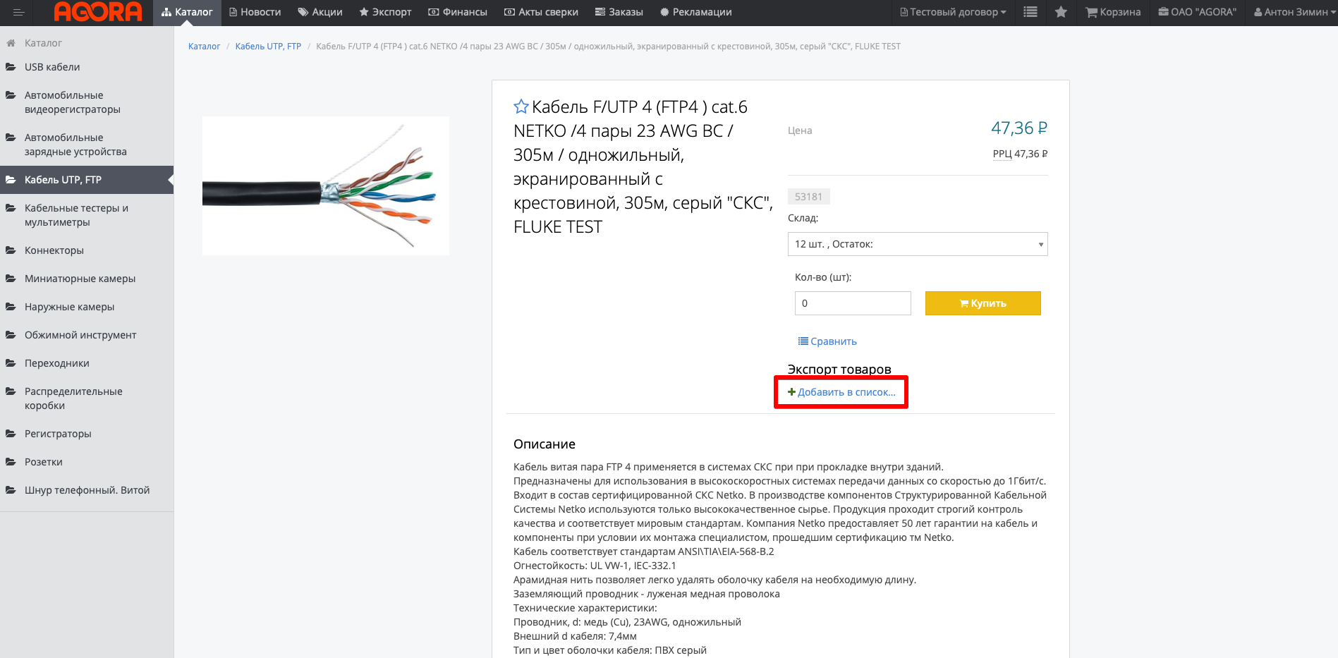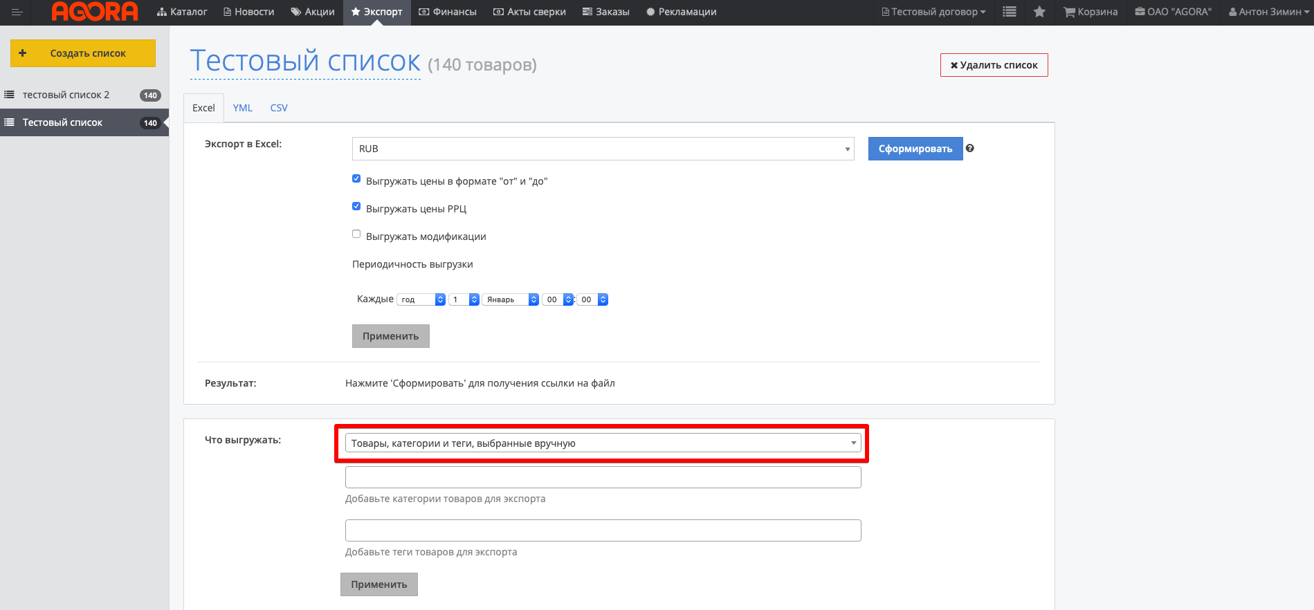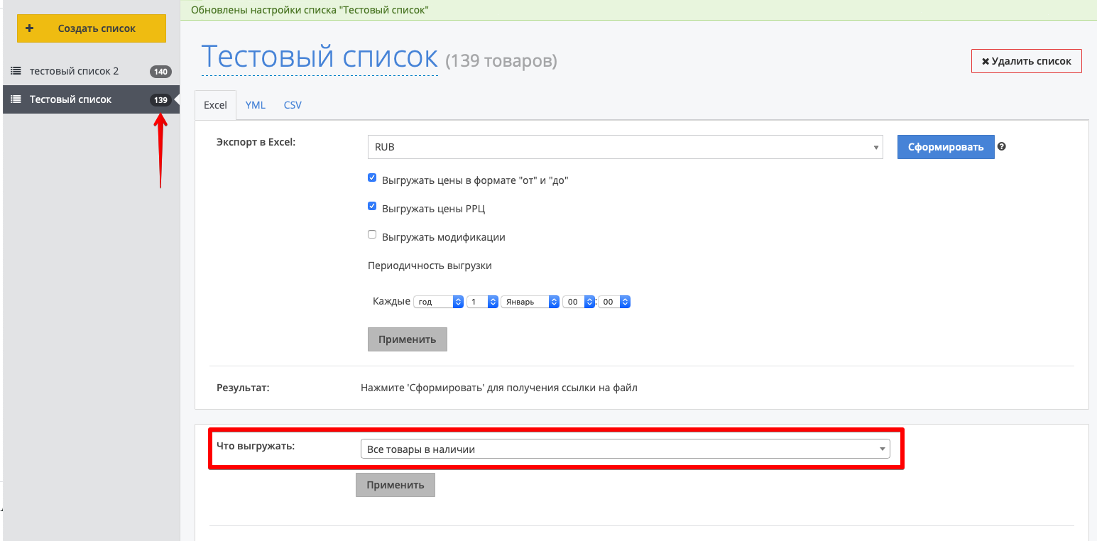 After completing the filter settings, click the "Apply" button. After that, the number of selected products will be displayed in the left sidebar near the list name. 1.2.2. Adding to the list from the product cardIn the product card, you can click the "Add to list ..." button in the "Export products" block. Further, as in the case of the product catalog, it will be offered to choose in which lists this product should be added. If necessary, you can create a new list for export by clicking on the "Create List" button. in the Export section: 2. Configure export options2.1. Export to ExcelBefore exporting, make the following settings: