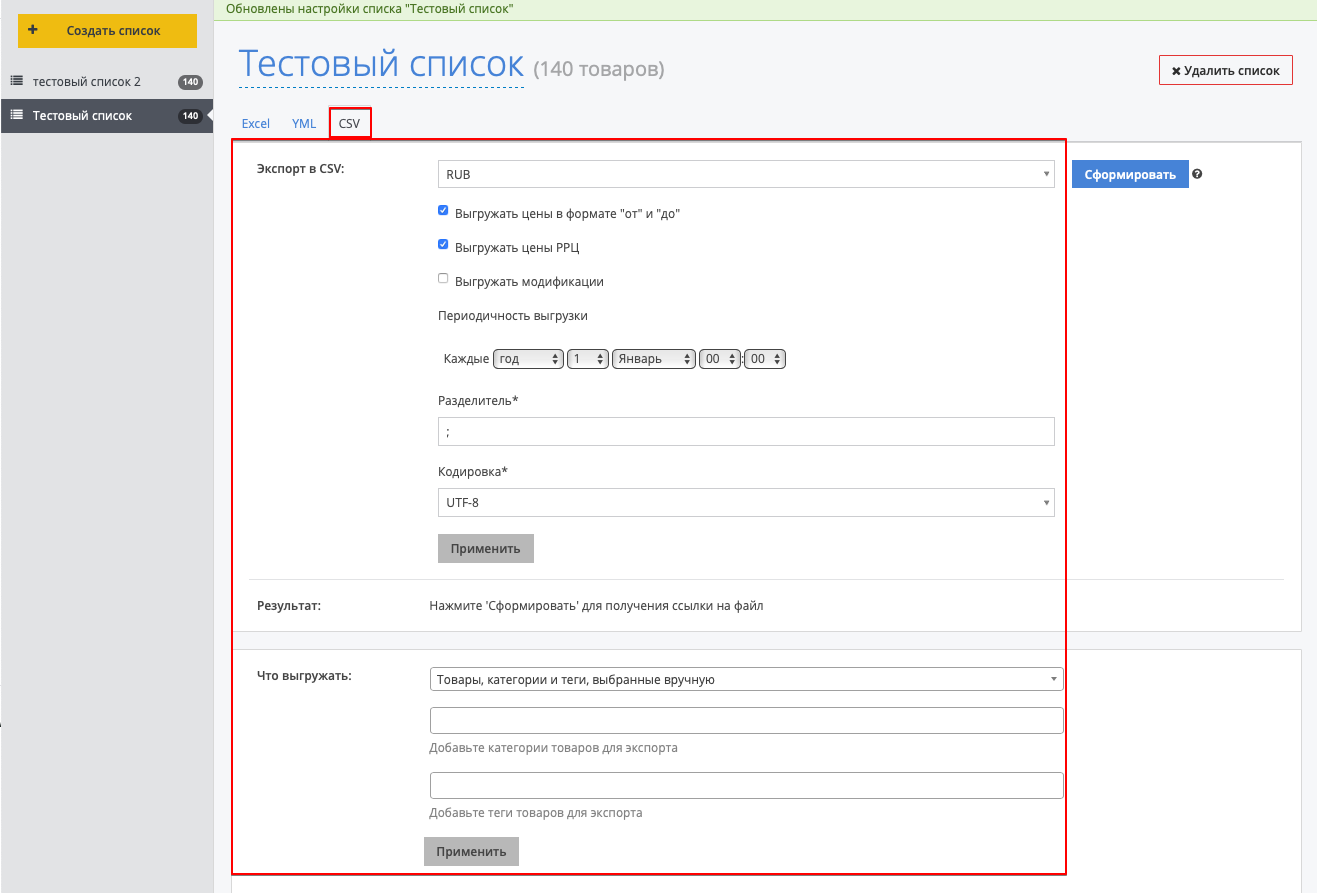 In this case, you can only select the frequency of unloading, after which you also need to click the "Apply" button. 2.3. CSV ExportThis option is similar to Export to Excel, except for the need to specify a separator in the "Separator" field. 3. Export the list of productsAfter selecting the products for unloading and setting up export options in the required format, click on the "Generate" button . After that, the process of forming the file will begin, the "Generate" button will become inactive, but the "Cancel" button will appear, which allows you to cancel the process if an error was made when setting the necessary parameters. After the formation is completed, a link for downloading a file with the results of exporting the list of products will appear in the "Result" block. When setting the frequency of unloading, this link will be updated at the specified time. |