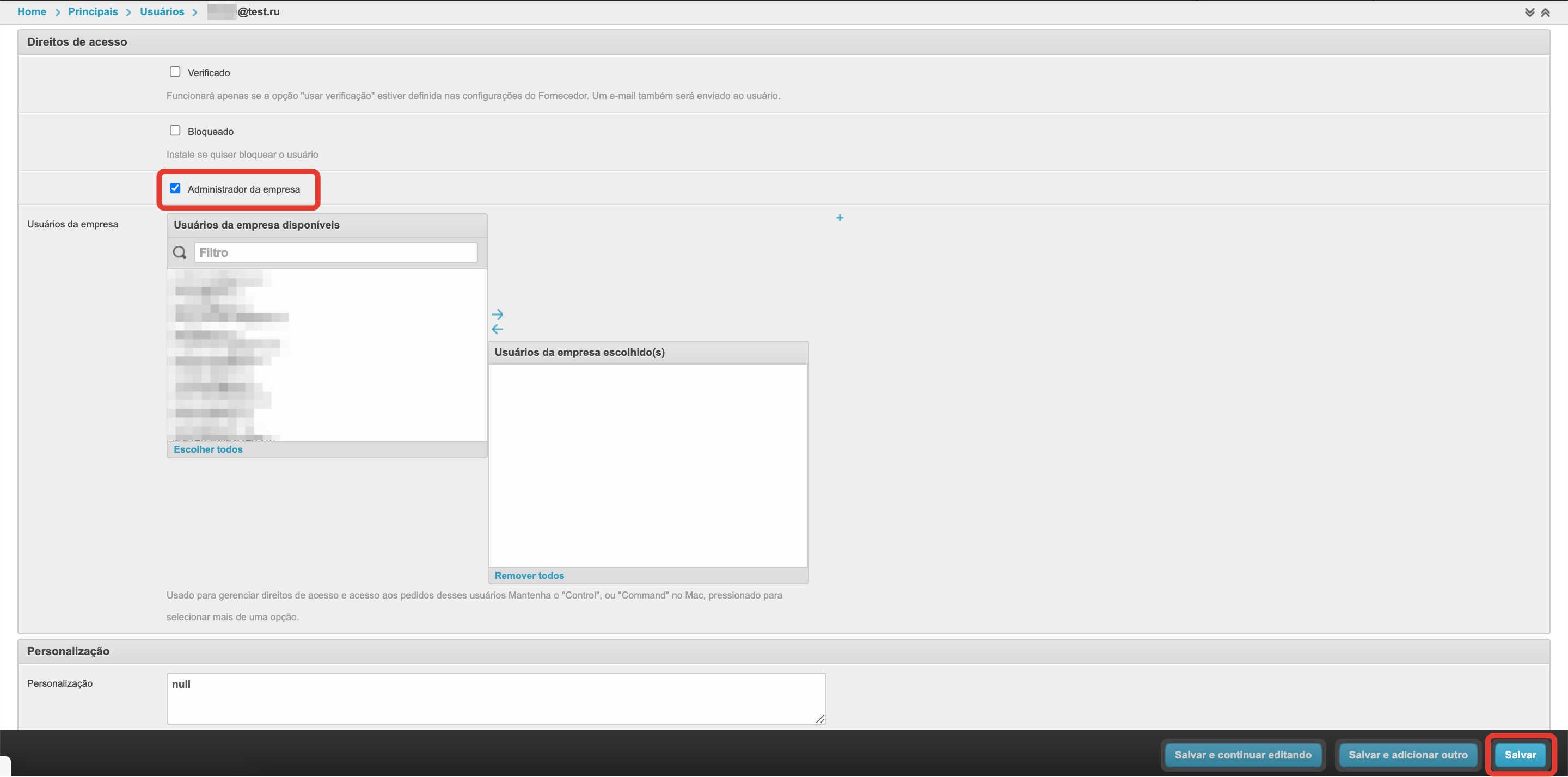 Esta configuração permite que você designe um usuário da empresa como administrador e permita que ele registre outros usuários para essa empresa.