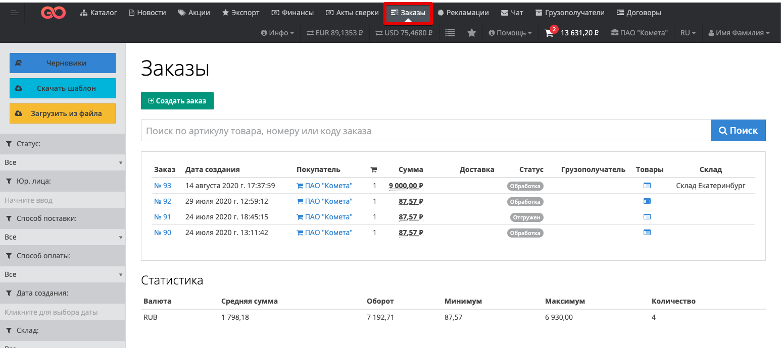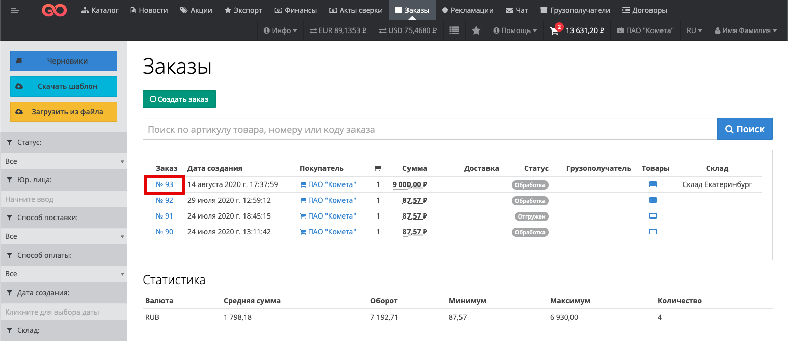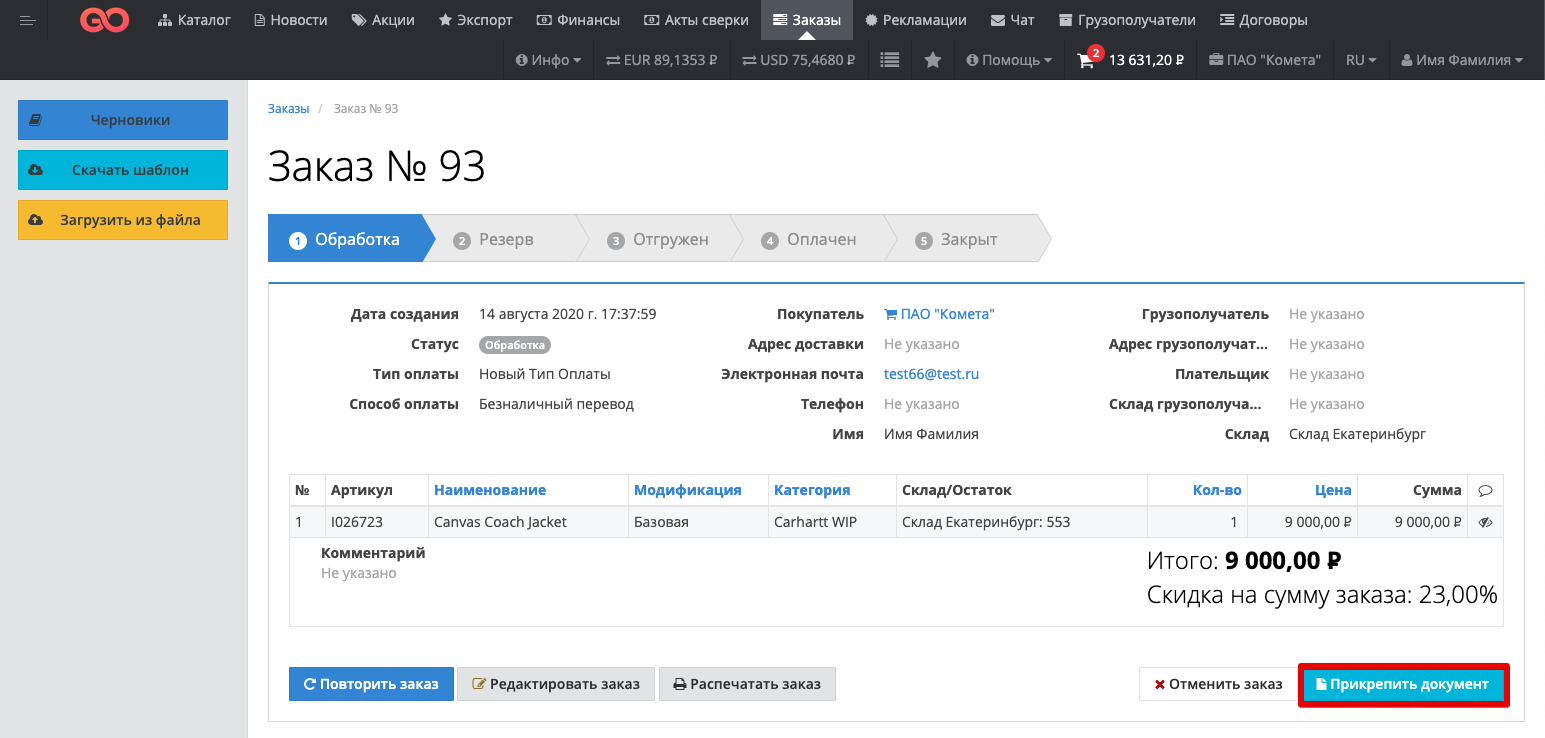 This functionality allows the Customer and the Supplier to exchange documents within the order. The capabilities of this functionality are described below. Users of the Customer or Supplier can log in to their personal account and go to the Orders section: Then the user can go to the card of a specific order, within which it is planned to exchange documents: The button "Attach a document" is available in the order card: When you click on the "Attach document" button, a modal window will open with the ability to select a file to attach to the order on your device: Specify the name of the attached document, select the file and click on the "Attach to order" button: After that, the Order Documents section will be added to the order card, within which a list of all uploaded documents within this order will be presented. The documents will be available for saving on the computer by both the Customer and the Supplier. |