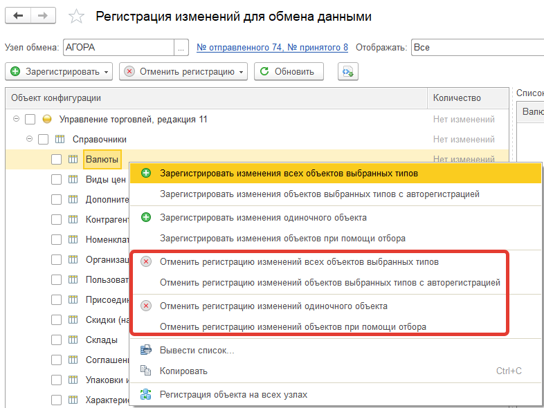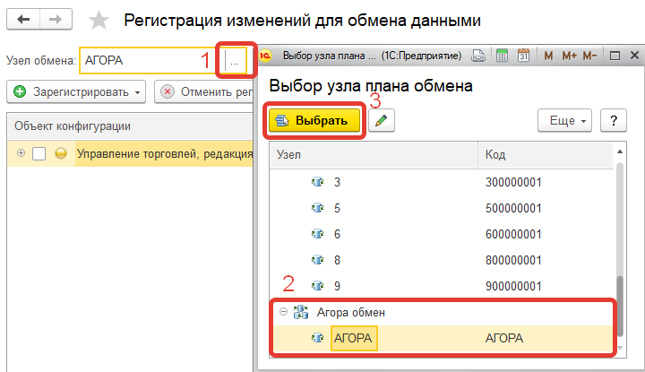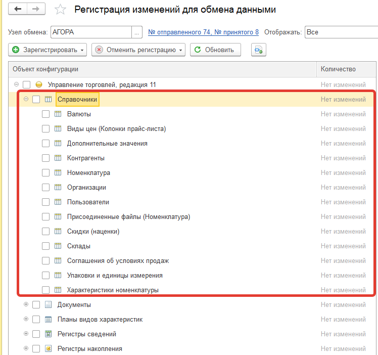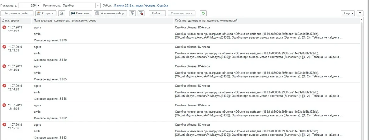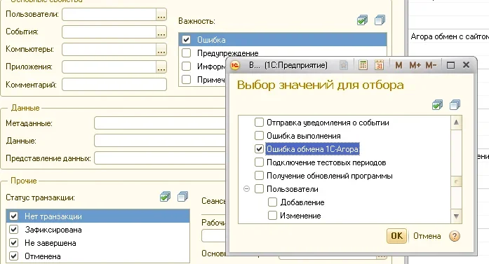 To analyze the problem, check the "Exchange queue" section of the portal in the admin panel. Check if new packages are coming. This can be seen by the date of creation. If packages are being downloaded, make sure that different packages are arriving and not the same one. You can check this by the name of the packages. If the same package is constantly loaded from 1C to the portal, then you need to check the registration log for errors. To do this, go to "Processing" and select "Log". Set the selection for Agora errors, as shown in the screenshot: If the log contains errors of the "Object not found" type and the sending of one packet to the portal is looped, then this indicates that a deleted object has entered the change log. To solve this problem, you must perform the following steps in 1C: Go to the Agora exchange gateway, open the "Change registration for data exchange" processing Specify the "AGORA" exchange node, if it is not specified Expand the Directories branch and find in the directories objects specified as "object not found". Click on each of them with the right mouse button and select the "Remove from registration" option in the context menu. After that, check the exchange queue again on the portal. The portal should start receiving new packages. |
