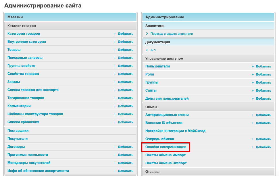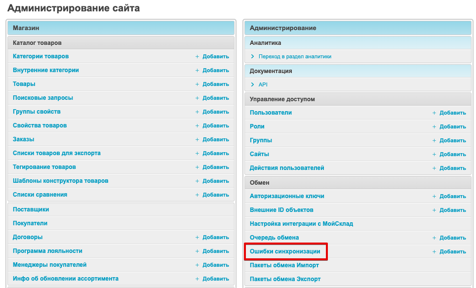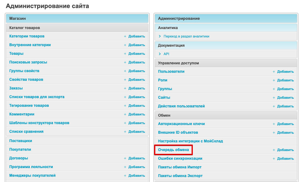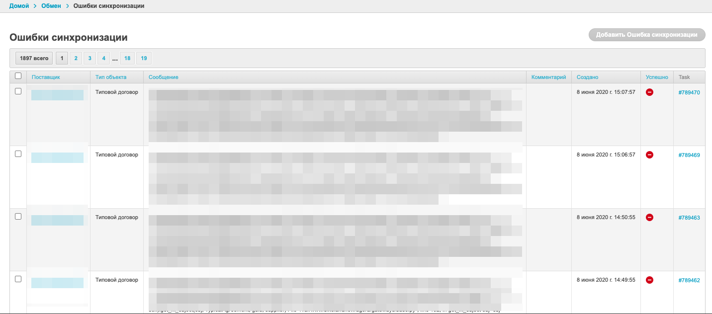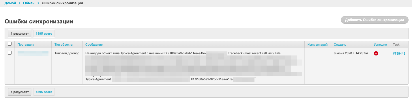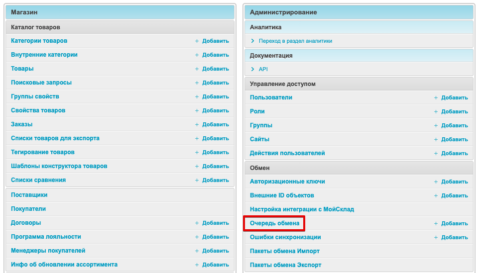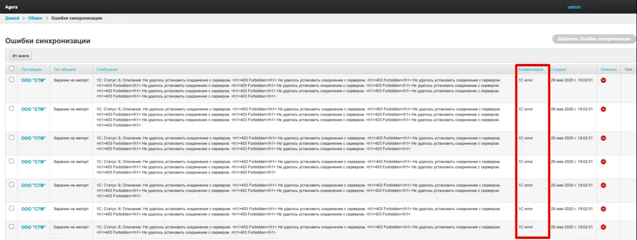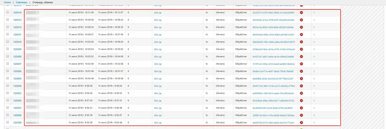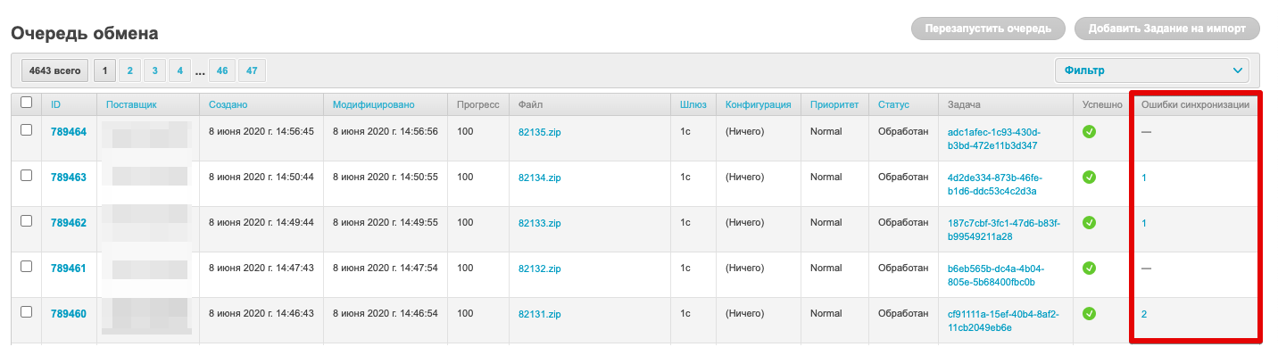 Errors in data processing are displayed in the administrative panel of the project. A user with site administrator rights can view the status of job processing in the exchange queue. To do this, go to the Exchange queue section