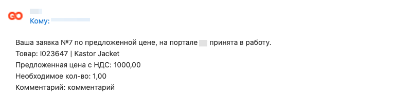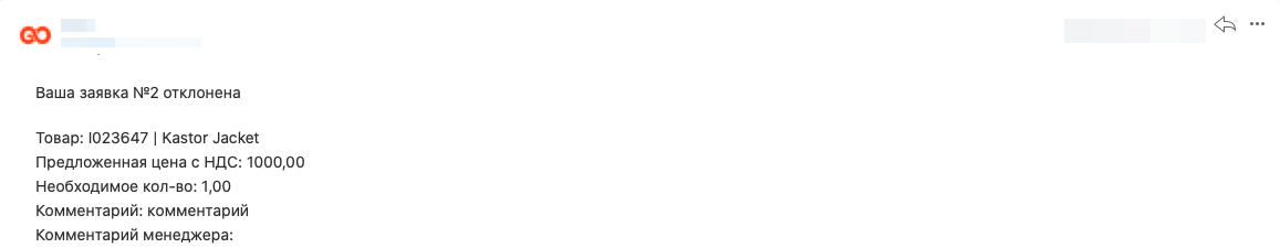 Upon acceptance of the application, the Customer will receive a notification of the following type: If the status of the application is set to Rejected, the Customer will be sent a notification of the form: Thus, the Supplier has the opportunity to receive orders for products with zero price, process them and notify the client about the reason for the refusal, if required. |