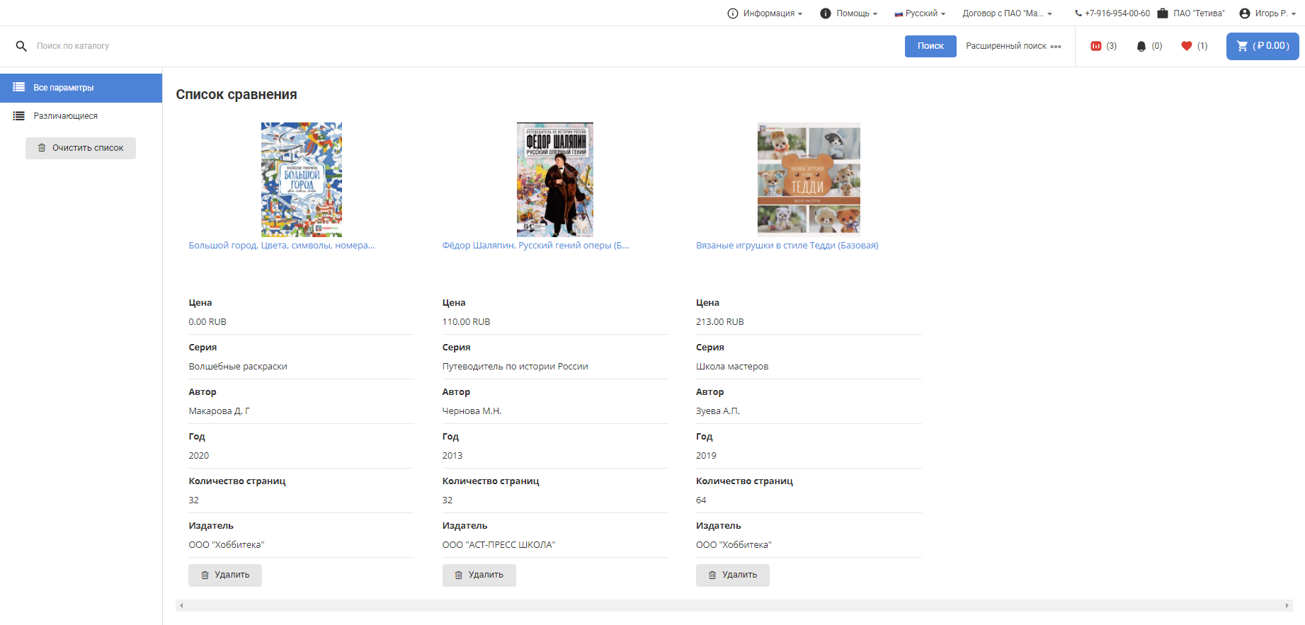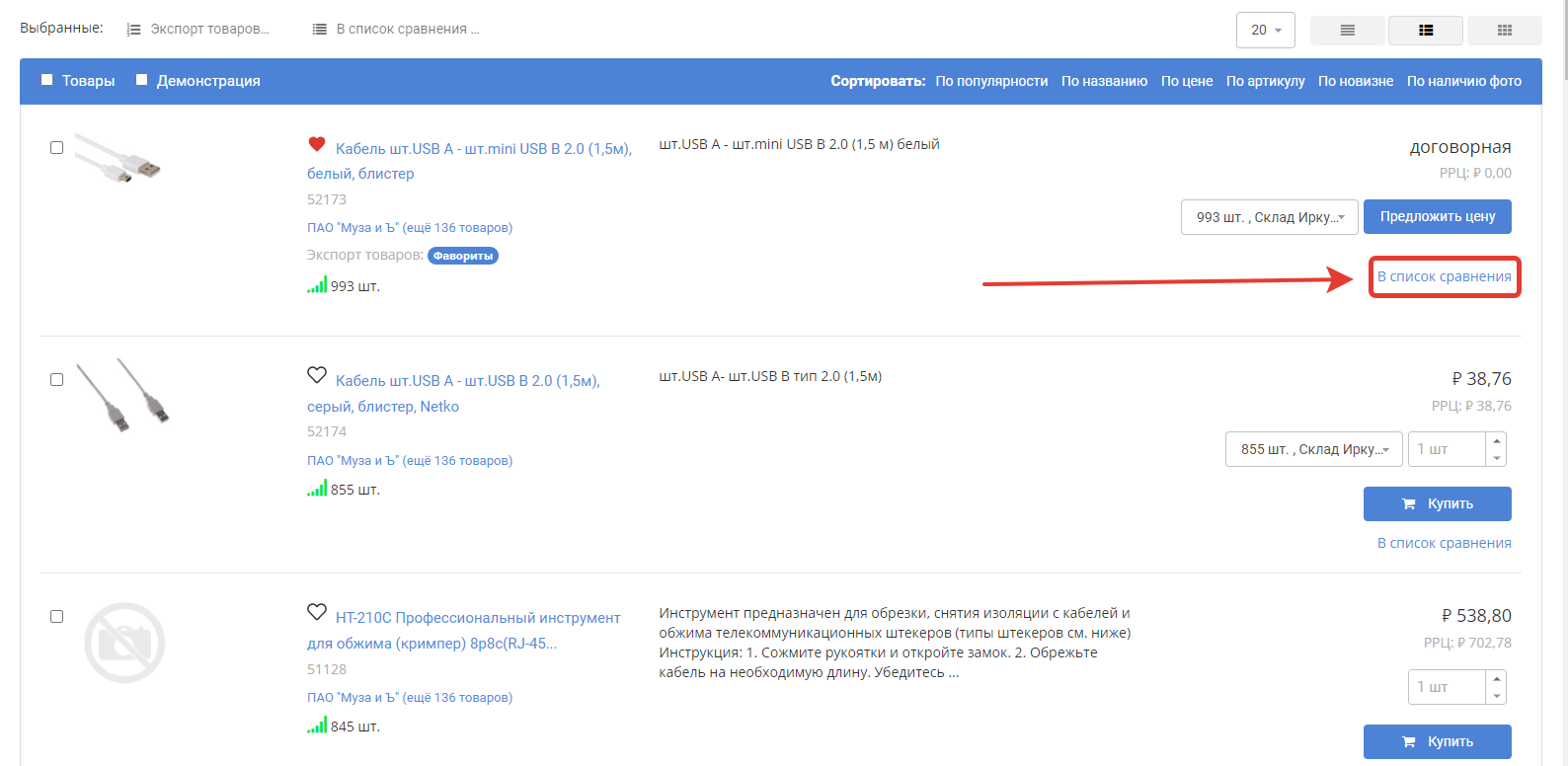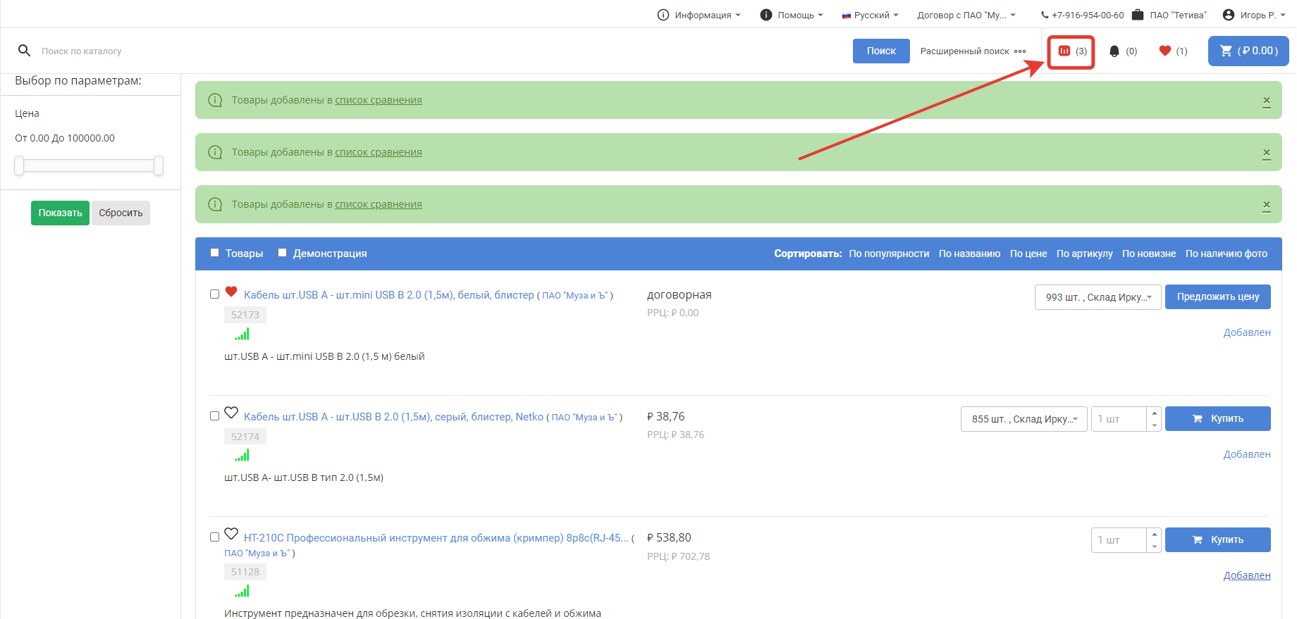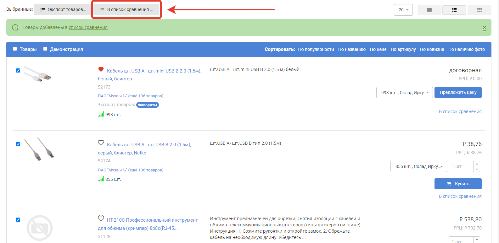To compare specific products, check the box next to the product: After selecting several products, add them to the comparison list by clicking the button of the same name: The selected products will be added to the comparison list, which can be accessed from the top menu of the portal: The number on the icon of the comparison list means the number of added products, in our case - 4. When you go to the Product comparison section, a list of added products and their characteristics will be available: To add an item to your Favorites, click on the star icon next to the item: After that, the number of items added to favorites will be displayed in the top menu: To go to the list of favorite products, click on the star, which displays the number of added products. In our case, this is a value of 3. In the window that opens, a list of items added to favorites will be displayed. If necessary, they can be added to the basket, bypassing the general catalog of products: |
