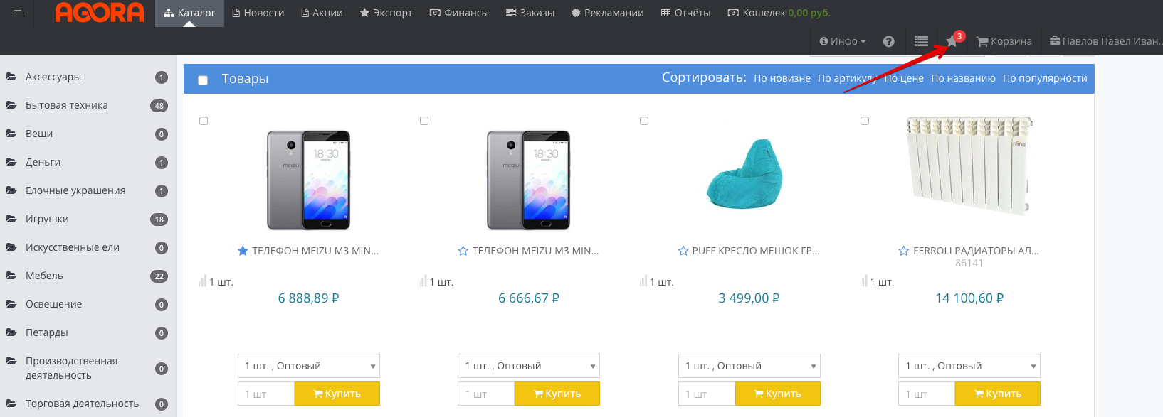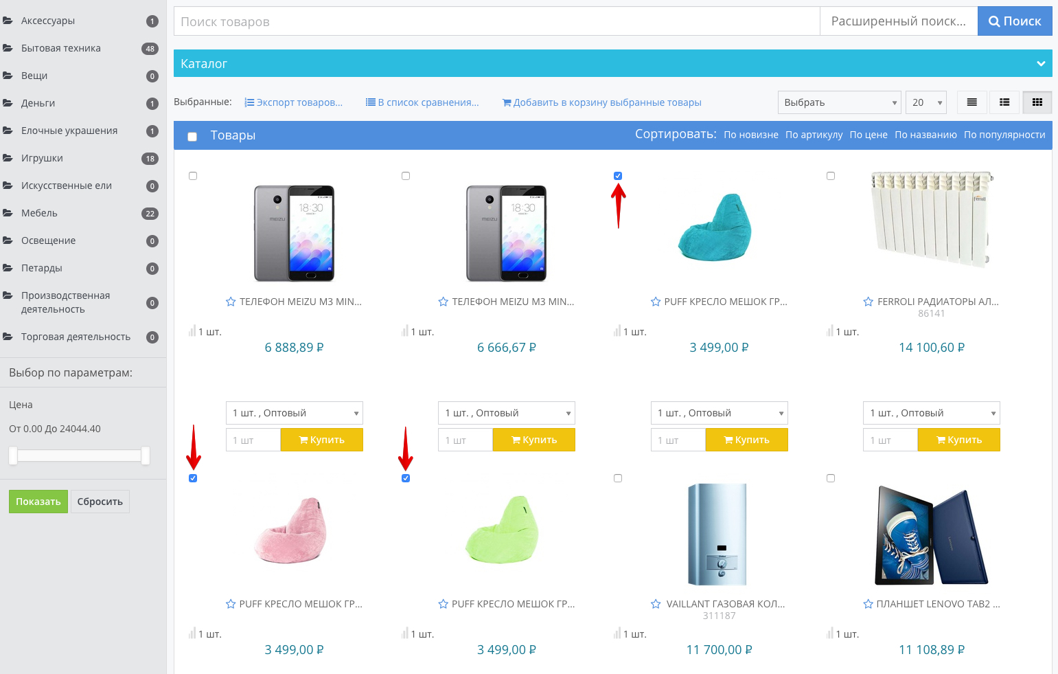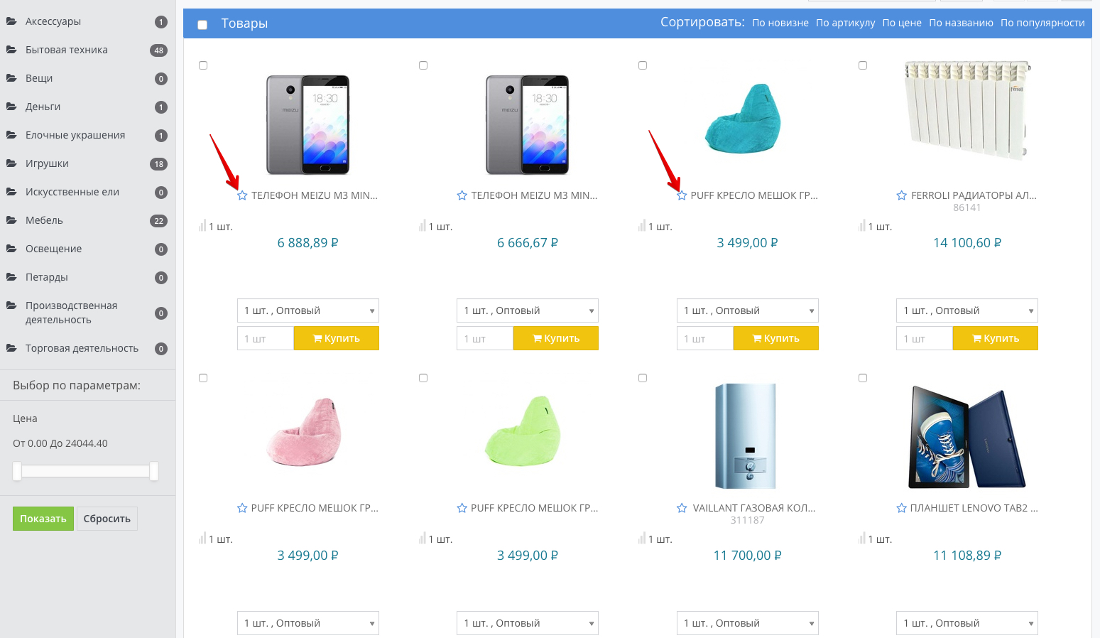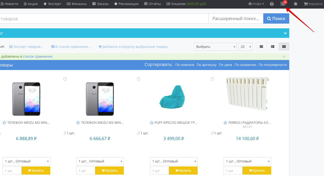 To compare specific products, check the box next to the product: After selecting several products, add them to the comparison list by clicking the button of the same name: The selected products will be added to the comparison list, which can be accessed from the top menu of the portal: The number on the icon of the comparison list means the number of added products, in our case - 4. When you go to the Product comparison section, a list of added products and their characteristics will be available: To add an item to your Favorites, click on the star icon next to the item: After that, the number of items added to favorites will be displayed in the top menu: To go to the list of favorite products, click on the star, which displays the number of added products. In our case, this is a value of 3. In the window that opens, a list of items added to favorites will be displayed. If necessary, they can be added to the basket, bypassing the general catalog of products: |