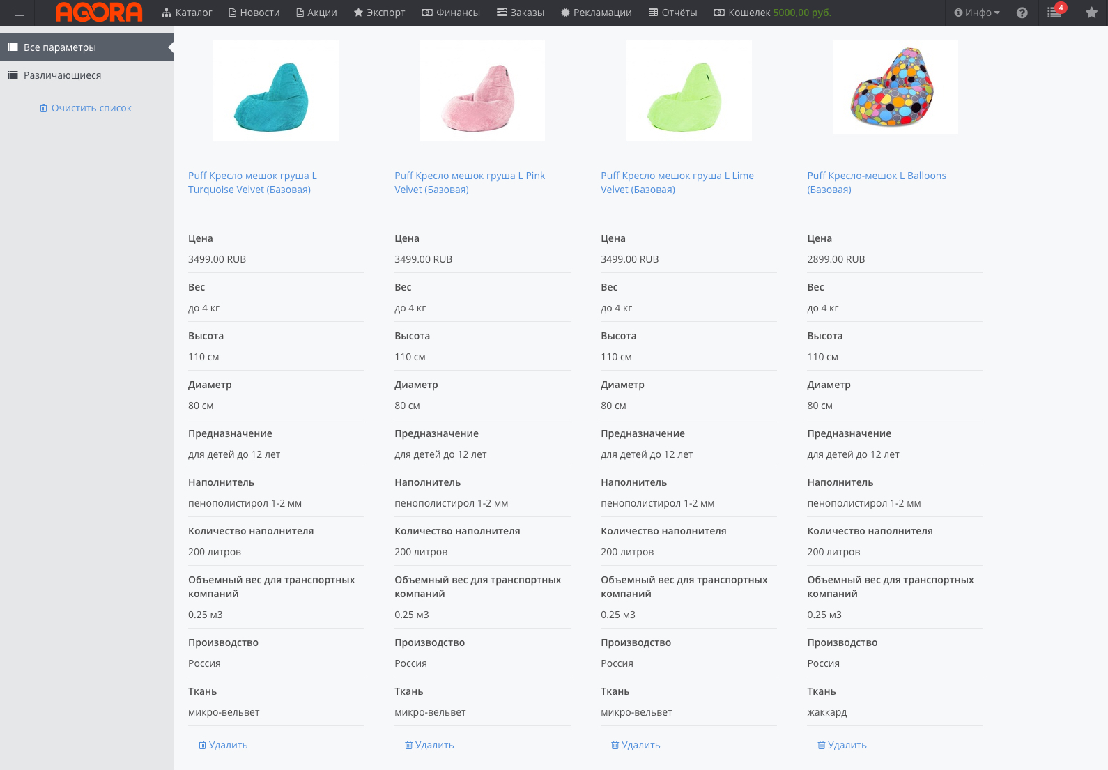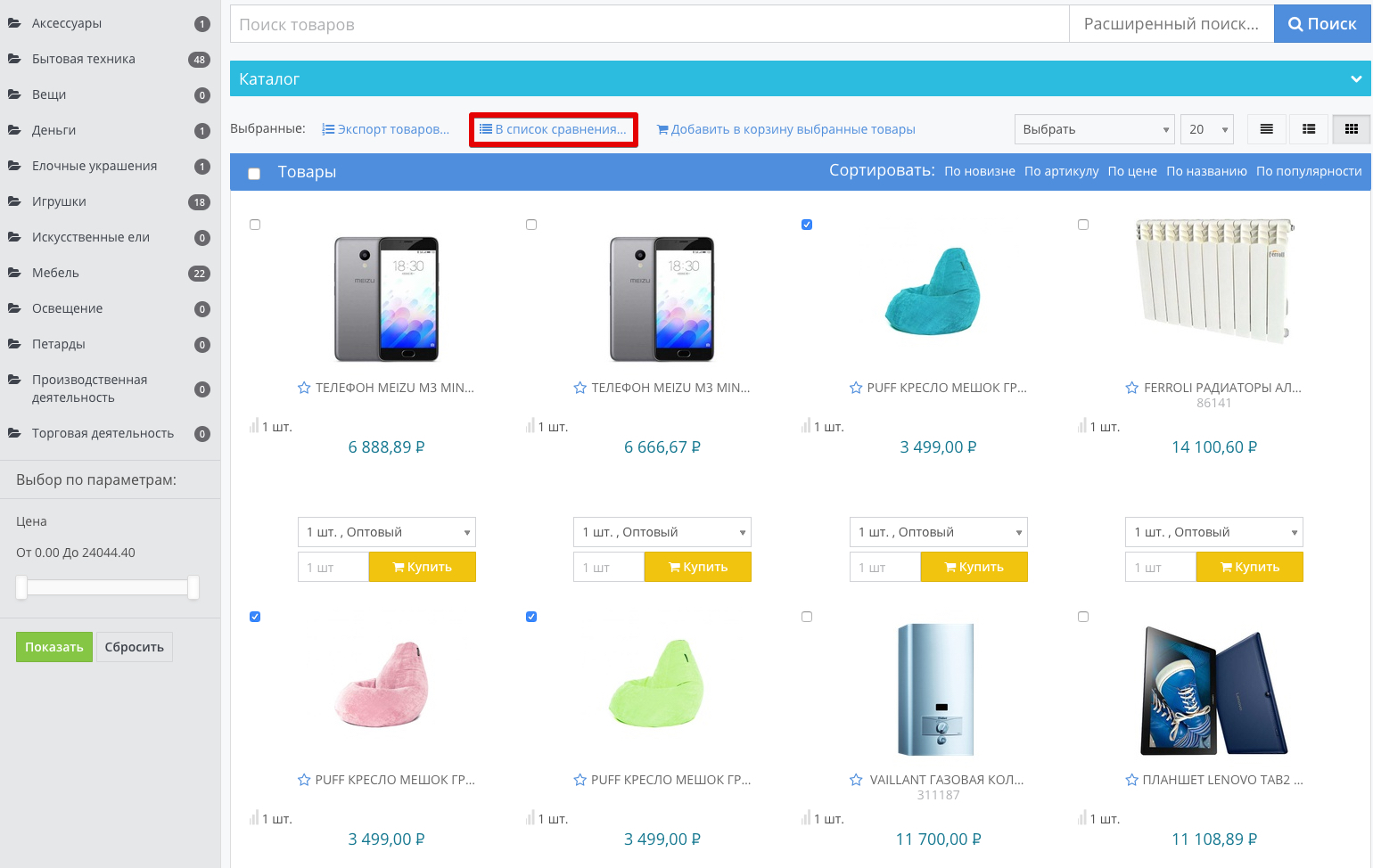 Чтобы добавить товар в список сравнения, нажмите на кнопку В список сравнения . Если вы хотите добавить несколько товаров сразу, можно выбрать товары с помощью чекбоксов, а затем нажать на кнопку В список сравнения наверху. Чтобы перейти в список сравнения, нажмите на значок значок. На странице отобразятся товары, и вы сможете сравнить их характеристики. Ест возможность сравнить как по всем параметрам, так и по различающимся. Также доступно удаление отдельных товаров и очистка всего списка сравнения. |