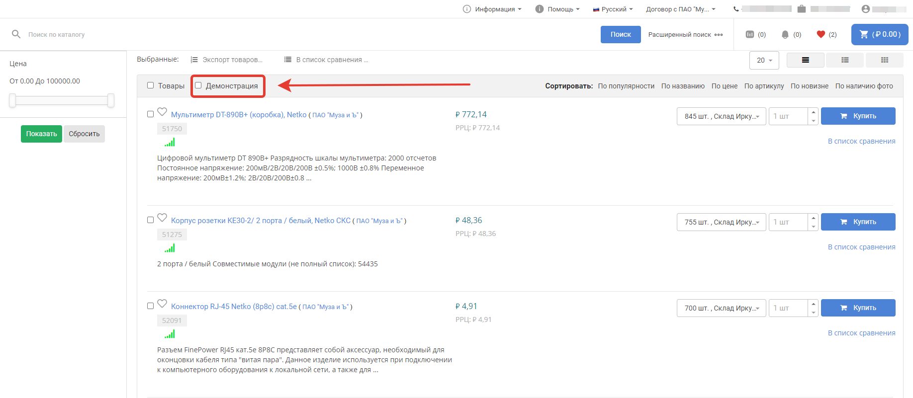 Чтобы включить режим демонстрации в каталоге пользователя, нужно кликнуть по чекбоксу Демонстрация. После его выбора будут скрыты цены. Вид каталога до режима Демонстрации: И после, со скрытыми ценами: |