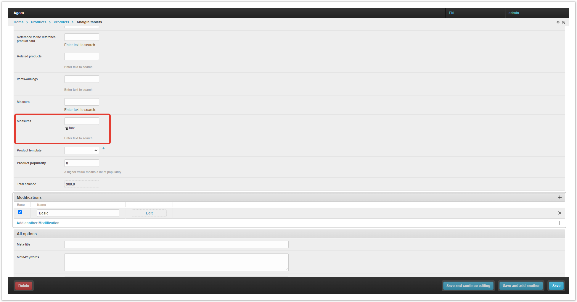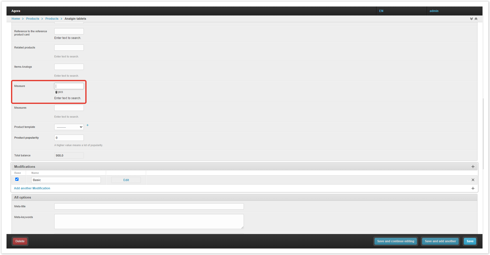 By default, the goods are assigned the basic unit of measure piece (pcs) on the project, because without a unit of measurement, the product will not be displayed in the catalog. If necessary, the base unit of measure can be changed in the «Measure» field in the product card in the project administration panel. In a situation where a product can be sold not only by the piece, but also by larger units, for example, boxes, an additional unit of measure must be added to the product.