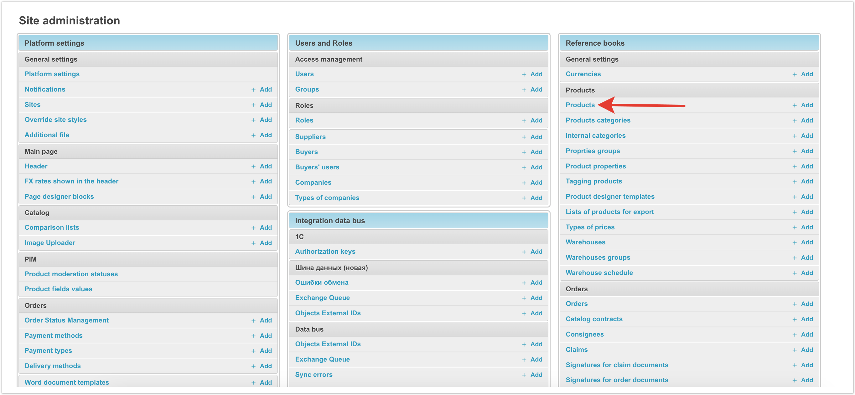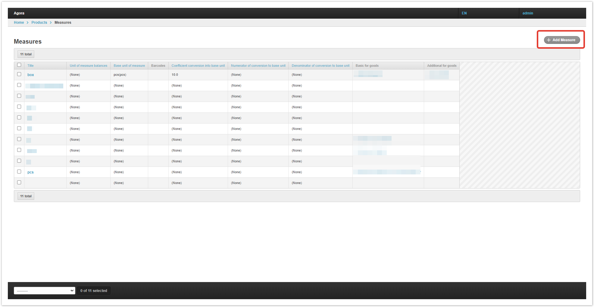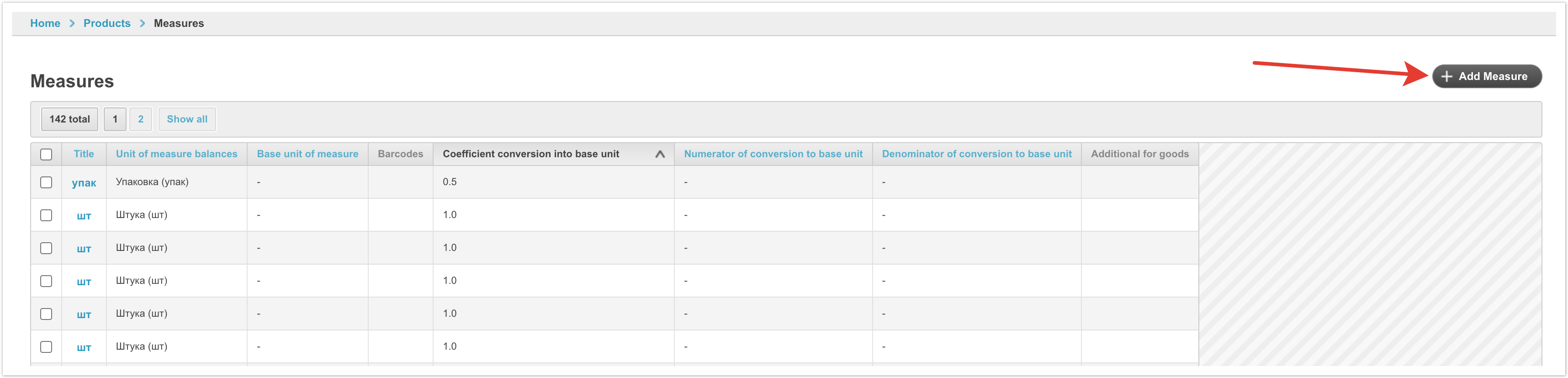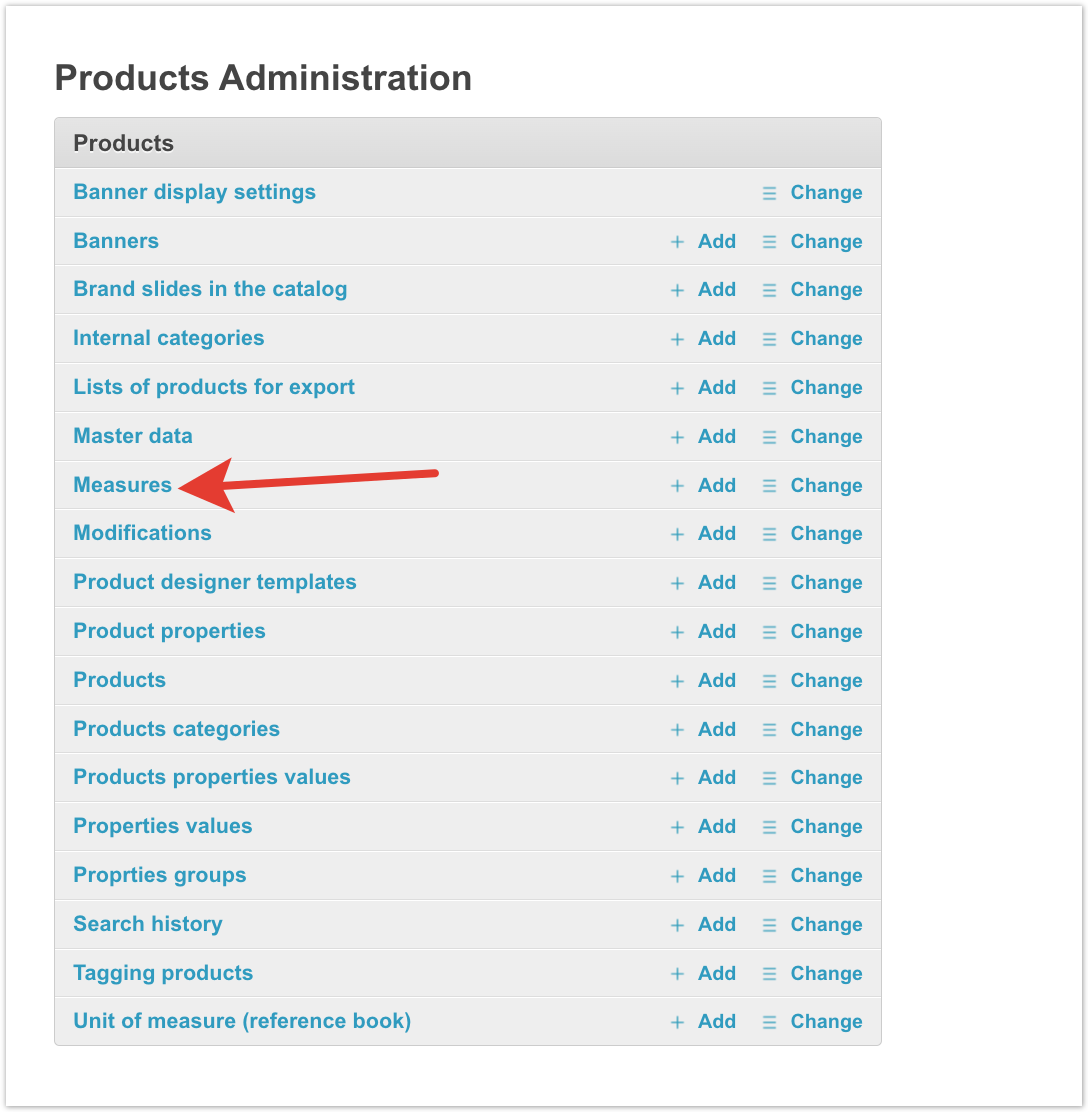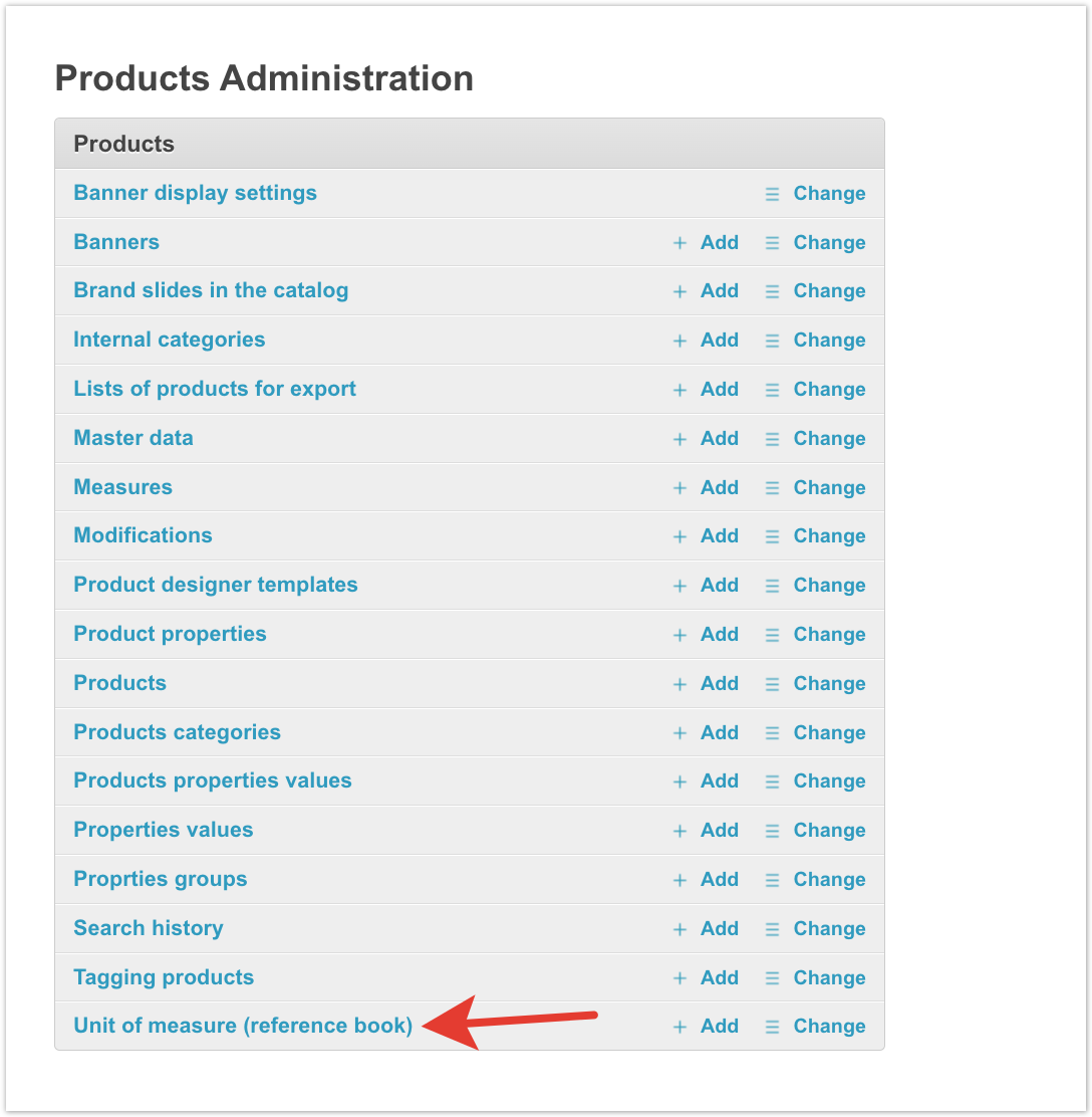 To do this, open the «Products» section in the administrative panel of the project. In the «Products» section, go to the «Products» subsection. In the «Products» subsection, open the «Units of measure (reference book)» section. In the «Unit of measure (reference book)» section, you need to create a new unit of measure for calculating residuals by clicking on the «+Add Unit of measurement (Reference)» button. The name of the unit of measure must be filled in the card. In the «Products» subsection, open the «Measures» section. In the «Measures» section, you need to create a new unit by clicking on the «+ Add Measure» button. For example, the basic unit of measure for a product is a piece, and the additional unit is a box.