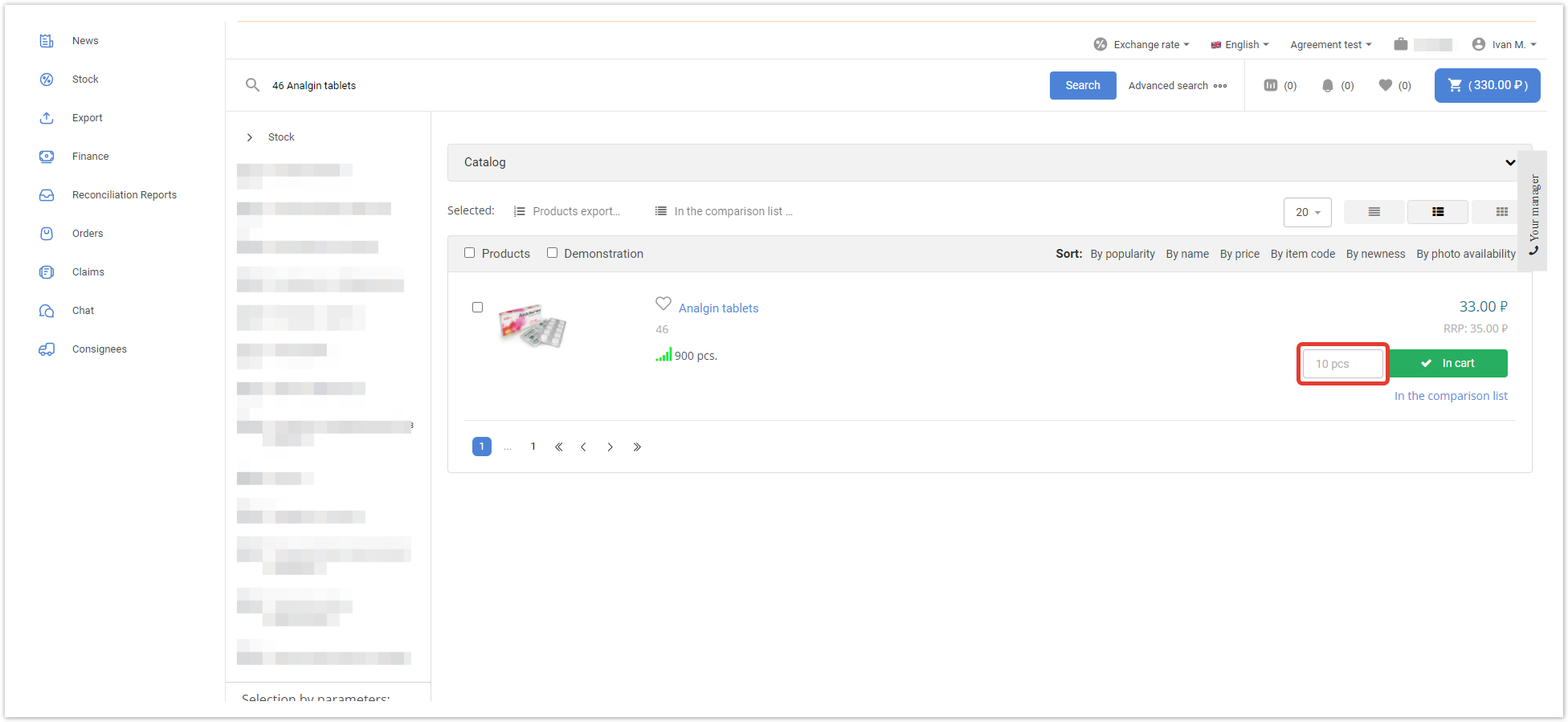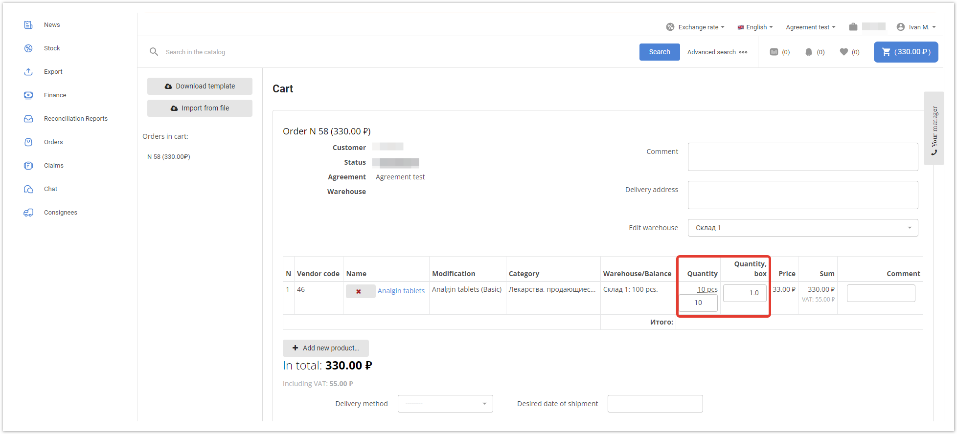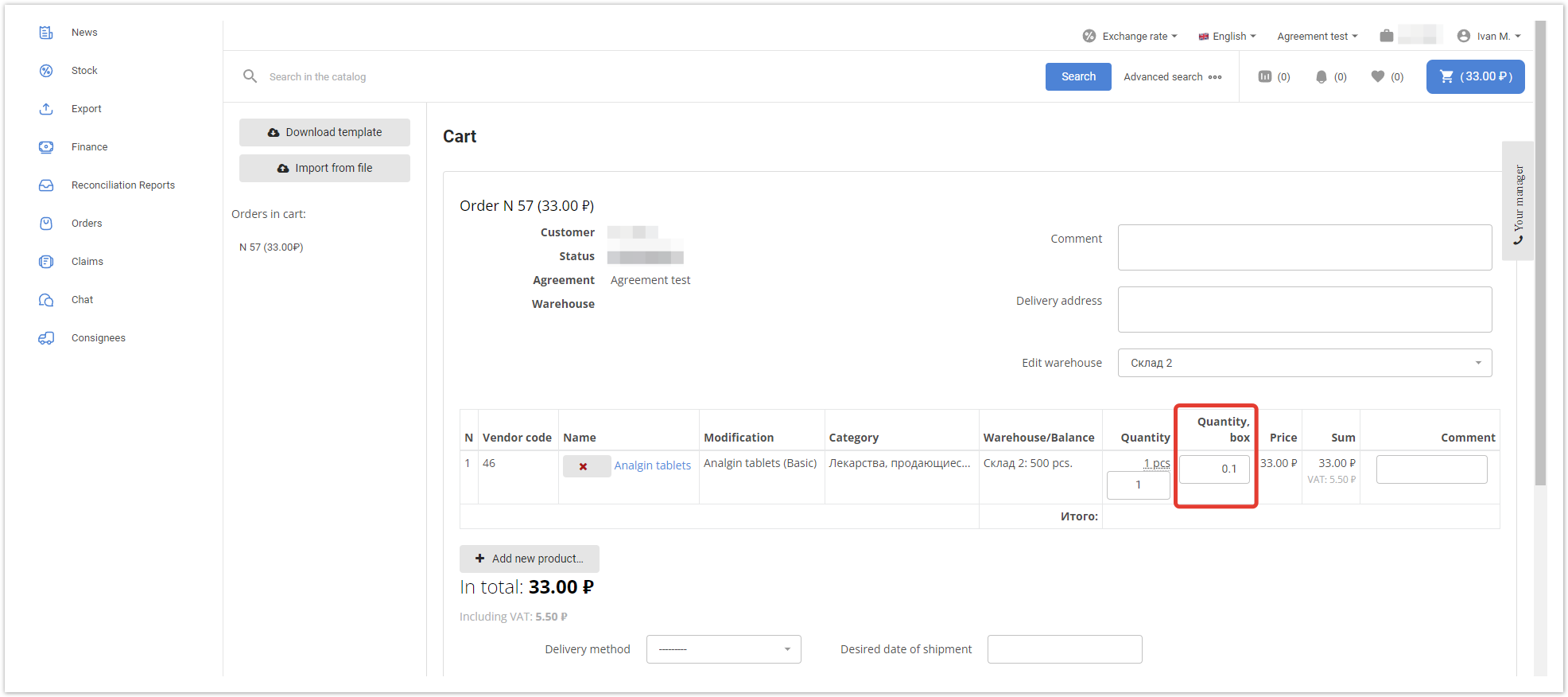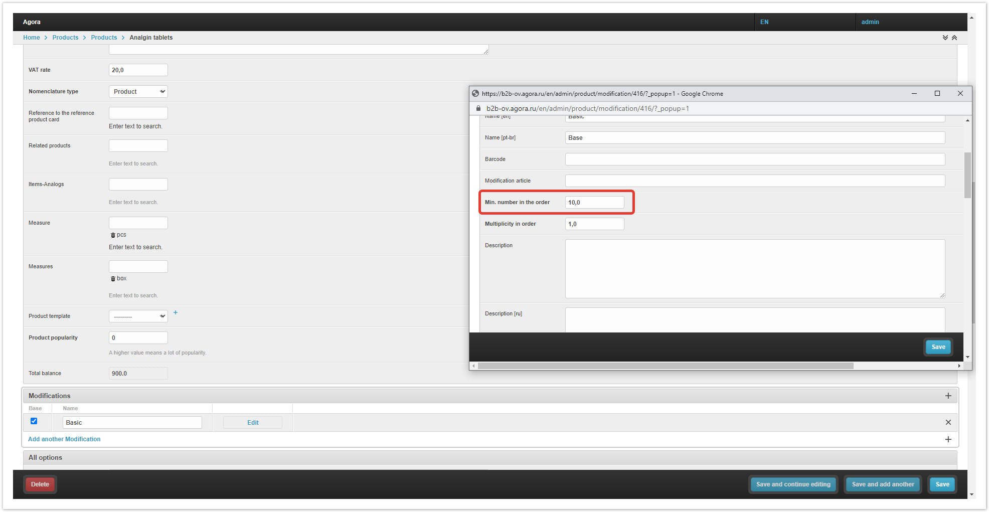 After filling in the fields, save the changes by clicking on the «Save» button. Next, you need to open the product card in the «Products» section and, in the «Measure» field, specify an additional unit of measure - «box». In the buyer's personal account, additional units of measure will be displayed in the shopping cart. There may also be a situation when it is required to sell goods, for example, only in boxes, and not individually. In this case, in the product card in the administrative panel, you must set the value of the quantity of goods in the price, equal to the conversion factor to the base unit of measurement, in the field «Min. number in order». In the catalog, the buyer will be explicitly shown the minimum quantity of goods that he can order. Thus, the buyer will be able to buy only the whole box, but at the same time he will understand that there are 10 pieces of goods in it. |