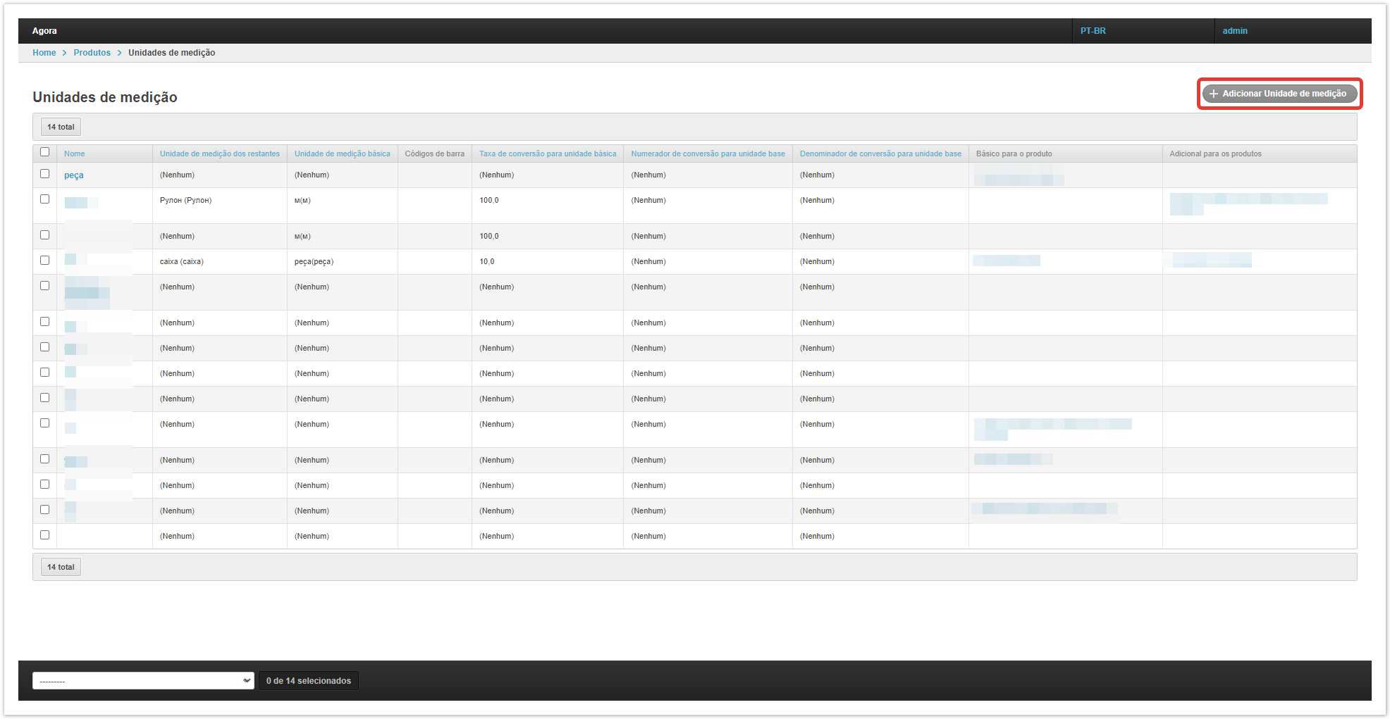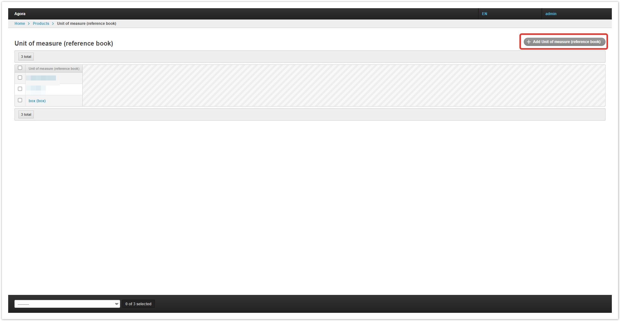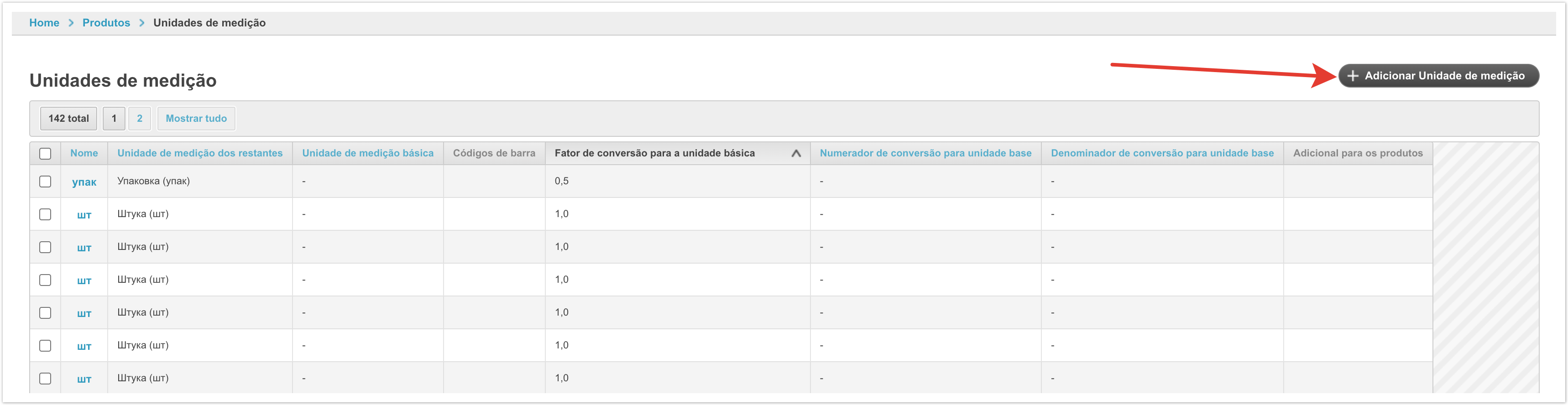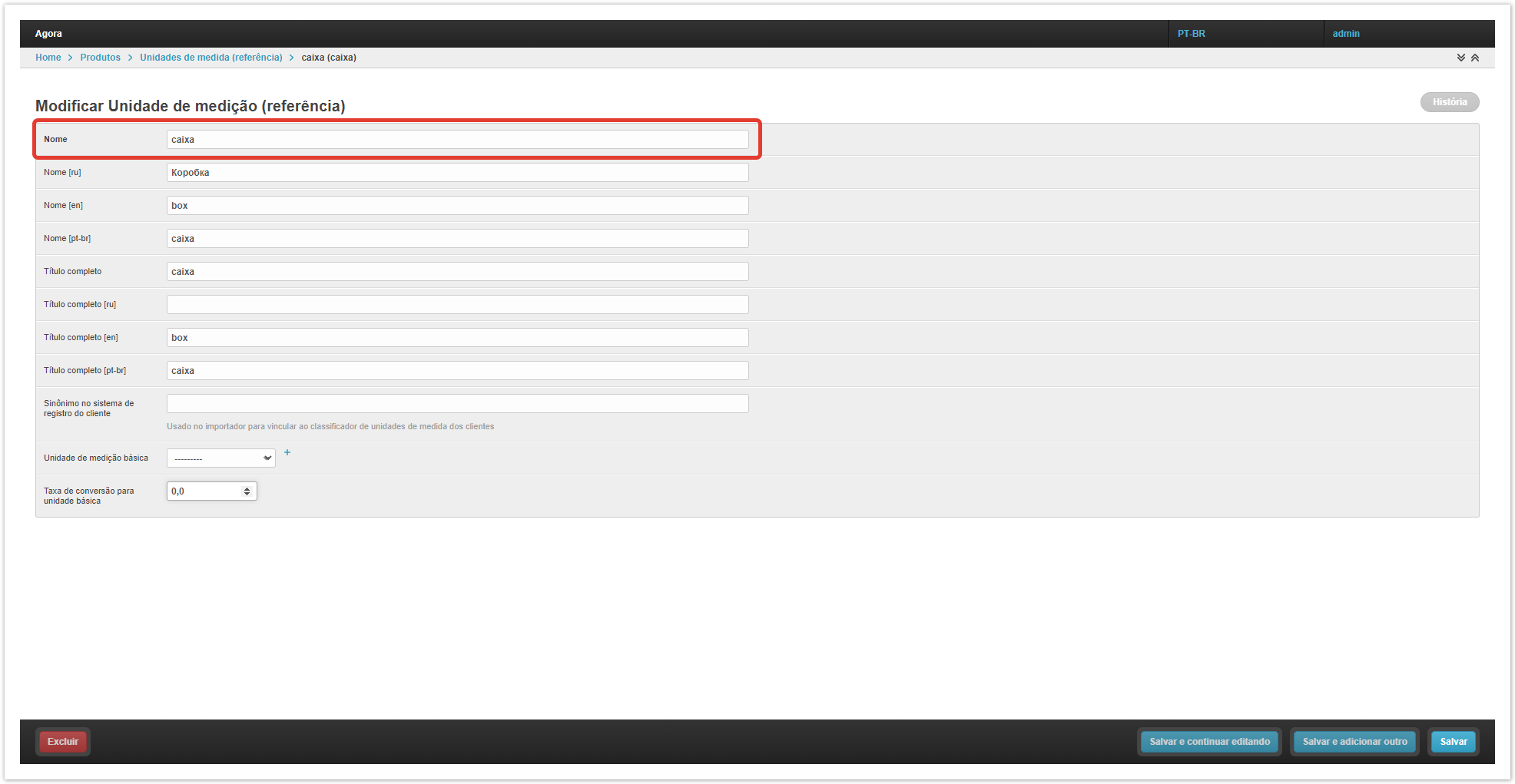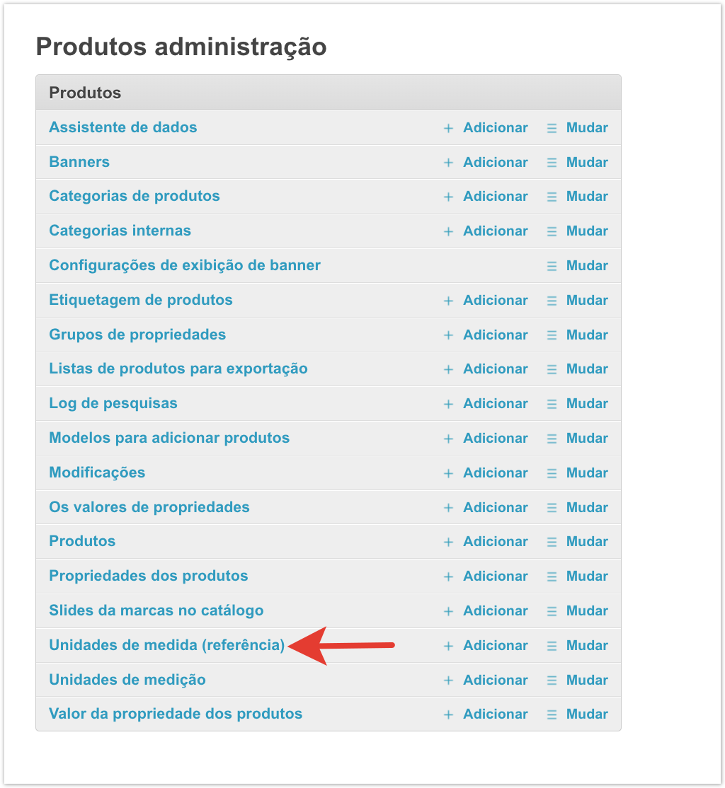 Para isso, abra a secção «Produtos» no painel administrativo do projeto. Na seção «Produtos», vá para a subseção «Produtos». Na subseção «Produtos», abra a seção «Unidades de medida (referência)». Na seção «Unidades de medida (referência)», você precisa criar uma nova unidade de medição para calcular os saldos clicando no botão «+Adicionar Unidade de Medição (referência)». No cartão é necessário preencher o nome da unidade de medição. Na subseção «Produtos», abra a seção «Unidades de medição». Na seção «Unidades de Medição», você precisa criar uma nova unidade clicando no botão «+ Adicionar Unidade de Medição». Por exemplo, a unidade básica de medição da mercadoria é uma peça, a unidade adicional é uma caixa.