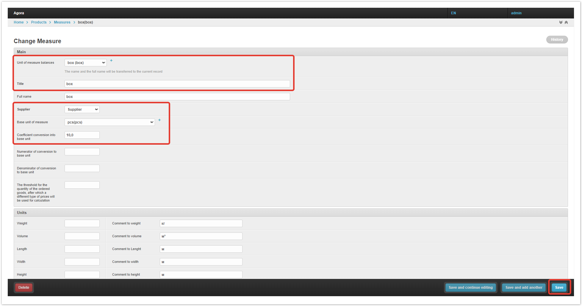 Единицы измерения для товаров Базовая и дополнительная единица измерения товаров устанавливается в карточке товара. В поле Единица измерения введите базовую единицу и, при необходимости, дополнительную — в поле Единицы измерения. Сохраните изменения. В ситуации, когда товар может продаваться не только поштучно, но и, например, коробками, требуется добавить дополнительную единицу измерения.