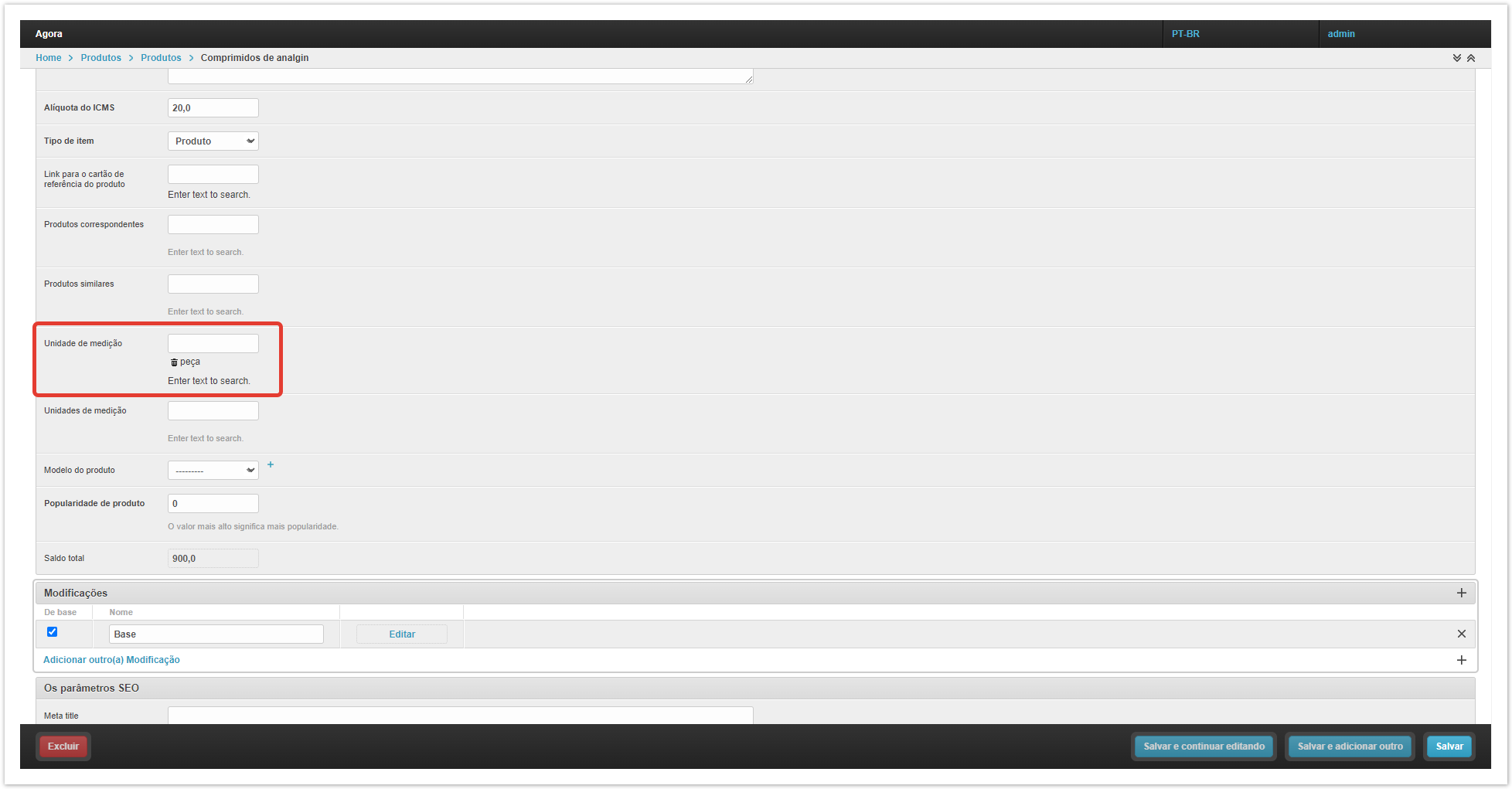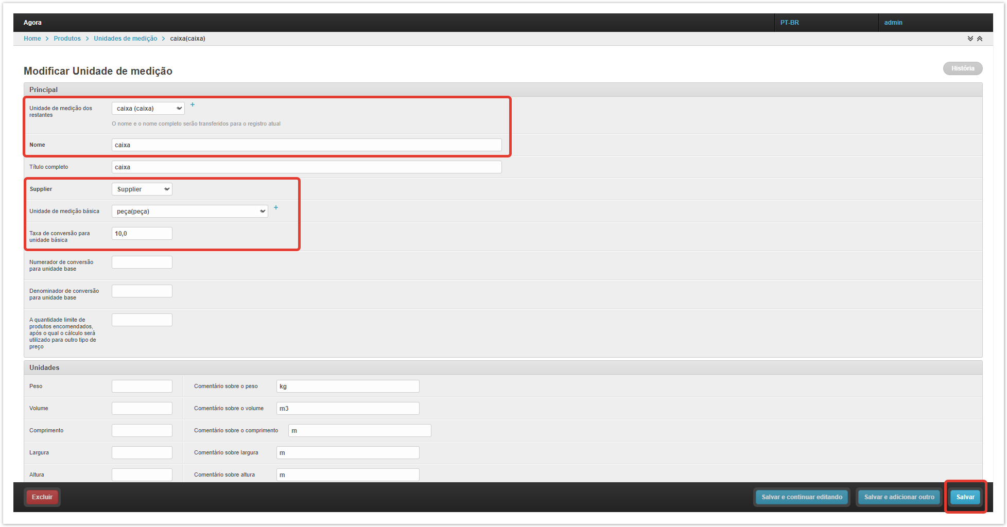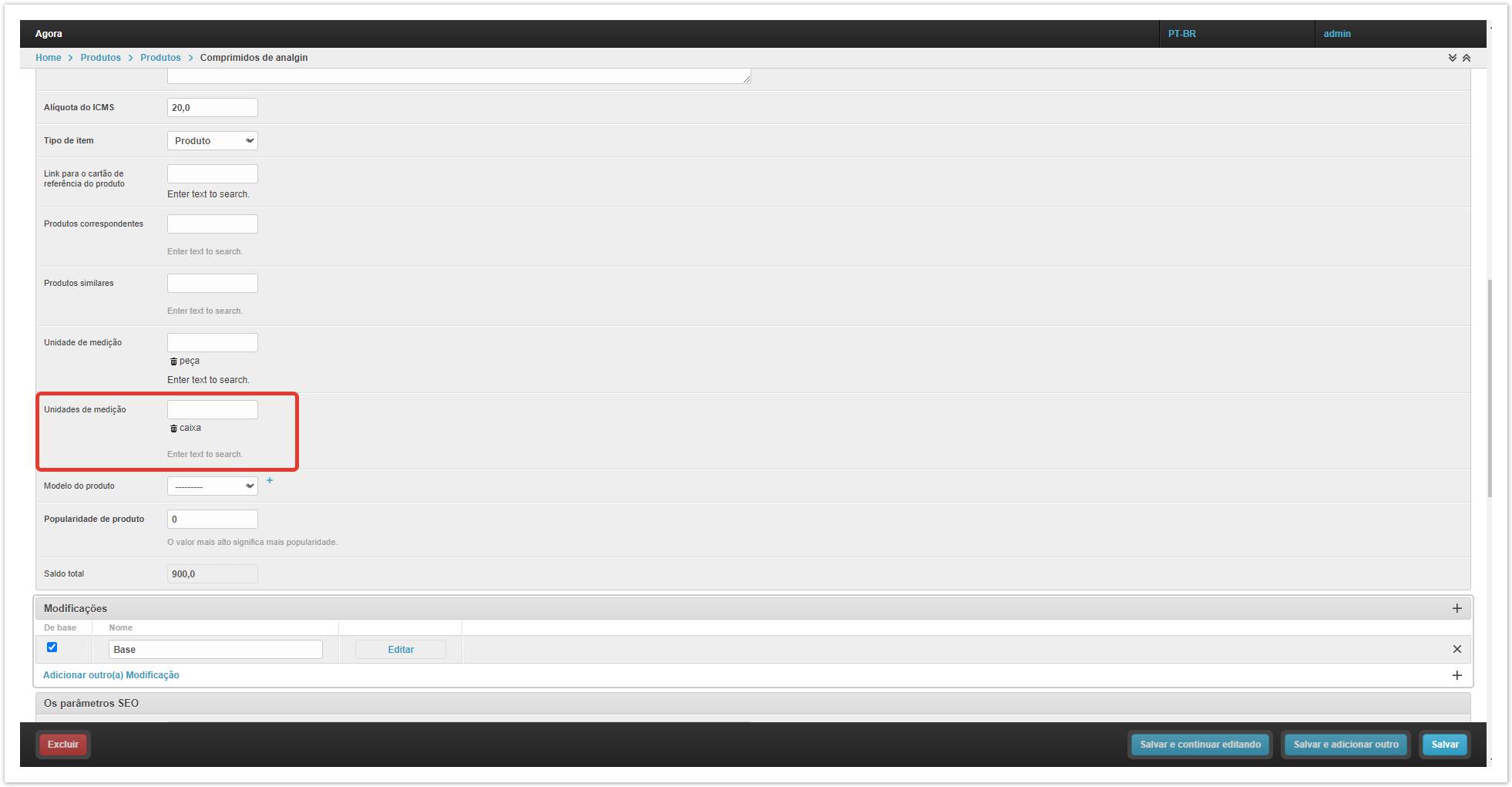 Por padrão, no projeto, as mercadorias são atribuídas à unidade básica de medição da peça (peça), pois sem uma unidade de medição, o produto não será exibido no catálogo. Se necessário, você pode alterar a unidade base de medição no campo «Unidade de medição» no cartão do produto no painel de administração do projeto. Em uma situação em que o produto pode ser vendido não apenas individualmente, mas também em unidades maiores, por exemplo, caixas, é necessário adicionar uma unidade adicional de medição ao produto.