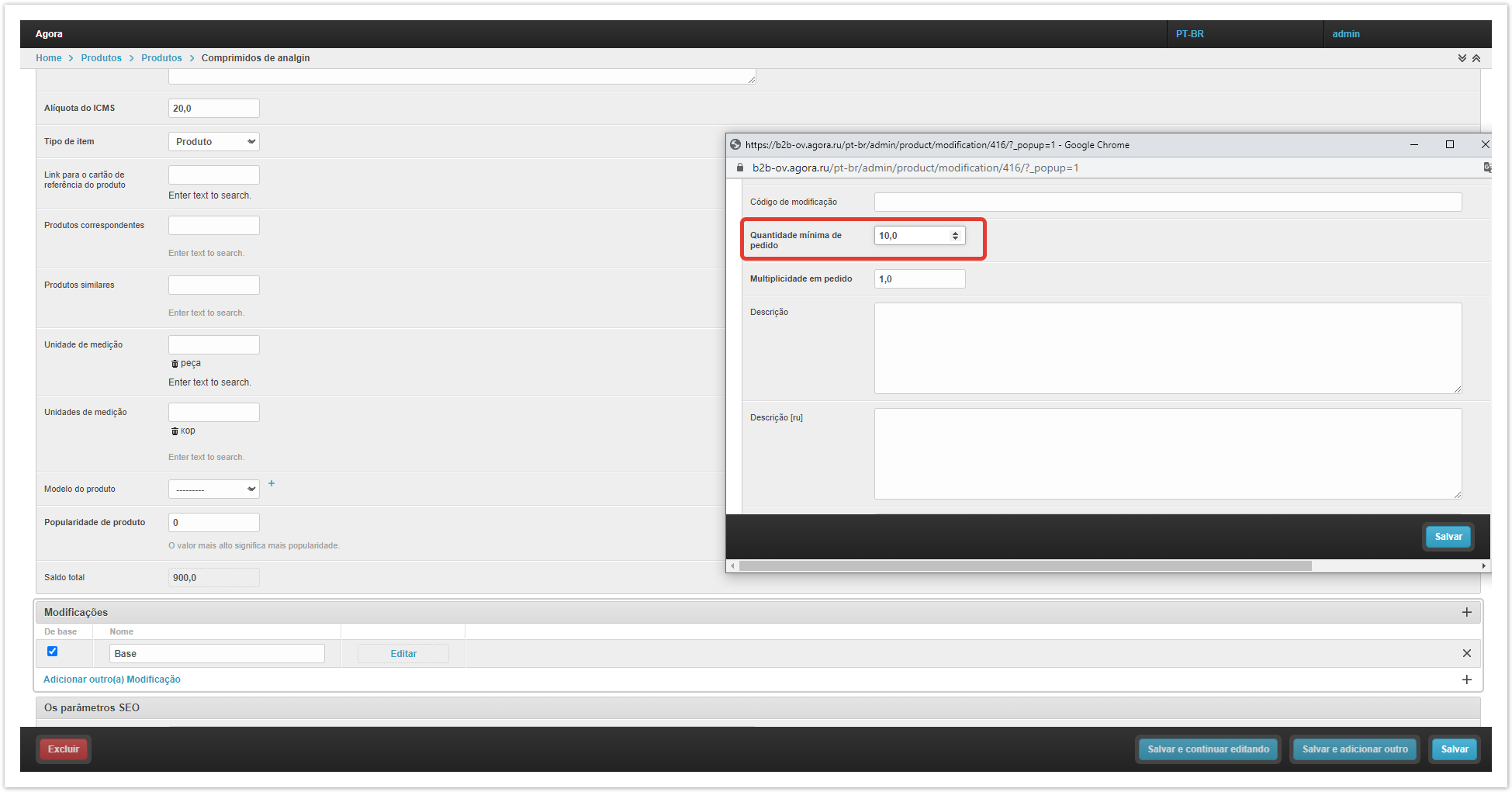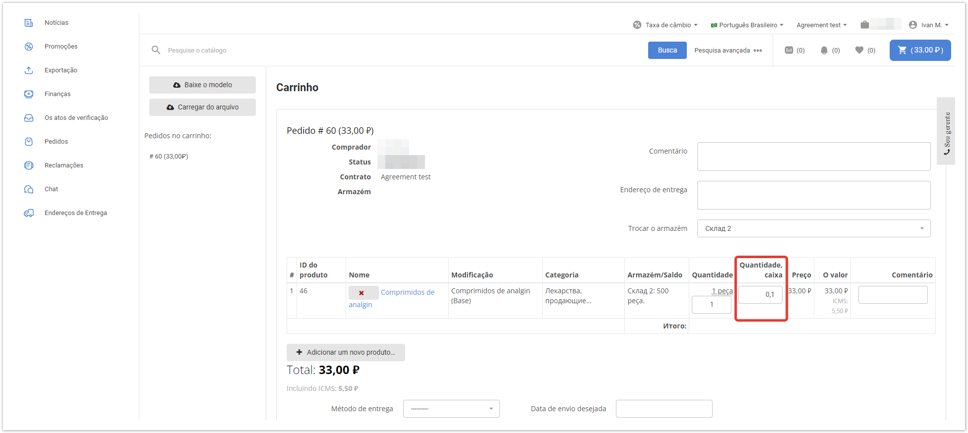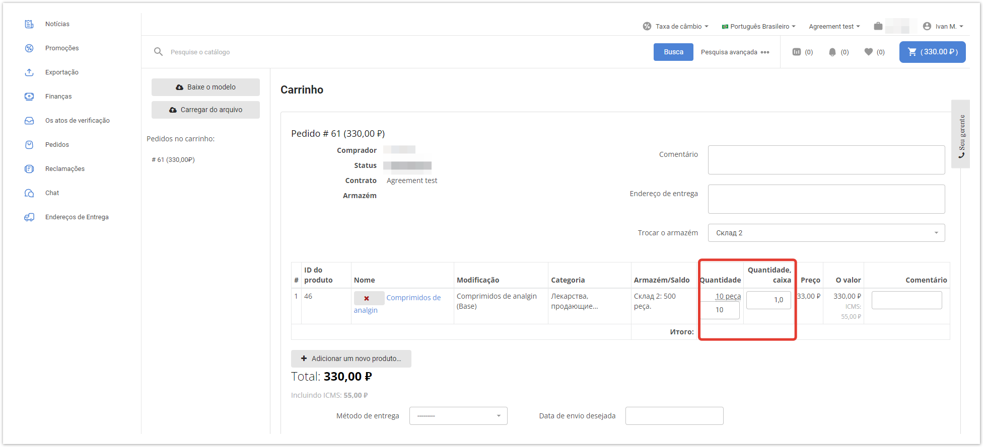 Em seguida, você precisa abrir o cartão do produto na seção «Produtos» e, no campo «Unidades de medição», especificar uma unidade adicional de medição - «caixa». Na conta pessoal do comprador, unidades adicionais de medição serão exibidas no carrinho de compras. Também pode haver uma situação em que é necessário vender mercadorias, por exemplo, apenas em caixas, e não individualmente. Neste caso, no cartão do produto no painel administrativo, é necessário especificar o valor da quantidade mínima de mercadorias na ordem, igual ao fator de conversão à unidade básica de medição, no campo «Quantidade mínima de pedido». No catálogo, o comprador será explicitamente mostrado a quantidade mínima de mercadorias que ele pode encomendar. Assim, o comprador poderá comprar apenas uma caixa inteira, mas ao mesmo tempo ele entenderá que há 10 peças de mercadorias nela. |
