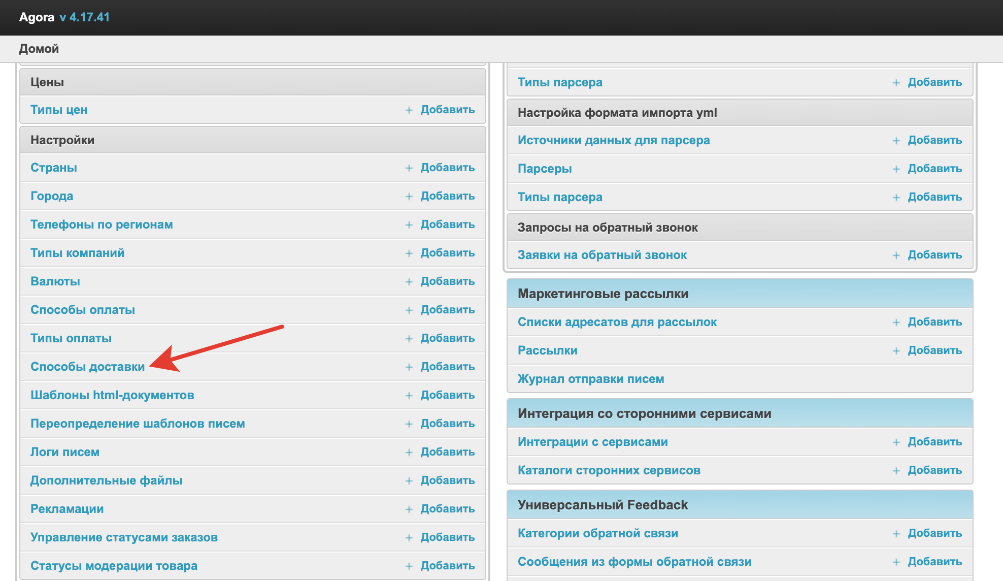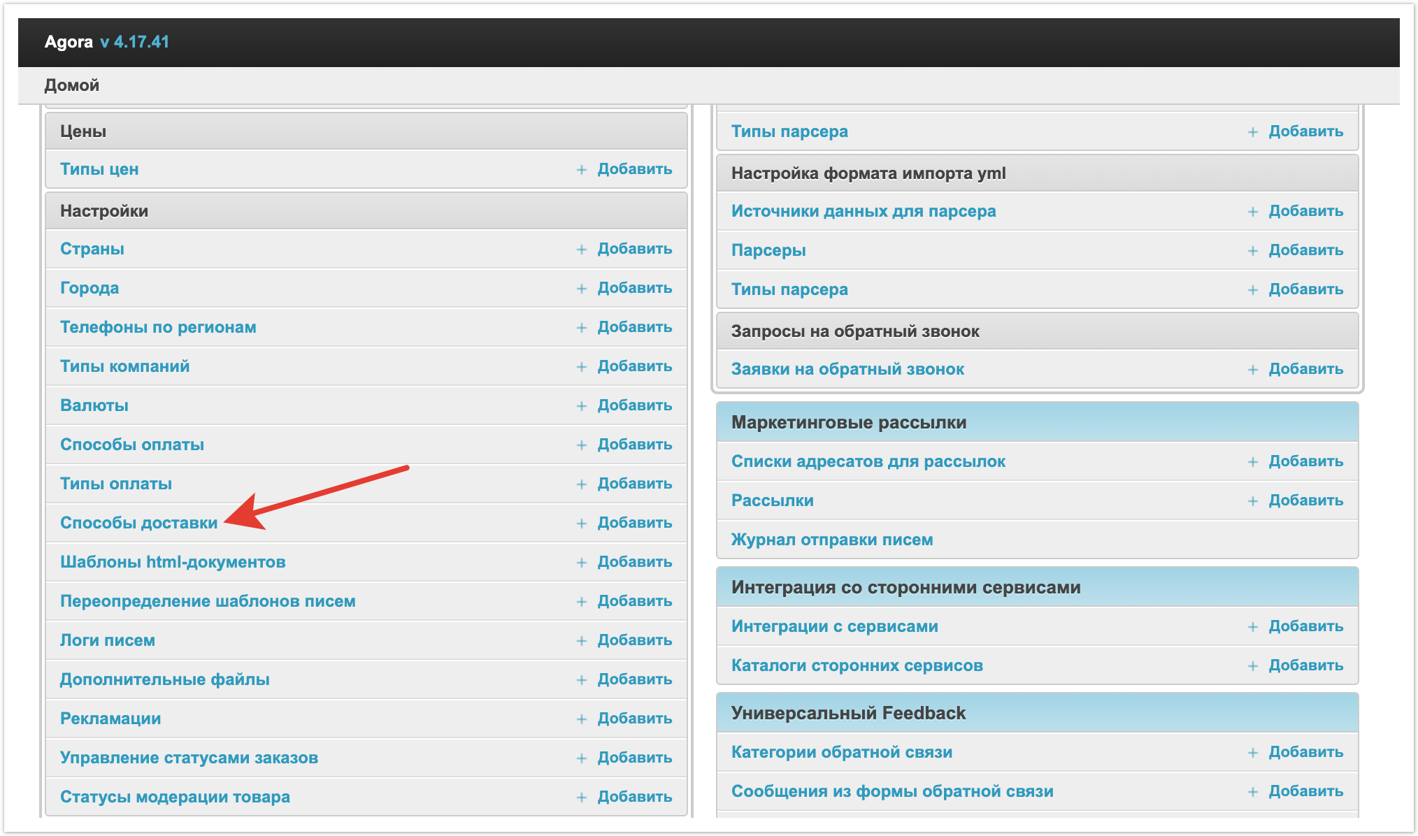 Выбор способа доставки в корзине покупателяЕсли на проекте используется несколько способов доставки и их выбор доступен для покупателя, то поле выбора будет отображаться в корзине при оформлении заказа. Далее рассмотрим процесс настройки способов доставки. Добавление способа доставкиДля настройки Способов доставки есть отдельный раздел в панели администратора. Внутри раздела можно увидеть заведенные ранее способы доставки и их статус. Столбец Активный позволяет понять, какие способы доставки на данный момент используются на платформе при оформлении заказа. Столбец По-умолчанию обозначает, какой из способов доставки будет выбираться в корзине по умолчанию. Если нужно удалить какой-либо способ доставки, то достаточно его выделить, а затем слева внизу в раскрывающемся списке выбрать Удалить выбранные способы доставки. Также на странице есть кнопка Добавить Способ доставки для заведение нового способа доставки. После нажатия на нее откроется форма добавления. Здесь нужно заполнить Название. Оно будет выводится покупателю при оформлении заказа. Название можно указывать на разных языках для платформ с использованием мультиязычности. ПолеGateway обязательно к заполнению. В нем есть 4 значения: Без доставки, СДЭК, Катапульта и Другое. Варианты СДЭК и Катапульта используются для настройки интеграции с сервисами расчета доставки. Вариант Без доставки используется для самовывоза. Если ни один из описанных вариантов не подходит, то можно выбрать значение Другое. Ниже выводится поле для указания Описания также на нескольких языках, если подключена мультиязычность. Описание может использоваться для дополнительных пояснений. Затем проверяем включение настройки Активный, чтобы этот способ доставки можно было использовать для оформления заказа. Также можно включить настройку По умолчанию, тогда этот способ доставки будет подставляться по умолчанию при оформлении заказа. Для корректной работы лучше выбрать один способ доставки по умолчанию. После того, как все необходимые данные были заполнены нужно нажать на кнопку Сохранить и способ доставки будет добавлен. Добавление стоимости доставки поставщикомПри настройке способа доставки также есть настройка Добавление стоимости доставки поставщиком. Эта настройка позволяет поставщику самостоятельно добавить стоимость доставки к заказу. Для того, чтобы функционал заработал в настройках поставщика в панели администратора нужно также включить настройку Добавление стоимости доставки. После включения этих настроек в личном кабинете поставщика в карточке заказа появится отдельное поле для указания стоимости доставки по каждой отдельной позиции. Стоимость доставки будет добавлена к сумме заказа, и покупатель ее увидит и сможет оплатить. Этот функционал позволяет добавить стоимость доставки к сумме заказа и сделать более удобной оплату для покупателя. Интеграция с сервисами логистикиДля способов доставки есть готовые интеграции со СДЭК и с Катапультой. При необходимости в качестве индивидуального решения можно настроить интеграции и с другими сервисами логистики. Интеграция со СДЭК работает таким образом, что после оформления заказа покупателя будет перенаправлять на страницу сервиса СДЭК для оформления доставки. Интеграция с Catapulto работает схожим образом. После офо