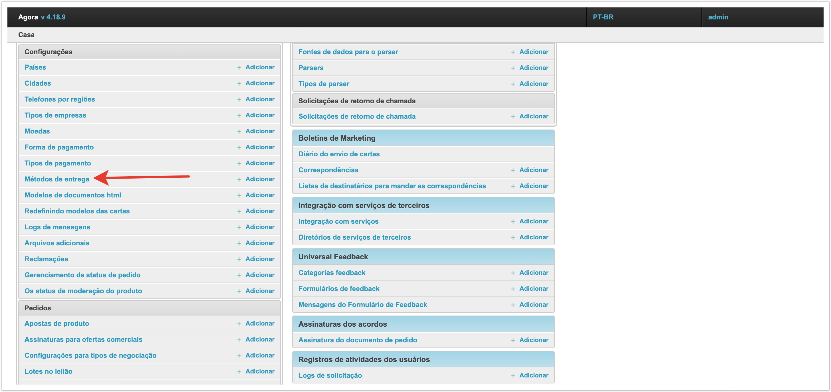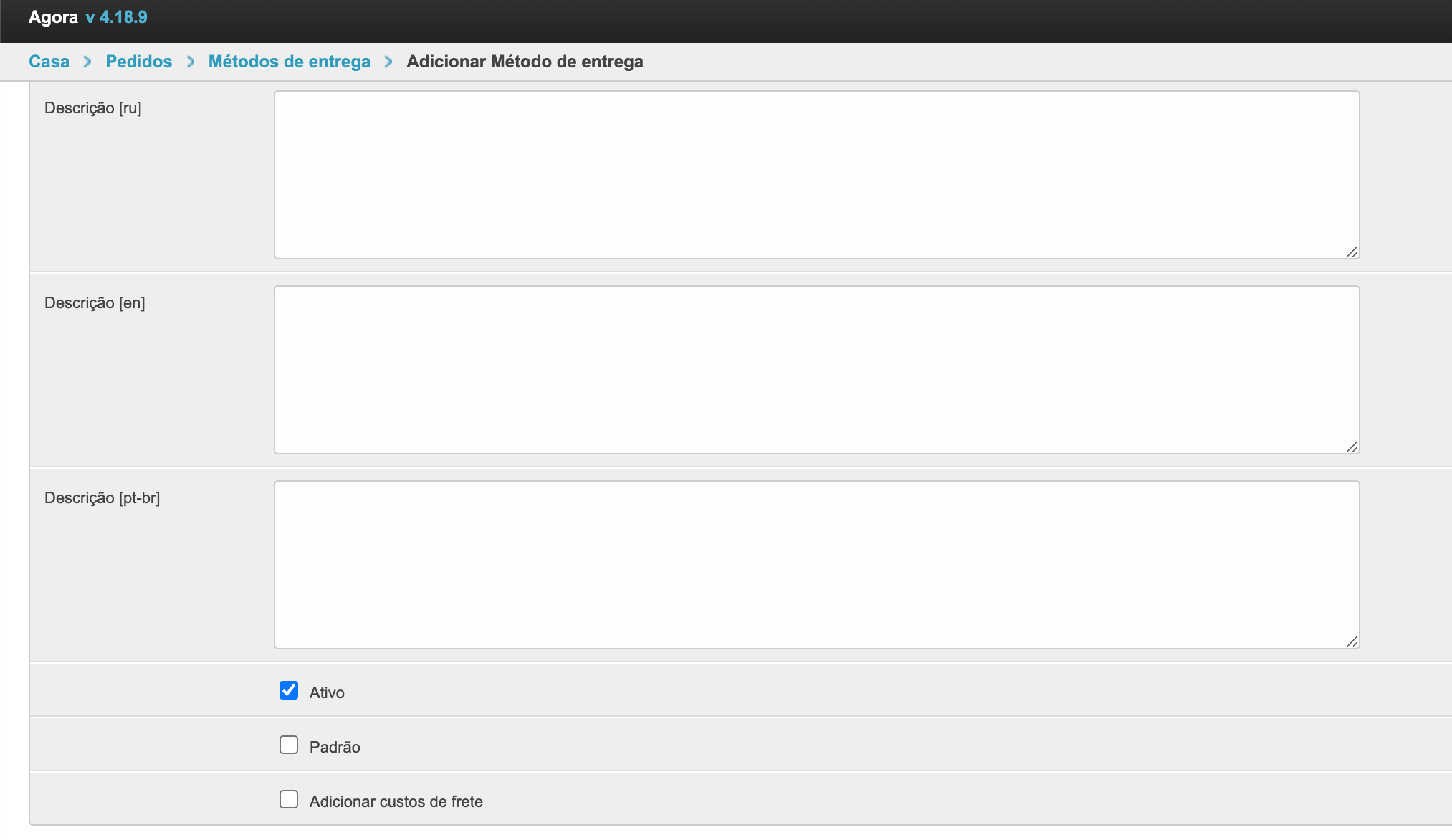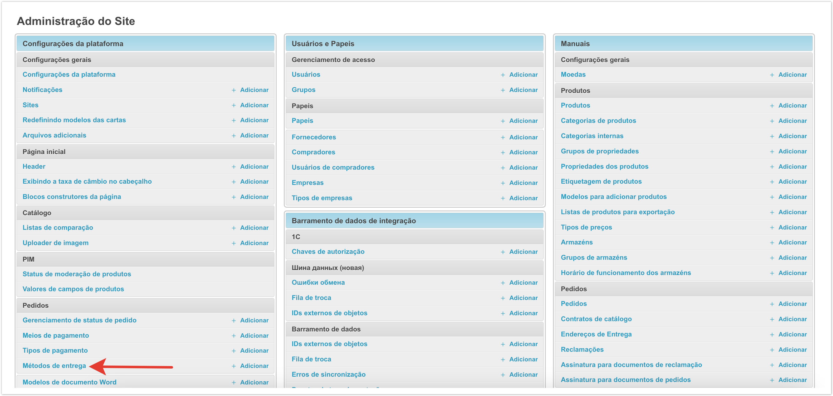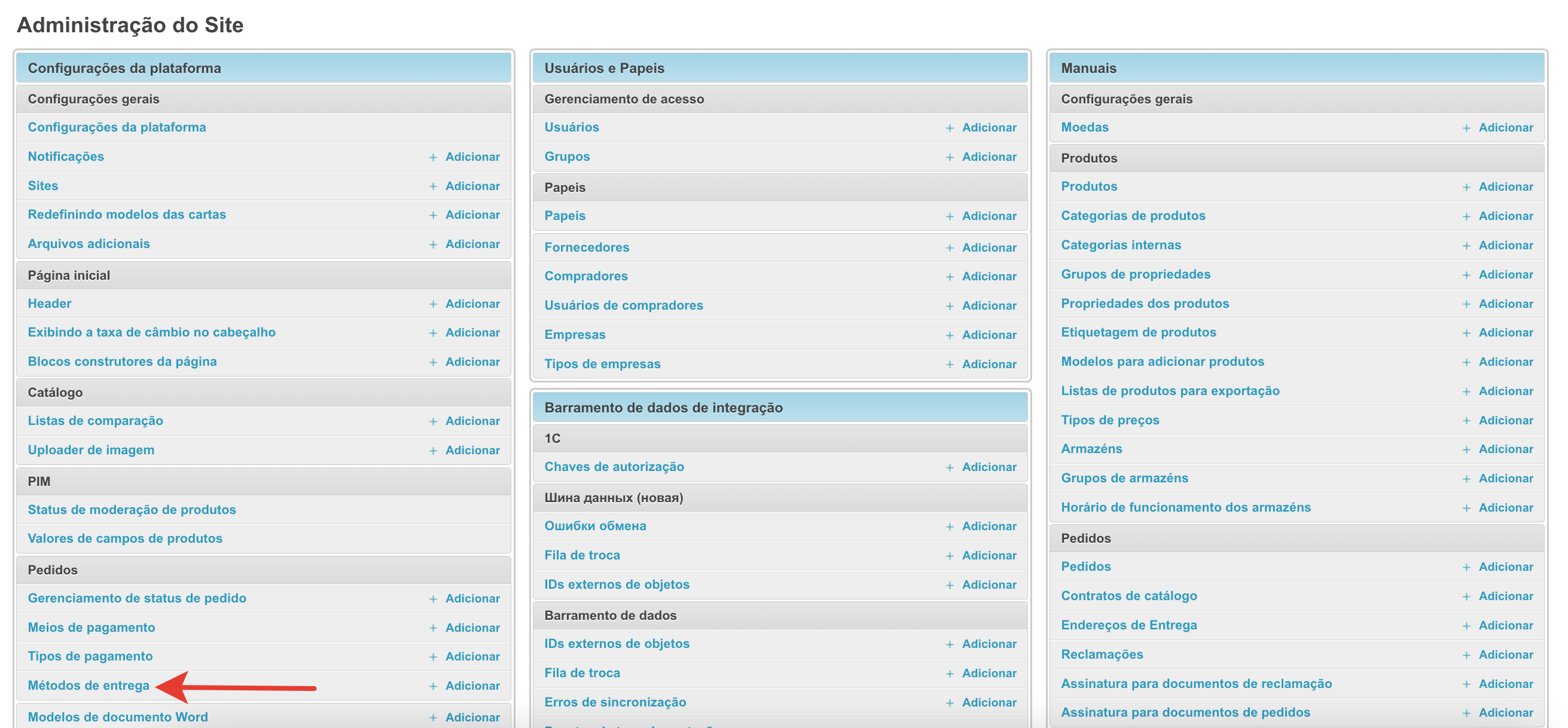 Escolher um método de entrega no carrinho de comprasSe o projeto usar vários métodos de entrega e sua seleção estiver disponível para o comprador, o campo de seleção será exibido no carrinho no checkout. Em seguida, vamos olhar para o processo de configuração de métodos de entrega. Adicione um método de envioPara configurar os métodos de entrega, há uma seção separada no painel de administração. Dentro da seção você pode ver os métodos de entrega previamente estabelecidos e seu status. A coluna Active permite entender quais métodos de entrega são usados atualmente na plataforma ao fazer um pedido. A coluna Padrão indica qual método de envio será selecionado na lixeira por padrão. Se você quiser remover um método de envio, basta selecioná-lo e, em seguida, selecionar Remover métodos de envio selecionados da parte inferior esquerda da lista de retirada. Também na página há um botão Adicionar método de entrega para o estabelecimento de um novo método de entrega. Depois de clicar nele, o formulário de ação será aberto. Aqui você precisa preencher o Nome. Ele será exibido ao comprador no checkout. O nome pode ser especificado em diferentes idiomas para plataformas usando o multilinguismo. O campo Gateway é necessário. Tem 4 significados: Sem Entrega (retirada do local), SDEC, Catapulta e Outros. As variantes SDEC e Catapulta são usadas para configurar a integração com serviços de cálculo de entrega. A opção Sem entrega é usada para coleta. Se nenhuma dessas opções for adequada, você pode selecionar Outras. Abaixo está um campo para especificar descrições também em vários idiomas, se multilíngue estiver ativado. A descrição pode ser usada para explicações adicionais. Em seguida, verifique se a configuração Active está ativada para que este método de envio possa ser usado para fazer seu pedido. Você também pode ativar a configuração Padrão, então este método de envio será substituído por padrão no checkout. Para uma operação correta, é melhor escolher um método de entrega padrão. Depois que todos os dados necessários foram preenchidos, você precisa clicar no botão Salvar e o método de entrega será adicionado. Adicionar custos de envio ao fornecedorQuando você configura um método de envio, há também uma Adicionar custos de frete. Esta configuração permite que o fornecedor adicione o custo de envio ao pedido. Para que a funcionalidade funcione nas configurações do provedor no painel administrativo, você também deve habilitar a configuração Adicionando custos de envio. Depois de habilitar essas configurações na conta pessoal do fornecedor, um campo separado aparecerá no cartão de pedido para indicar o custo de entrega de cada item individual. O custo da entrega será adicionado ao valor do pedido, e o comprador irá vê-lo e poderá pagar. Essa funcionalidade permite adicionar o custo de entrega ao valor do pedido e tornar o pagamento mais conveniente para o comprador. Integração com serviços logísticosPara métodos de entrega há integrações prontas com o SDEС e com Сatapulta. Se necessário, integrações com outros serviços logísticos podem ser configuradas como uma solução individual. A integração com o SDEС funciona de tal forma que, após fazer um pedido, o comprador será redirecionado para a página de serviços SDEС para entrega. A integração com Сatapulta funciona de forma semelhante. Após a ção, o comprador será apresentado um formulário de cálculo de entrega, onde será necessário preencher o endereço de envio e recebimento, bem como o tipo de remessa. Em seguida, os parâmetros por tamanho, peso e configurações adicionais são preenchidos. Depois de clicar no botão de cálculo, todas as opções de entrega disponíveis e seu custo serão oferecidos. Você pode escolher qualquer opção que quiser. O trabalho de Catapulta é descrito com mais detalhes na página.