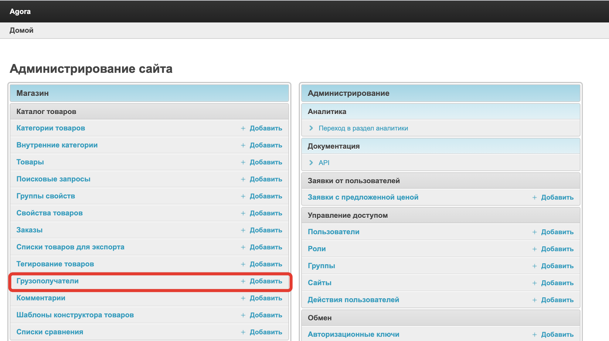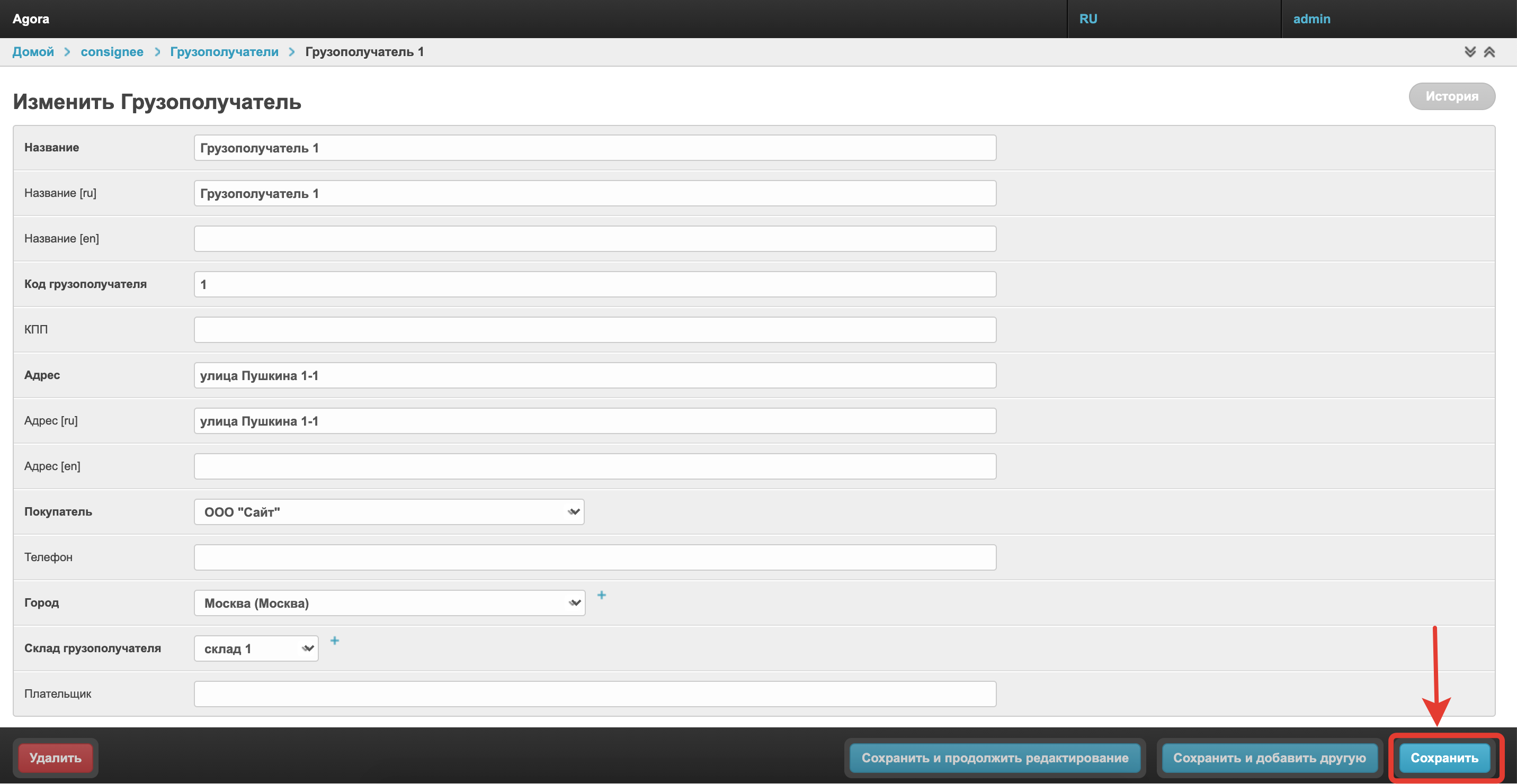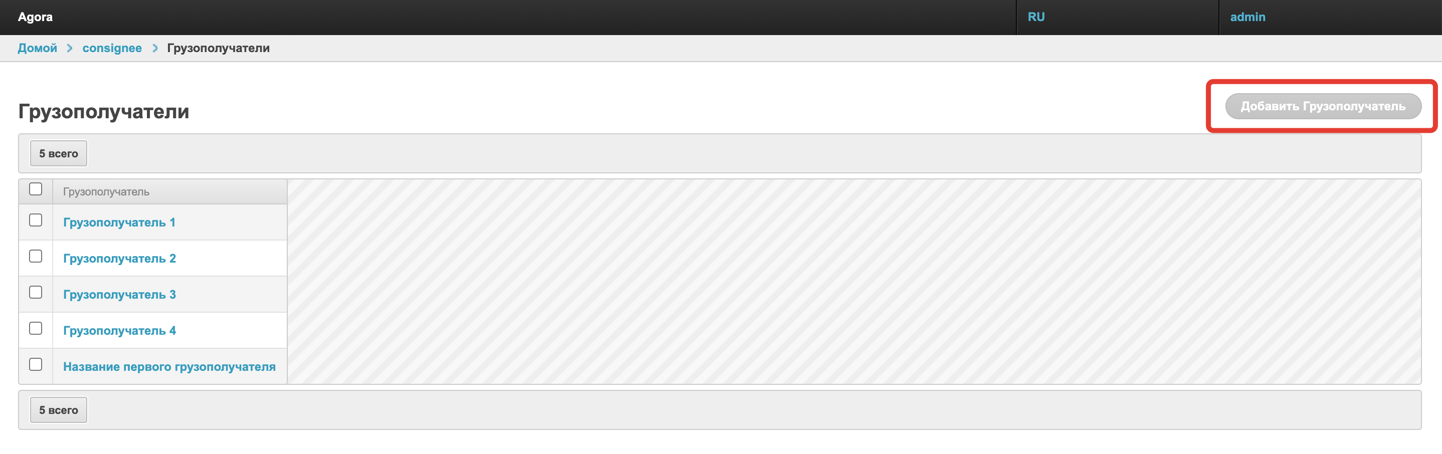 Шаблоны с реквизитами доставки могут заводиться в административной панели или личном кабинете покупателя. Впоследствии, при оформлении заказа в личном кабинете, в разделе Грузополучатели можно выбрать ранее созданные шаблоны. НастройкаПодробнее про грузополучателей рассказано в административной панелиДля того чтобы создать шаблон с реквизитами, в административной панели, расположенной по адресу название_проекта.agora.ru, выберите раздел Грузополучатели: При переходе непосредственно в раздел есть возможность посмотреть все созданные на портале шаблоны грузополучателей или добавить нового грузополучателя с помощью кнопки Добавить Грузополучатель: При переходе непосредственно в шаблон есть возможность редактировать реквизиты (название грузополучателя, адрес, телефон, склад и проч.). видео: