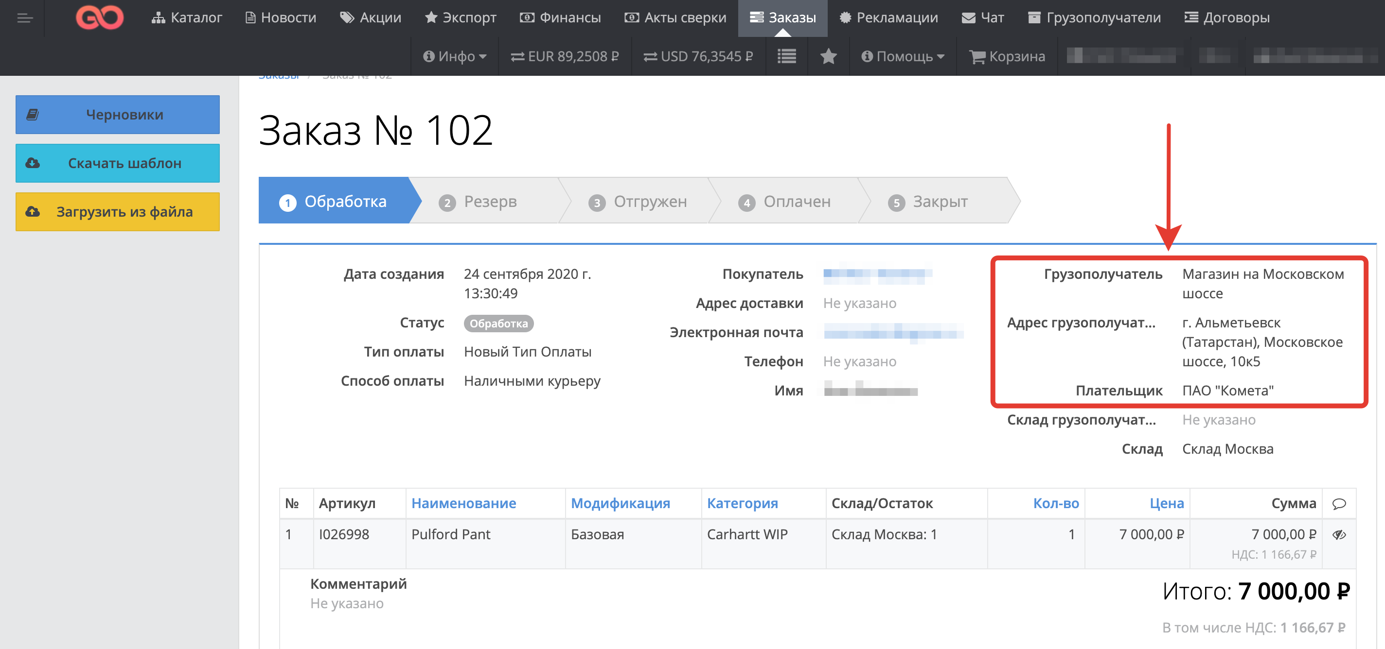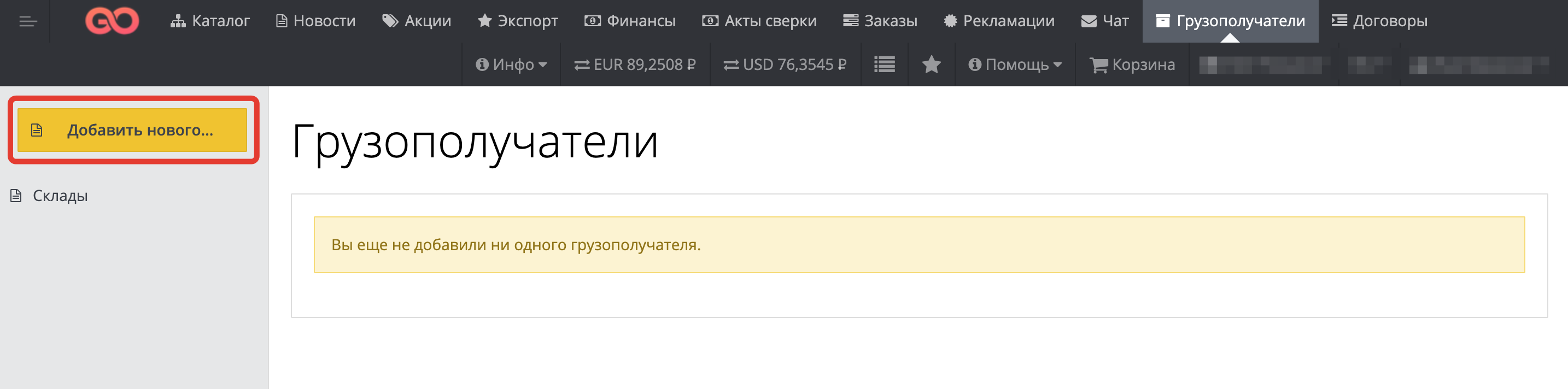 The section is available at the top of the page along with all the main sections of the personal account:In this section, the customer has the opportunity to create a new template with details. This can be done by clicking on the "Add new ..." button:Then fill in all the details and click on the "Save" button: Templates with delivery details can be created in the administrative panel or in the buyer's personal account. Subsequently, when placing an order in your personal account, in the Consignees section, you can select previously created templates. Setting up consignees in your personal accountIn the buyer's personal account located at project_name.agora.ru, work with the Consignees section is structured as follows: In the panel on the right, click on the icon . After opening the Consignees section, click the Add new button: Next, you need to fill in all the details (name, city, address, etc.) and click on the Save button: Adding a consignee is also possible through the admin panel. This process is described on a separate page. Application of the created templates at checkoutAll consignees of the buyer The use of the created templates is possible when placing an order. All consignees of the customerwill be available in the drop-down list to be able to select the required template: The completed order will also display information about the consignee: |