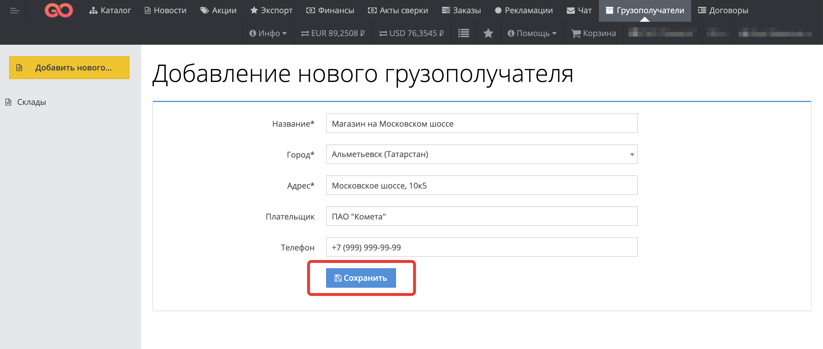 In the administrative panel, the Consignees section is available in the Shop - Product catalog section:When you go directly to the section, you can see all the templates of consignees created on the portal, or add a new consignee using the "Add Consignee" button: When you go directly to the template, you can edit the details. To save the changes made, you must click the "Save" button at the bottom of the page: In the customer's personal account, work with the Consignees section is structured as follows: