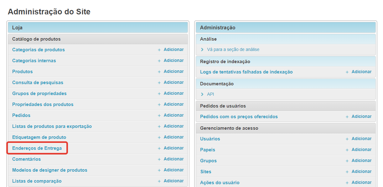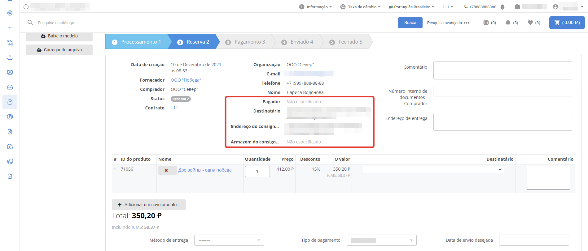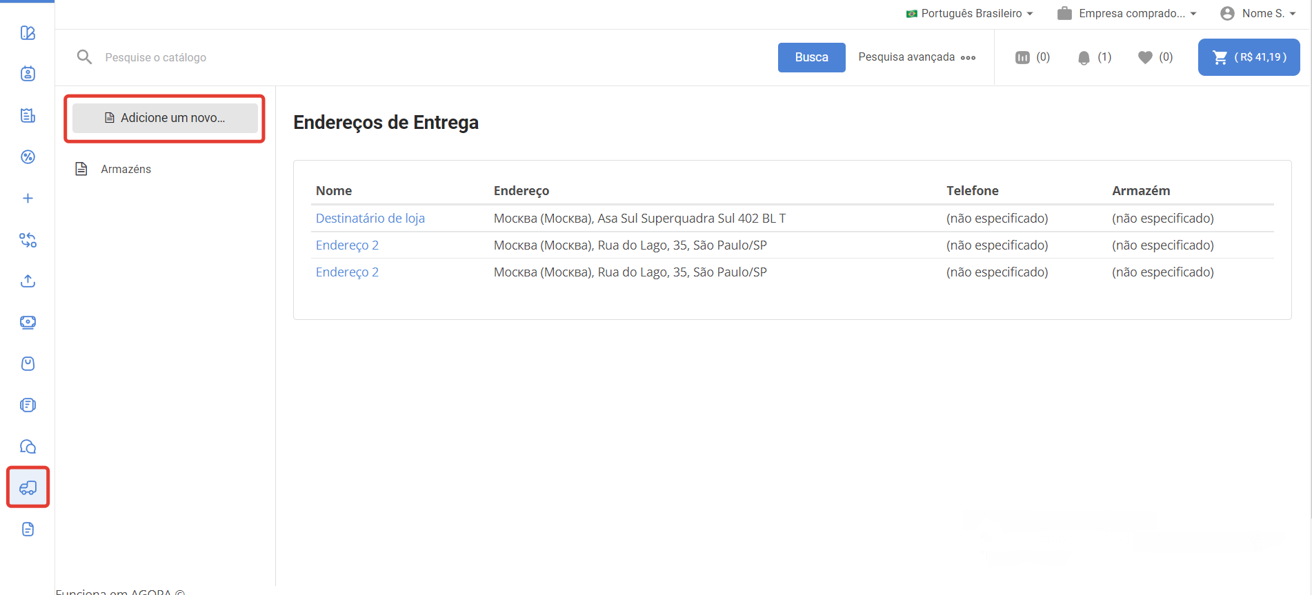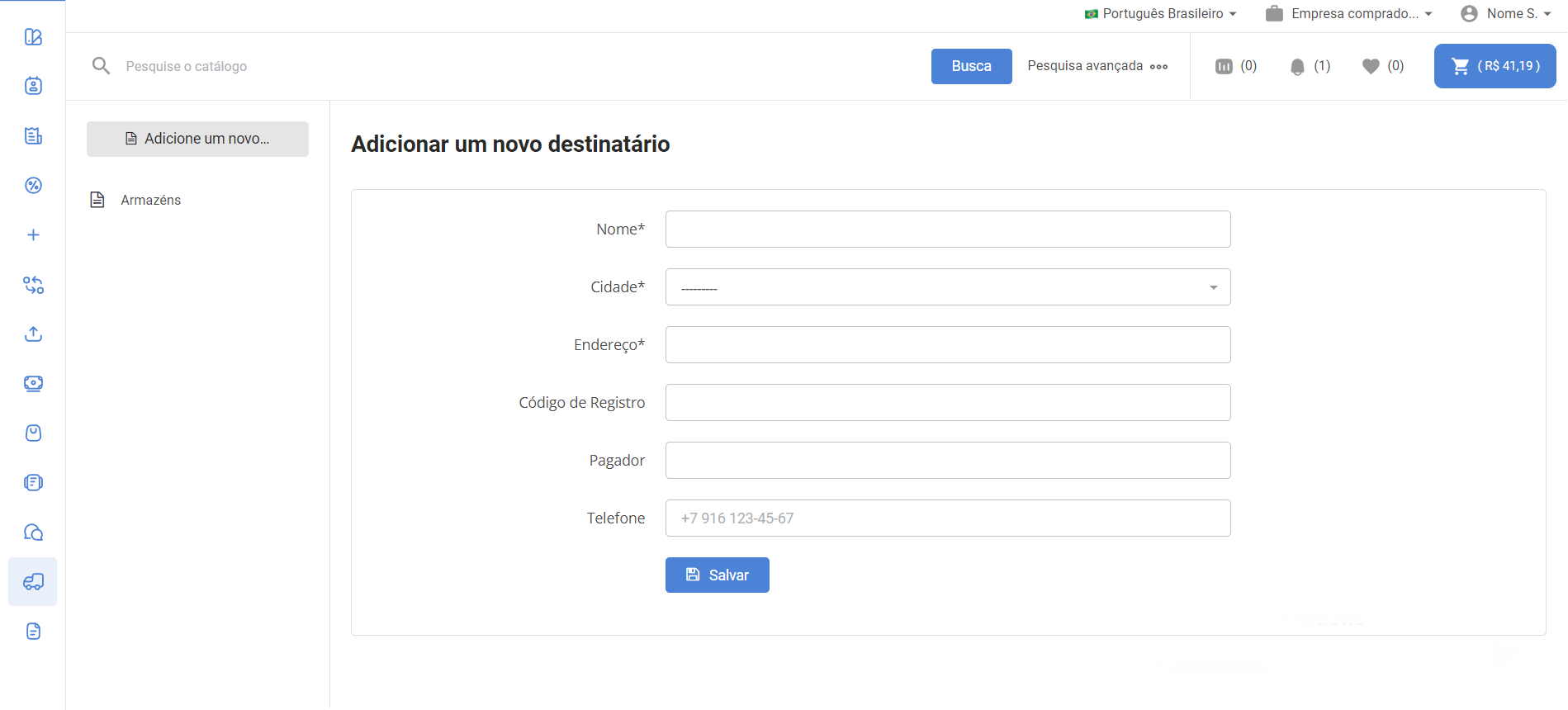 Modelos com detalhes de entrega podem ser inseridos no painel administrativo ou conta pessoal do comprador. Posteriormente, ao fazer um pedido em sua conta pessoal, na seção Consignees, você pode selecionar modelos criados anteriormente. Configuração deconsignes no painel administrativoconsignados em sua conta pessoalNa conta pessoal do comprador, localizada no endereço name_projectPara criar um modelo com detalhes, no painel administrativo localizado em project_name.agora.ru, selecione a obra com a seção Consignees: de Endereços de Entrega é construída da seguinte forma: No painel direito, clique no . Depois de abrir a seção Endereços de Entrega, clique no botão Adicionar um novo: Em seguida, você precisa preencher todos os detalhes (nome, cidade, endereço, etc.) e clicar no botão Salvar: Também é possível adicionar um destinatário através do painel administrativo. Esse processo é descrito em uma página separada. Aplique os modelos criados no checkoutTodos os consignes do comprador estarão disponíveis na lista de drop-down para que seja possível selecionar o modelo necessário: O pedido também exibirá informações sobre o destinatário: Quando você vai diretamente para a seção, você pode ver todos os modelos de destinatário criados no portal ou adicionar um novo destinatário usando o botão Adicionar Destinatários: |
