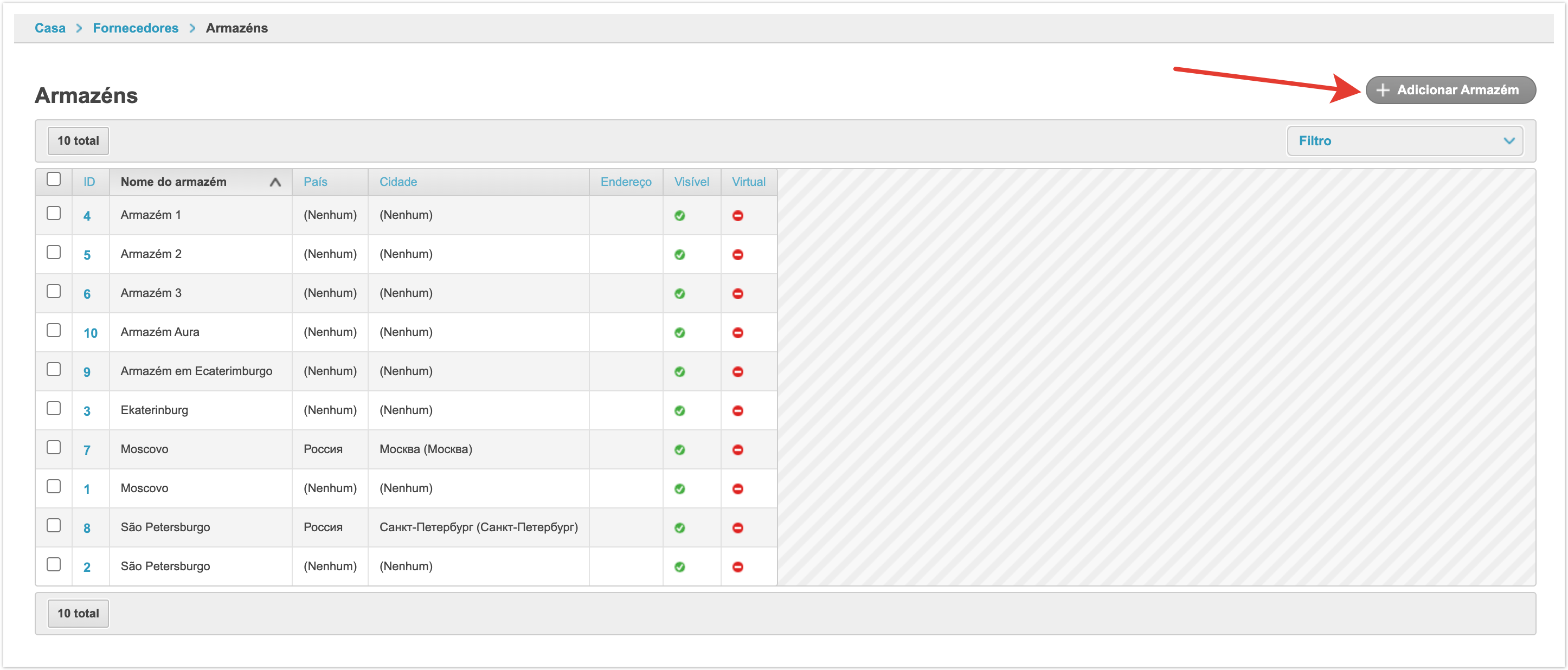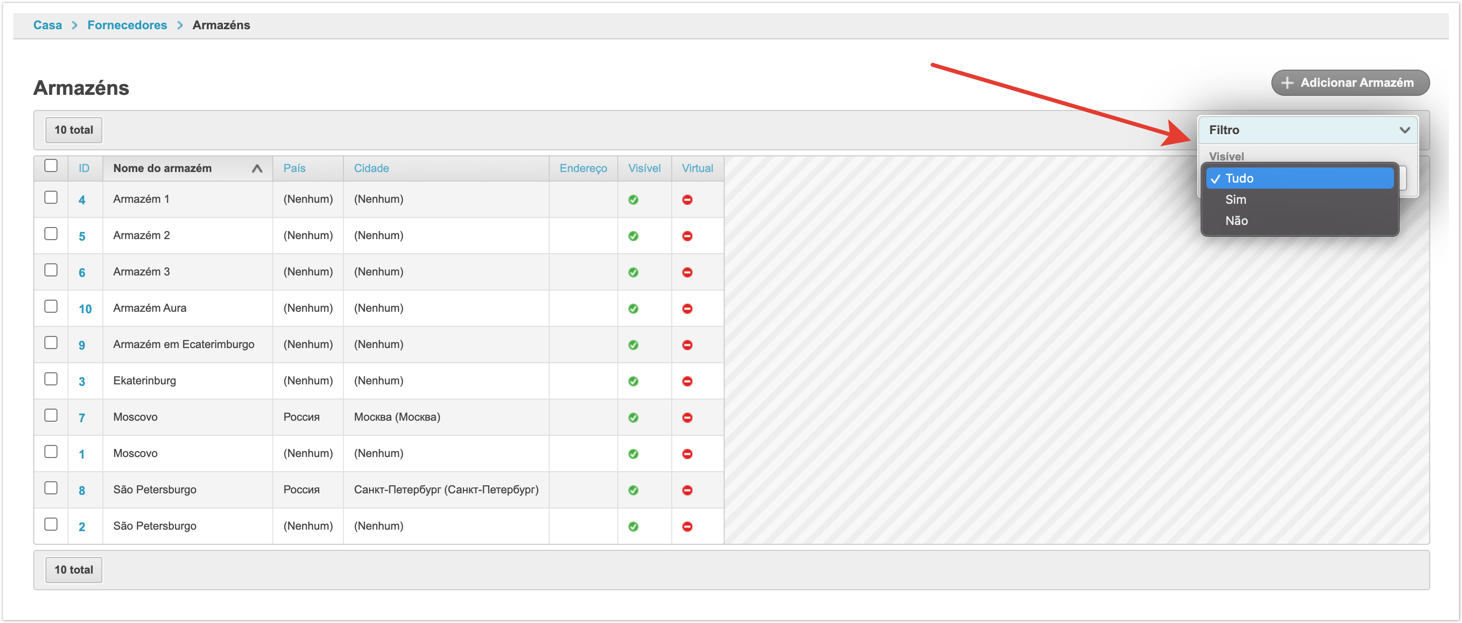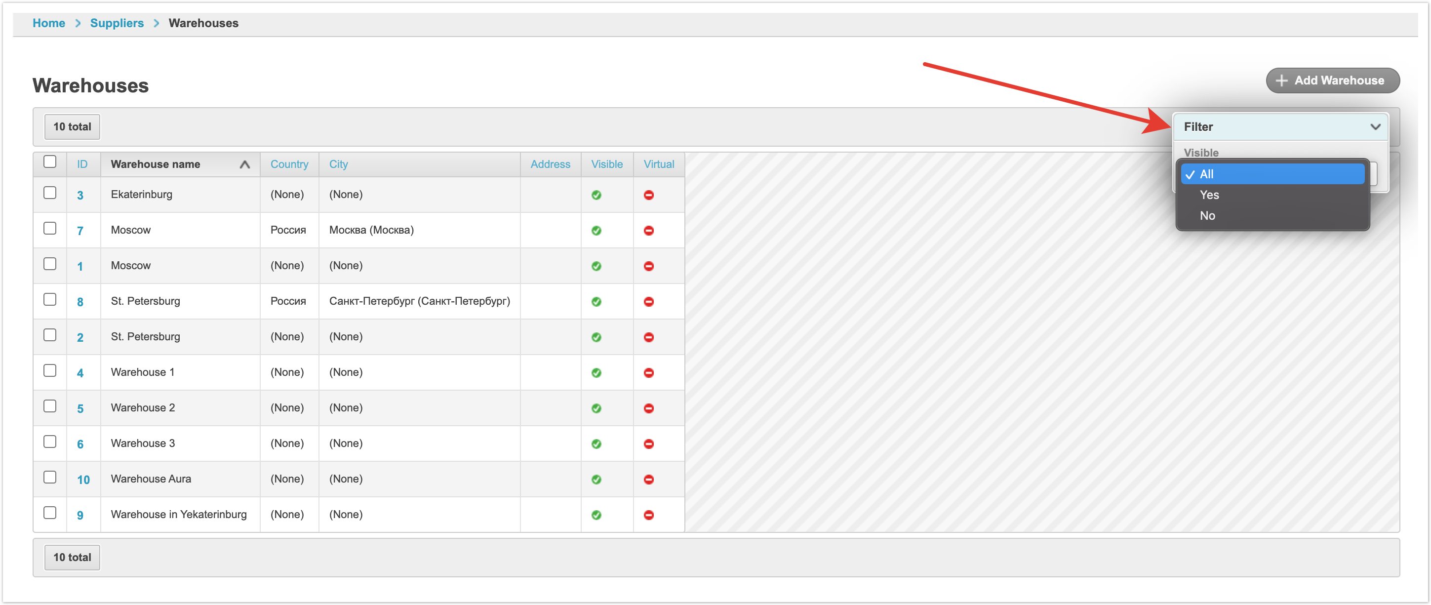 Se necessário, você pode definir a classificação de armazéns por qualquer um dos parâmetros da tabela. Para fazer isso, basta clicar no cabeçalho da coluna. Você também pode filtrar armazéns por visibilidade na caixa Filtro. Adicionar um armazémA seção Armazéns do painel de administração serve como referência. Isso significa que os dados carregados do lado de fora são registrados nele.