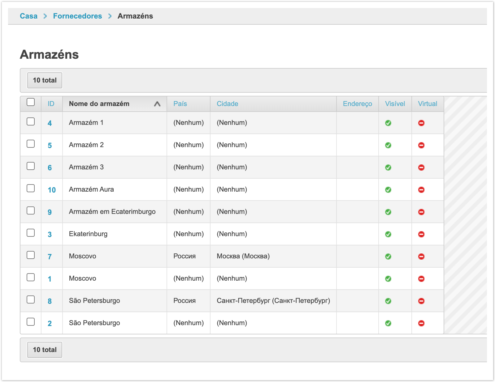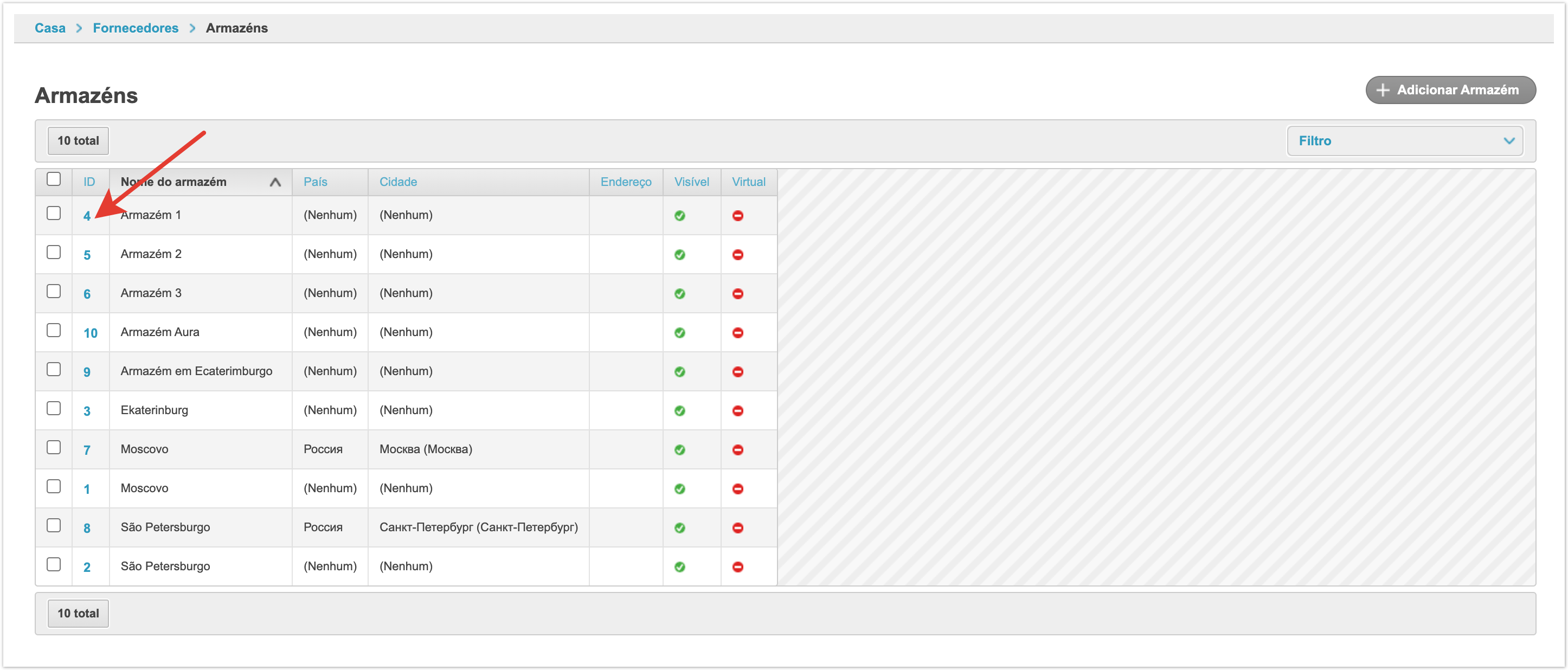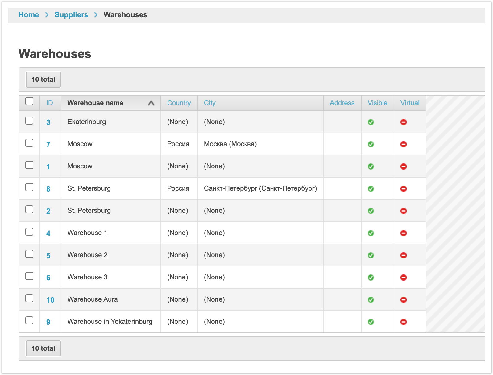 Se necessário, você pode definir a classificação de armazéns por qualquer um dos parâmetros da tabela. Para fazer isso, basta clicar no cabeçalho da coluna. Você também pode filtrar armazéns por visibilidade na caixa Filtro. Adicionar um armazémA seção Armazéns do painel de administração serve como referência. Isso significa que os dados carregados do lado de fora são registrados nele.