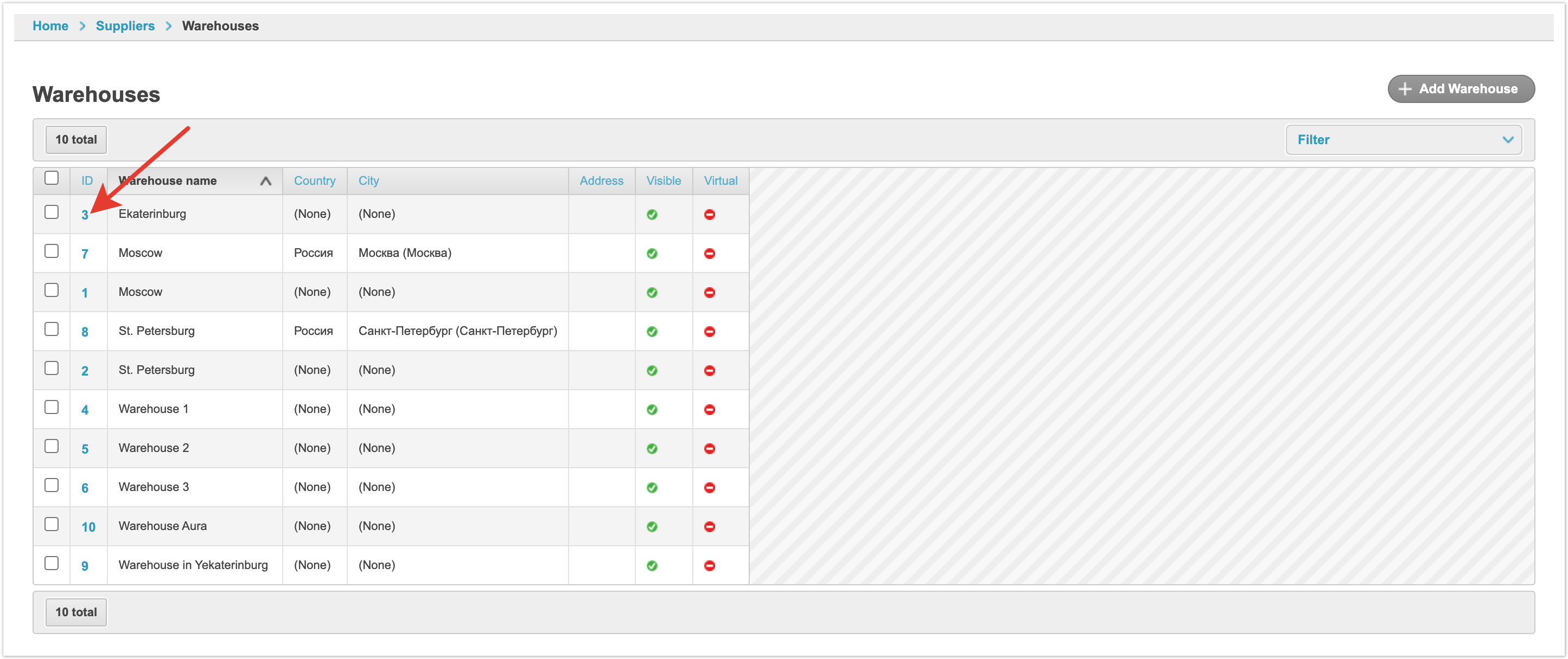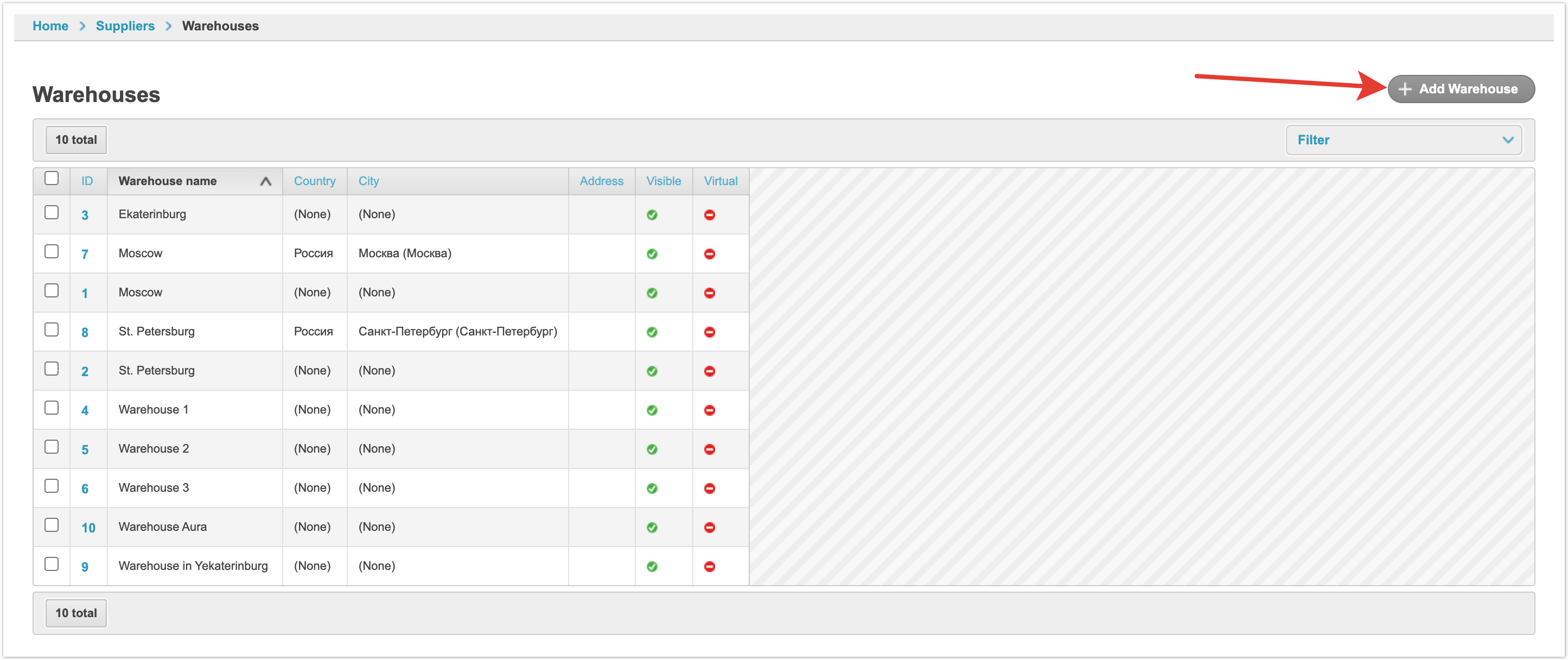 If necessary, you can set the sorting of warehouses by any of the table parameters. To do this, just click on the column heading. In addition, warehouses can be filtered by visibility in the Filter field. Adding a warehouseThe Warehouses section in the admin panel serves as a reference. This means that data loaded from outside is written to it.