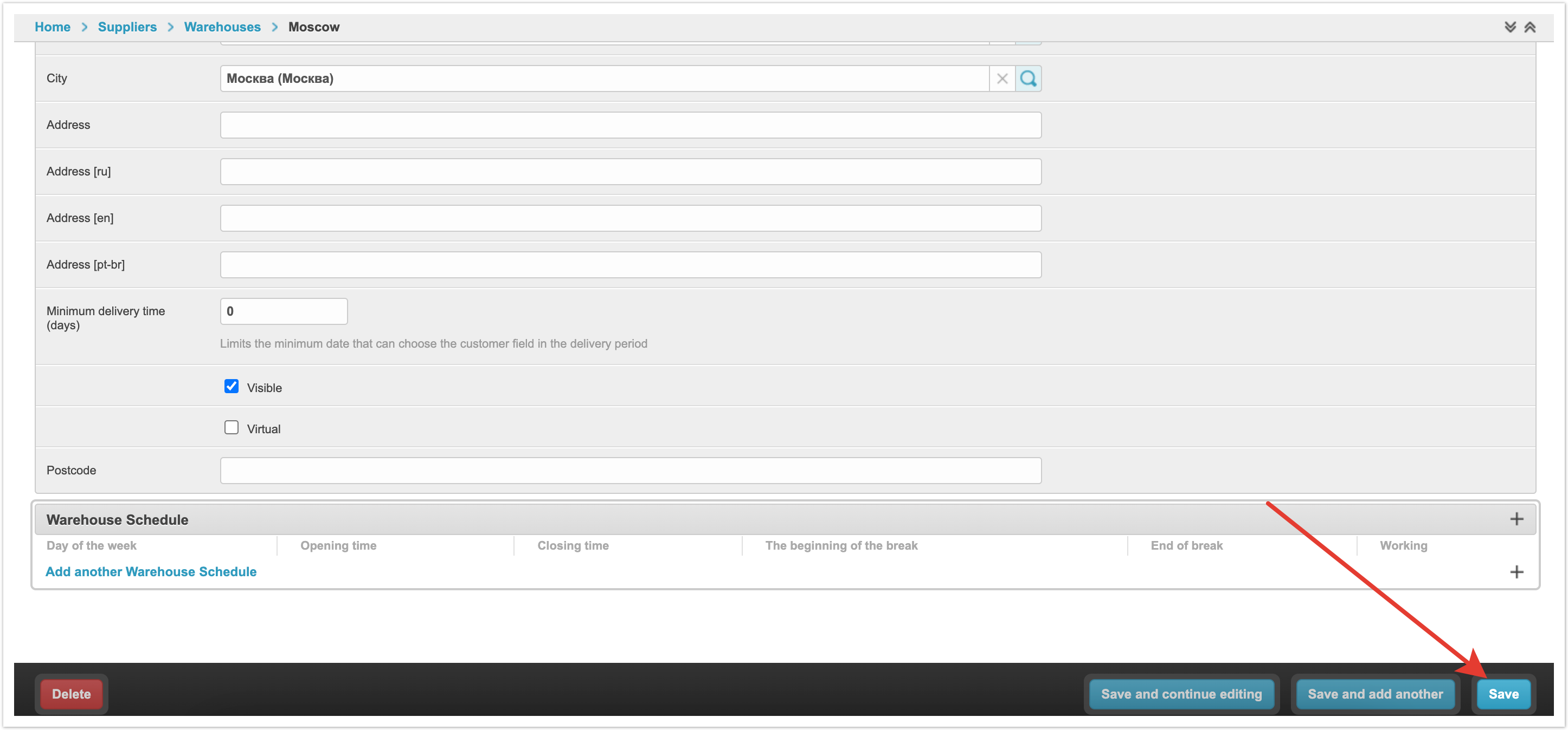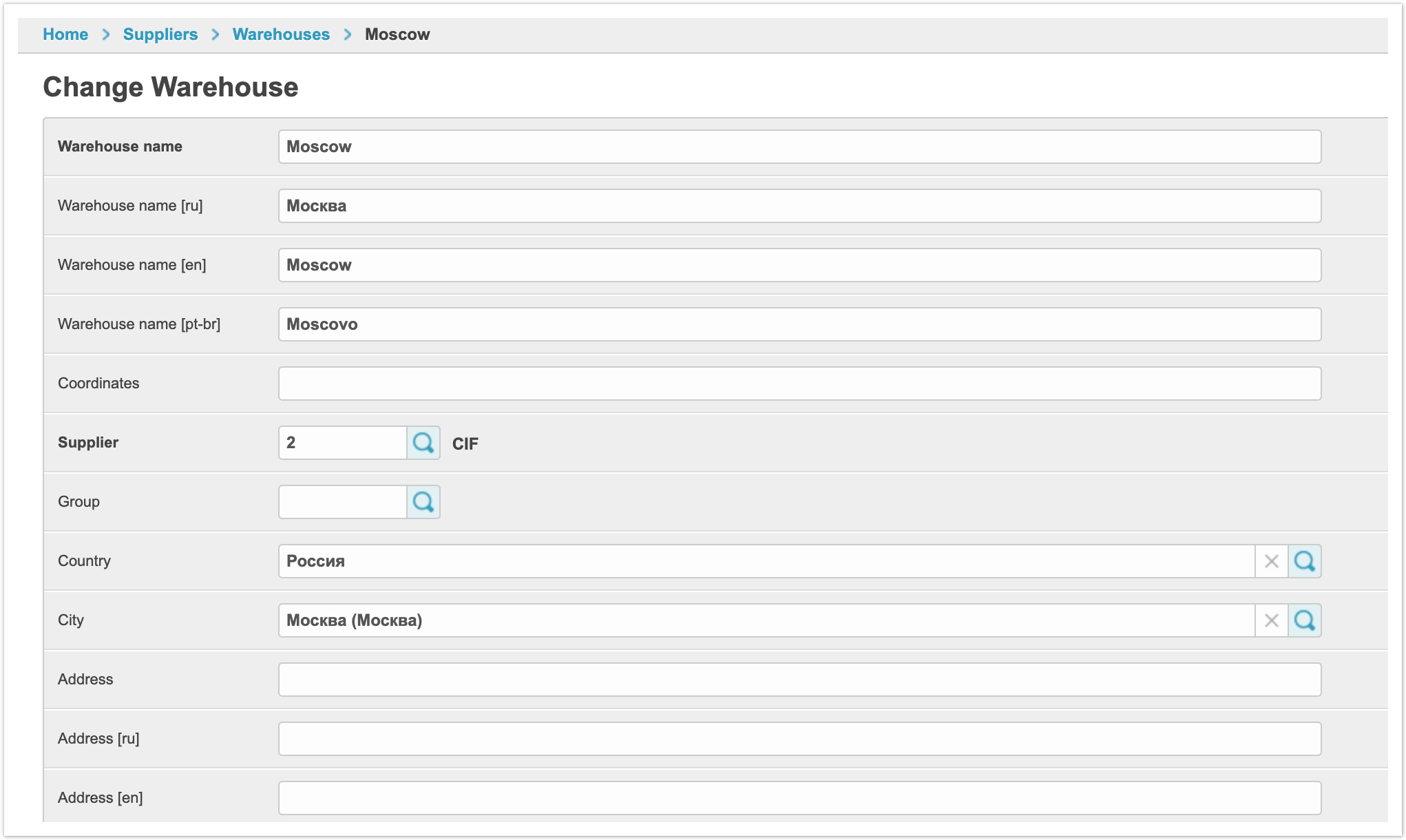 Warehouse changeThrough the admin panel, you can make changes to the settings of the previously created warehouse. To do this, click on its ID. After that, a card of the selected warehouse will open, where you can make changes. Warehouse name - the name for the warehouse, which will be displayed in the personal accounts of users. It can be specified in different languages if multilingualism is enabled on the platform. Coordinates - geographic coordinates of the warehouse location. Specified in the format: 55.750618, 37.615754. Supplier - this field specifies the supplier to which the warehouse belongs. Group - in this field you can select a group of warehouses entered in the administrative panel in the Warehouse groups section. It is indicated if several different names have been entered for one warehouse by different suppliers. Country, City, Address - these fields contain data on the location of the warehouse. Minimum delivery time (days) - the number of days after which the goods can be shipped from the warehouse. If the field contains a value, then when ordering goods, it will not be possible to select the desired date of shipment earlier than this date. Visible - when this checkbox is checked, the warehouse will be visible to suppliers and buyers when ordering goods. Virtual - a virtual warehouse from which you can order goods, but the goods are not available for automatic reservation. Postcode - this field indicates the postal code where the warehouse is located. This parameter also determines the location of the warehouse. Default warehouse - when ordering a product, this warehouse will be selected by default. Warehouse Schedule - this block of settings allows you to specify the warehouse work time. You can specify the day of the week, opening and closing times, the beginning and end of the break, if any, and clear the checkbox Working if the warehouse is closed. To apply the changes, you need to click the Save button in the lower right corner of the page. Warehouse information can also be edited in the administration panel in the Suppliers section or in the supplier's personal account in the Settings > Warehouses section. Deleting, hiding and showing a warehouseYou can perform some bulk actions with warehouses. To do this, select warehouses, and then select the action to be performed in the drop-down list at the bottom left. Make visible - display selected warehouses Make invisible - hide selected warehouses for users Delete - delete selected warehouses