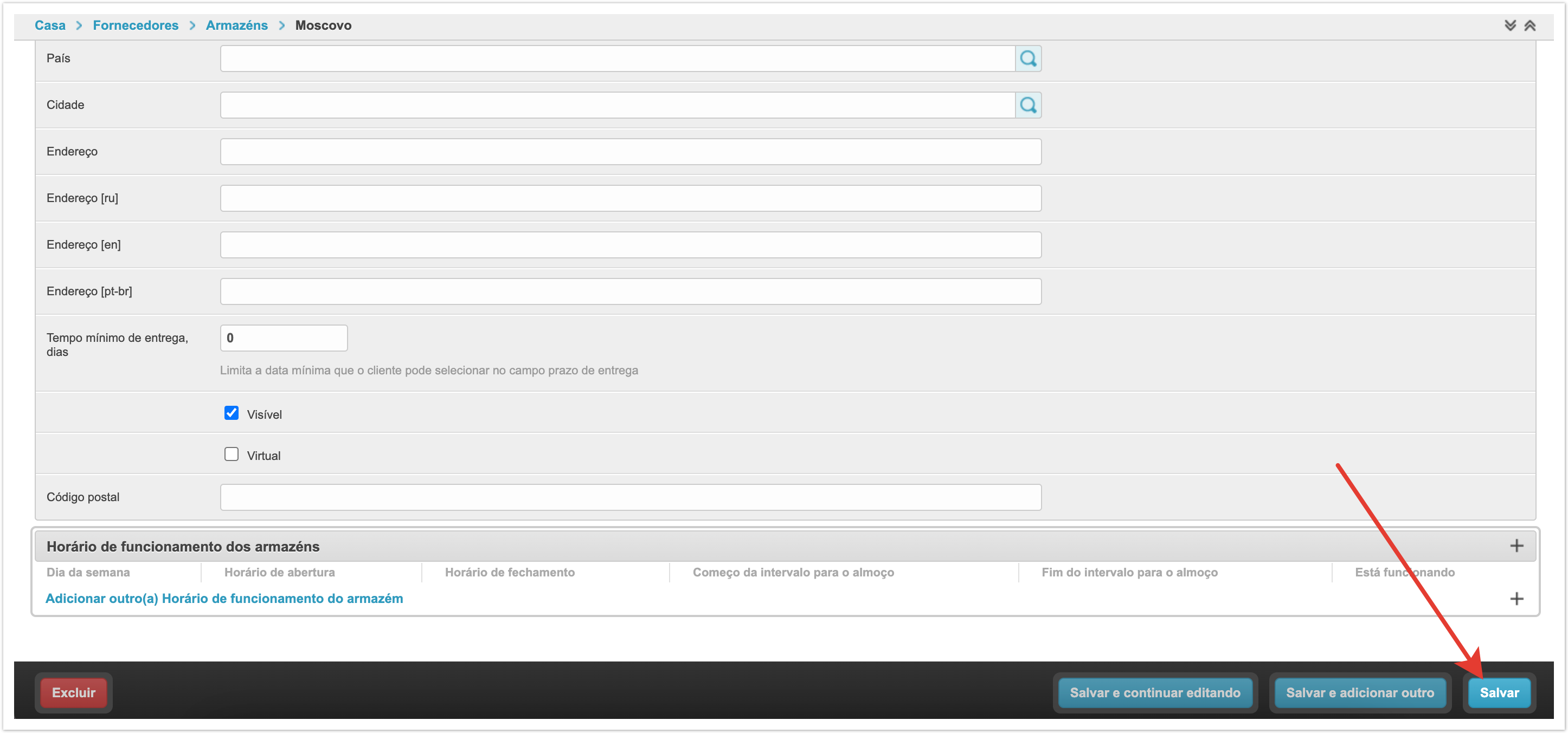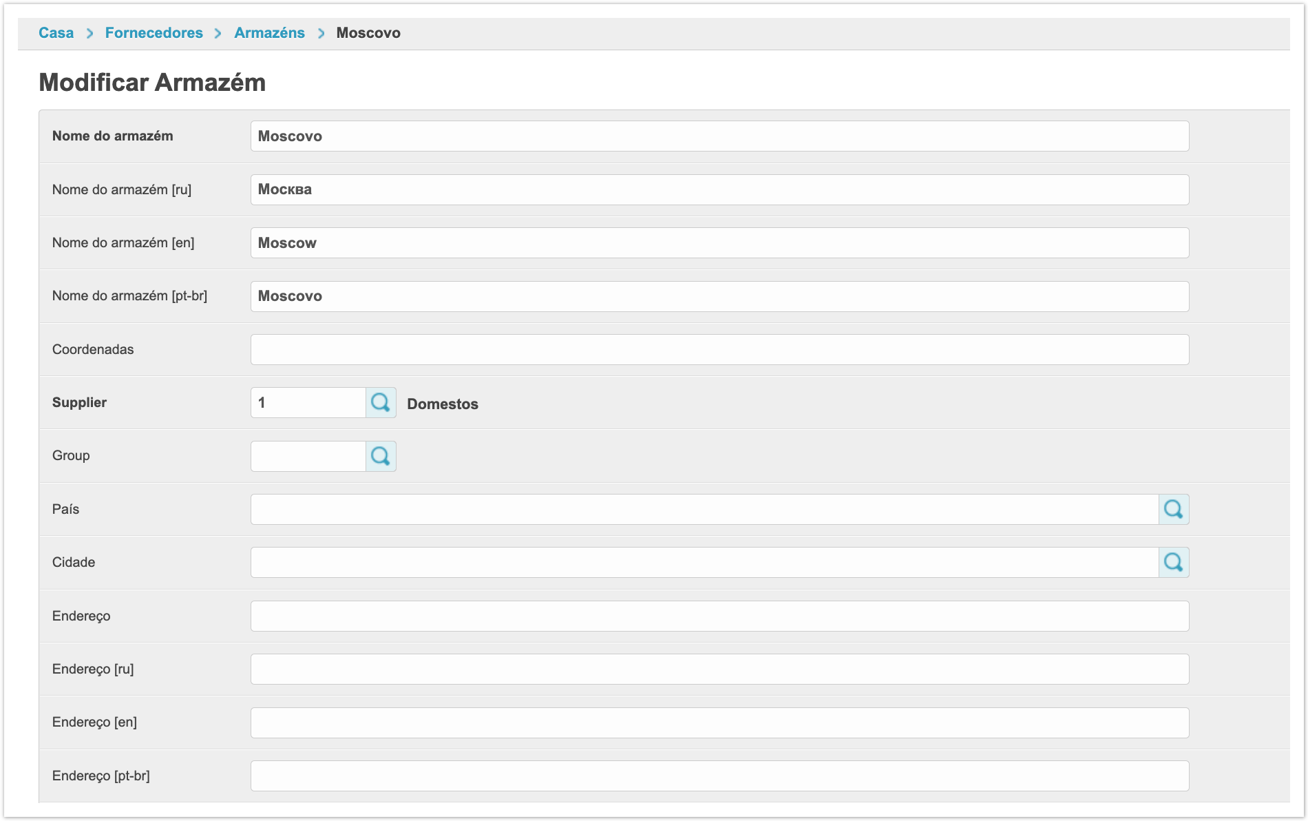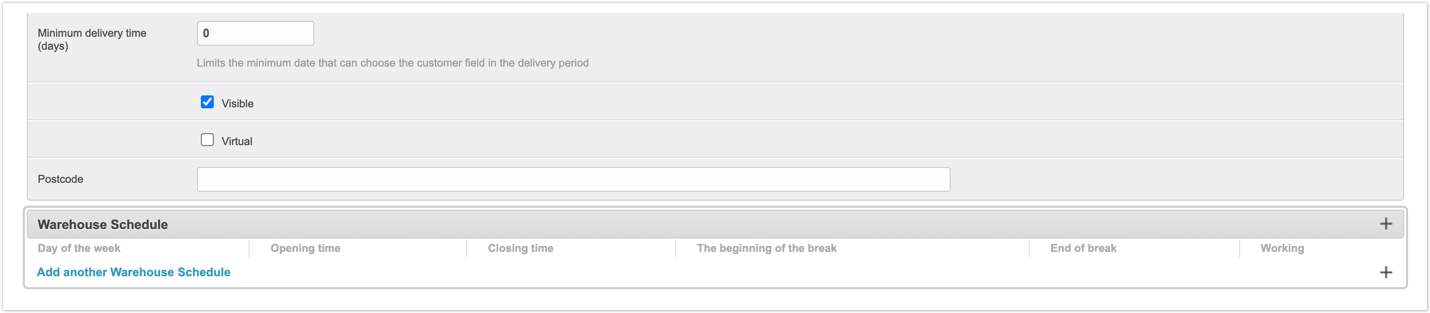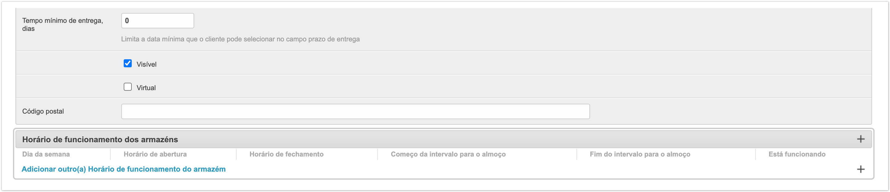 Se, por algum motivo, as opções para adicionar um depósito descritas acima não estiverem disponíveis, você poderá adicionar um novo depósito por meio do painel de administração. Para fazer isso, clique no botão Adicionar Armazém e, em seguida, especifique os dados para o armazém. Em seguida, vamos dar uma olhada mais de perto nas configurações do armazém.