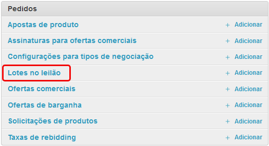 Para abrir esta secção, no painel administrativo, clique em Lotes no em leilão. Na página que abre, são apresentados os lotes iniciados pelo fornecedor: