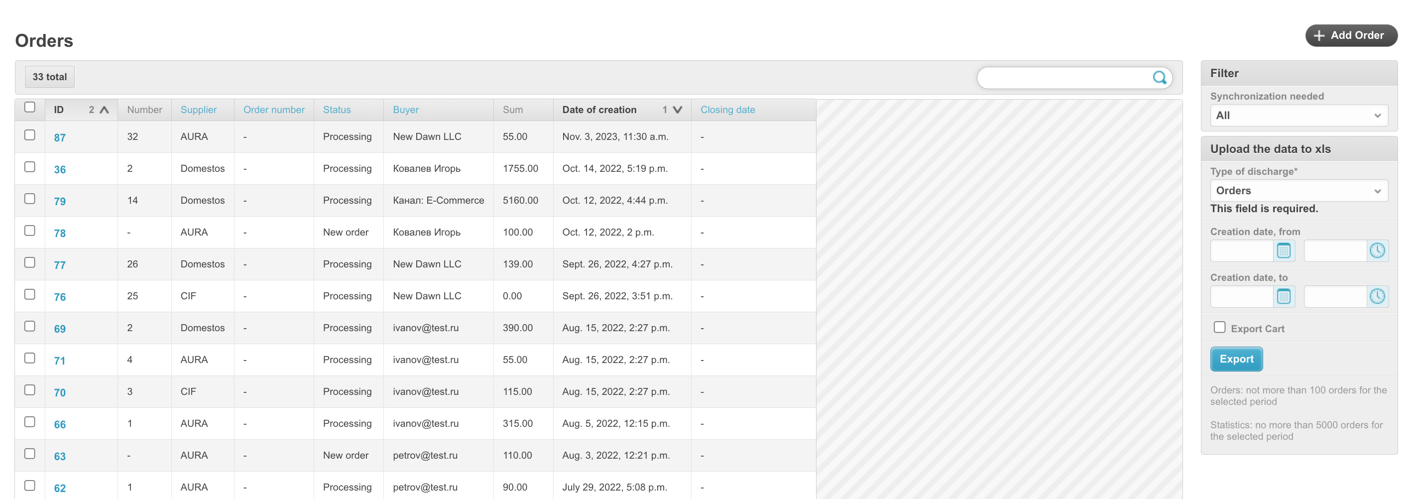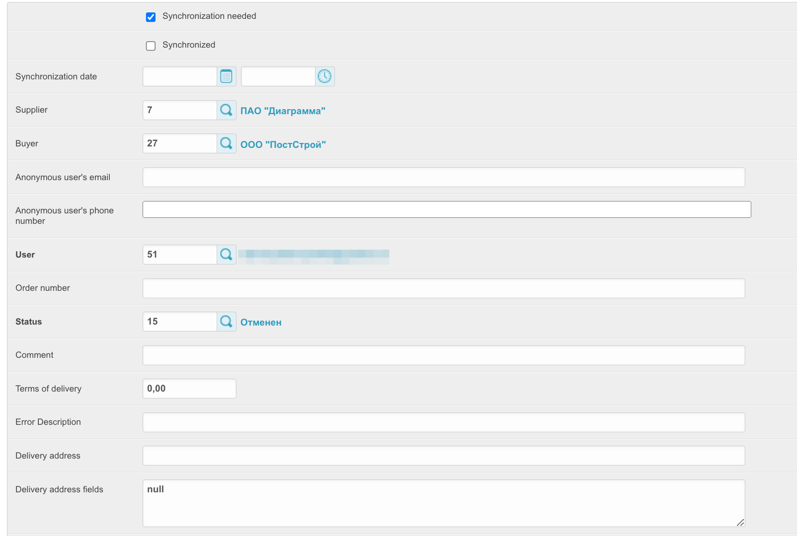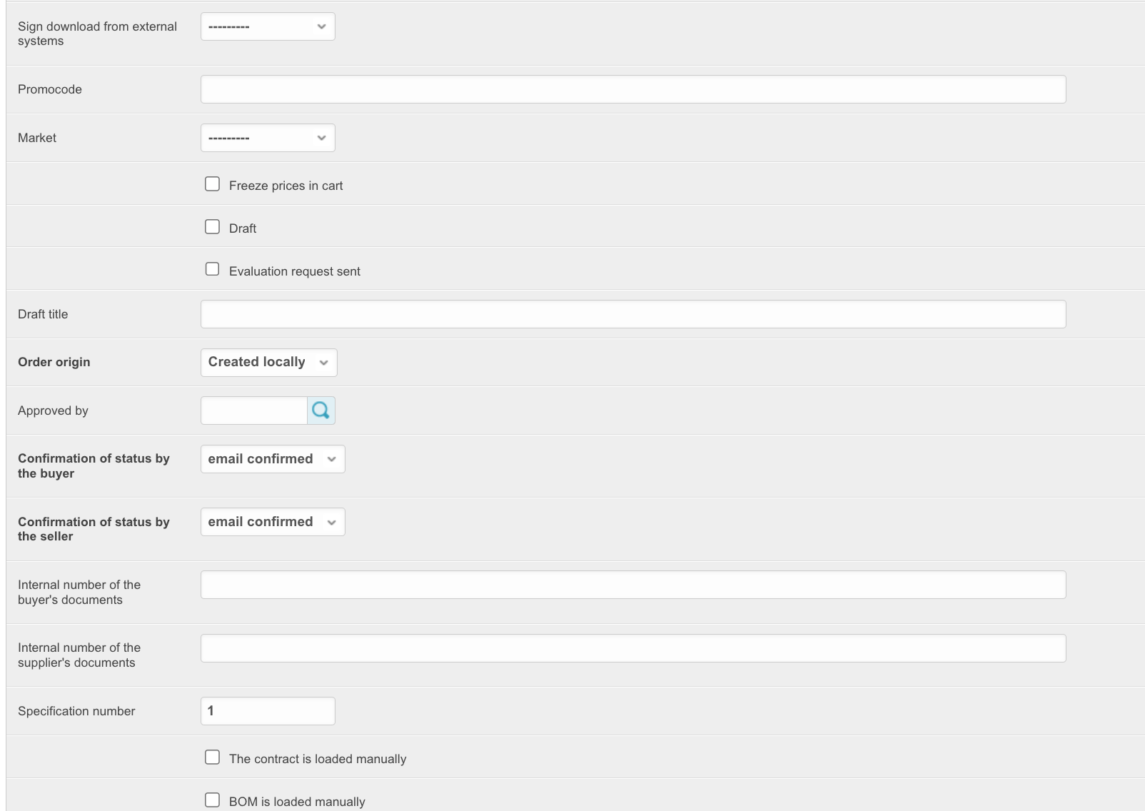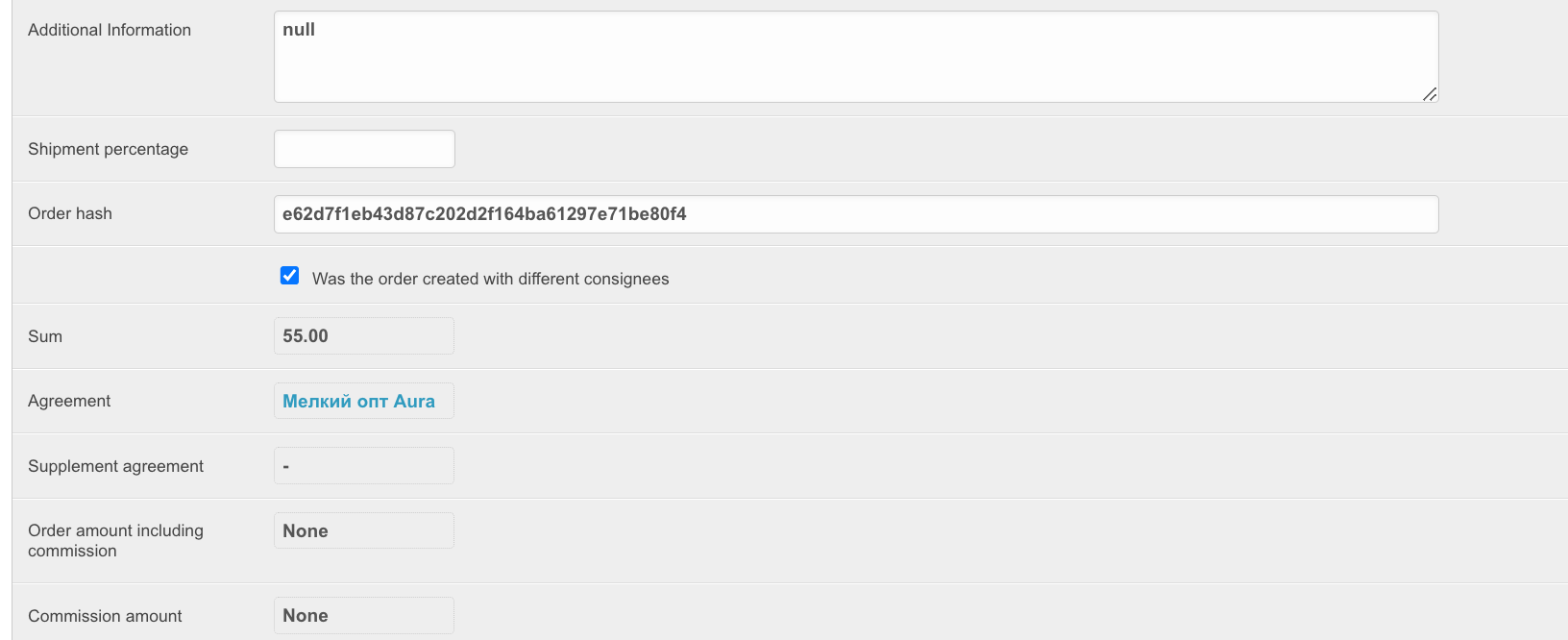To open this section, in the administrative panel located at project_name.agora.ru/admin, go to the Orders section. A table will appear with all orders placed in your personal account: The table contains the following columns: ID - unique order number on the platform. Number - order number for a specific customer. Supplier - the name of the supplier for whose goods the order was made. Order number - order number assigned by the ERP system. To be filled in if integration is configured. Status - current order status. A new order means that the items are still in the cart and have not been processed. This order is not assigned a number. Buyer - the name of the buyer who placed the order. Sum - order amount. Creation date - the date the order was created. Closing date - the order closing date. Filled in when the order changes to Closed status. When you click on the order ID, you can view the order data: Synchronization needed - (we do not recommend installing this checkbox yourself; if any order is not uploaded to the Agora System, you should contact technical support) when installing this checkbox, orders will be resent if the order information is not returned back from ERP systems. This function is important when working with several ERP systems at once. Synchronized - the checkbox is set if the order was successfully synchronized with the accounting system. Synchronization date - the date and time when the order was synchronized with the ERP system. Supplier - the name of the supplier for whose goods the order is placed. Buyer - the name of the buyer who placed the order. E-mail of the anonymous user, Phone number of the anonymous user - data of the user who placed the order, if it was placed without registration. Relevant for projects with an open catalog and the ability to place an order without registration. User - data of the user who placed the order. Order number - order number assigned by the ERP system. To be filled in if integration is configured. Status - current order status. A new order means that the items are still in the cart and have not been processed. This order is not assigned a number. Comment - comment on the order, if it has been completed. Terms of delivery, Error description, Delivery address, Delivery address fields, Number of departure - order delivery data. Sum - the amount of the order that was downloaded from the 1C system. Paid amount - the amount paid for the order. Payment percentage - percentage of payment for the order. Currency - the currency of the order. Payment method - the method of payment for the order specified when placing it. Payment type - payment type for the order. The type of payment determines the status line along which the order will move further. Prepayment percent - the percentage of prepayment of the order. Relevant for the prepaid status line. Delay in payment (days) - the number of days to defer payment for the order. Grade days type - type of deferred days: bank, calendar or working days. Organization - the organization that placed the order. Delivery method - the method of delivery of goods specified when placing an order. Number of purchase - the field is filled in if the order was created on the basis of a concluded contract after the purchase. Placing an order based on the purchase result refers to the SRM system. Desired date of shipment - desired date of shipment. To be completed when placing an order. Estimated delivery date - the delivery date obtained from the ERP system. Closing date - the order closing date. Filled in when the order changes to Closed status. Consignee - the consignee of the order, filled in when placing an order by the buyer. Delivery time - the date of delivery of the order. Due date - date of payment for the order. Value discount for the order amount, % - if a discount on the order amount as a percentage was applied to the order, it will be recorded in this field. The discount value for the order amount, fixed - if a fixed discount on the order amount was applied to the order, it will be indicated in this field. Manager - the manager to whom the order belongs. Payer, Email, Phone, City, Consignee warehouse - recipient's details. Sign of download from an external system - if the order was loaded from an external system and not generated on the platform, then this parameter will be filled in. Promocode - when applying a promotional code to an order, it will be indicated in this field. Freeze prices in the cart - if the order has not yet been placed and is in the cart, this setting will be enabled. Draft - if the order is moved to drafts, the setting will be enabled. Evaluation request sent - if a request for evaluation has been sent for an order, the setting will be enabled. Draft title - if the order is added to drafts, then the draft title will be filled in this field. Order origin - shows whether the order was placed on the platform or not. Approved by - the user who confirmed the order upon acceptance. Confirmation of status by the buyer, Confirmation of status by the seller - if the status line implies confirmation of the order by the buyer and seller, then these fields will be filled in depending on the availability of confirmations. Internal number of the buyer's documents - the number of the buyer's documents. Internal number of the supplier's document - number of documents from the supplier. Specification number - specification number for the order. The contract is downloaded manually - set if you selected to download the contract manually when placing an order. The specification is loaded manually - set if you selected to download the specification manually when placing an order. Additional information - a block with additional information. Shipment percentage - if the order is shipped in parts, then this field indicates the percentage of shipment of the order. Order hash is a unique object identifier. Can be used when transferring data to third-party systems. Whether the order was created with 
