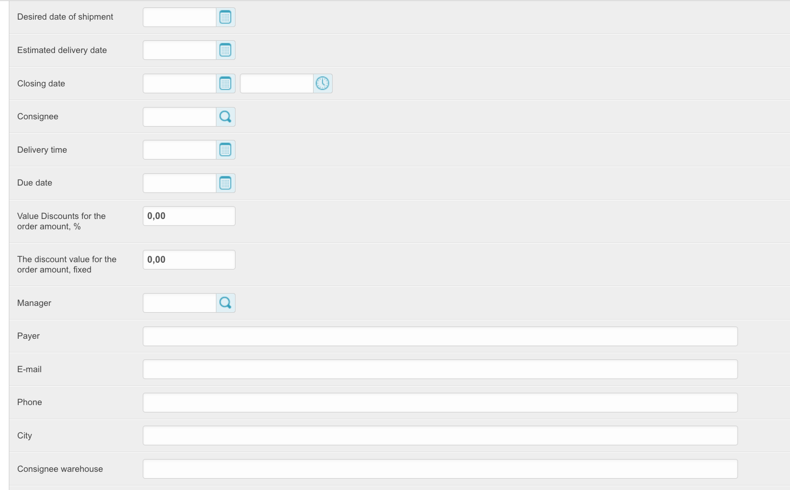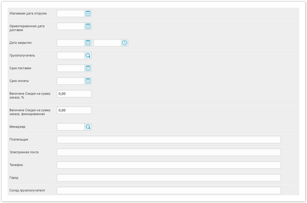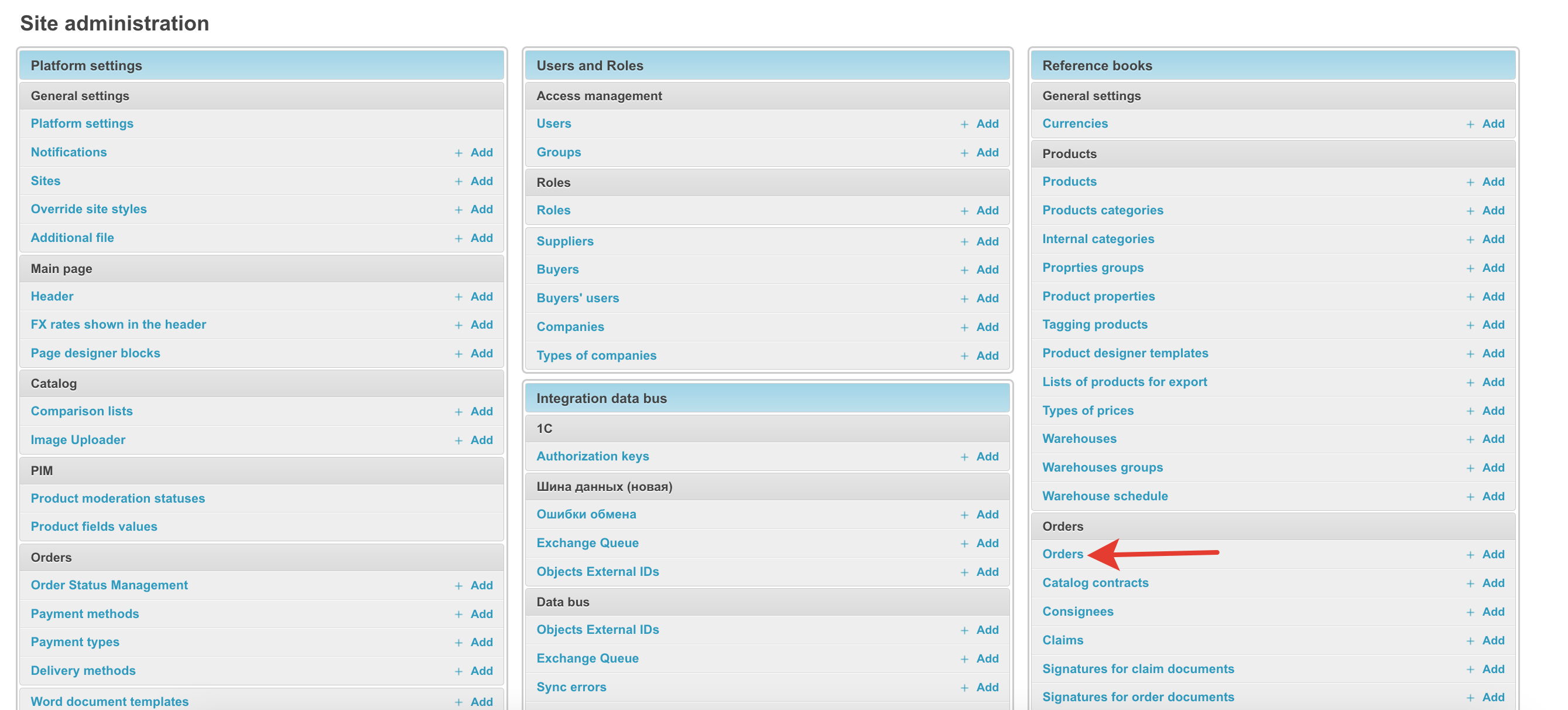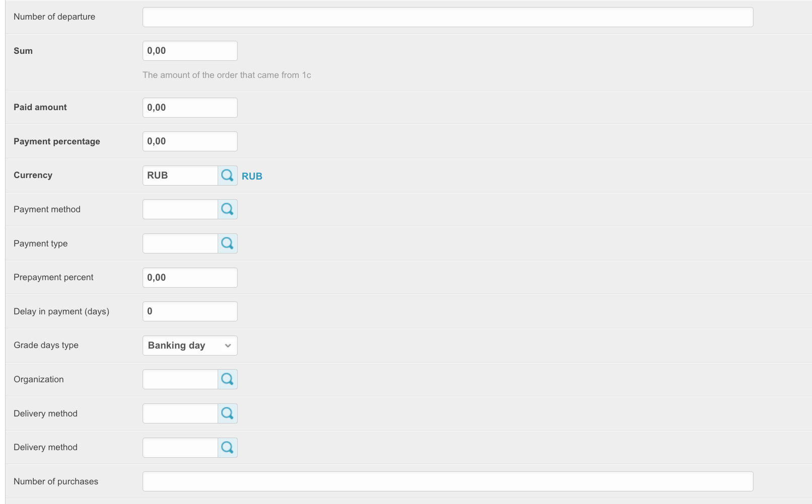 To open this section, in the administrative panel located at project_name.agora.ru/admin, go to the Orders section. A table will appear with all orders placed in your personal account: The table contains the following columns: ID - unique order number on the platform. Number - order number for a specific customer. Supplier - the name of the supplier for whose goods the order was made. Order number - order number assigned by the ERP system. To be filled in if integration is configured. Status - current order status. A new order means that the items are still in the cart and have not been processed. This order is not assigned a number. Buyer - the name of the buyer who placed the order. Sum - order amount. Creation date - the date the order was created. Closing date - the order closing date. Filled in when the order changes to Closed status. When you click on the order ID, you can view the order data: Synchronization needed - (we do not recommend installing this checkbox yourself; if any order is not uploaded to the Agora System, you should contact technical support) when installing this checkbox, orders will be resent if the order information is not returned back from ERP systems. This function is important when working with several ERP systems at once. Synchronized - the checkbox is set if the order was successfully synchronized with the accounting system. Synchronization date - the date and time when the order was synchronized with the ERP system. Supplier - the name of the supplier for whose goods the order is placed. Buyer - the name of the buyer who placed the order. E-mail of the anonymous user, Phone number of the anonymous user - data of the user who placed the order, if it was placed without registration. Relevant for projects with an open catalog and the ability to place an order without registration. User - data of the user who placed the order. Order number - order number assigned by the ERP system. To be filled in if integration is configured. Status - current order status. A new order means that the items are still in the cart and have not been processed. This order is not assigned a number. Comment - comment on the order, if it has been completed. Terms of delivery, Error description, Delivery address, Delivery address fields, Number of departure - order delivery data. Sum - the amount of the order that was downloaded from the 1C system. Paid amount - the amount paid for the order. Payment percentage - percentage of payment for the order. Currency - the currency of the order. Payment method - the method of payment for the order specified when placing it. Payment type - payment type for the order. The type of payment determines the status line along which the order will move further. Prepayment percent - the percentage of prepayment of the order. Relevant for the prepaid status line. Delay in payment (days) - the number of days to defer payment for the order. Grade days type - type of deferred days: bank, calendar or working days. Organization - the organization that placed the order. Delivery method - the method of delivery of goods specified when placing an order. Number of purchase - the field is filled in if the order was created on the basis of a concluded contract after the purchase. Placing an order based on the purchase result refers to the SRM system. Desired date of shipment - desired date of shipment. To be completed when placing an order. Estimated delivery date - the delivery date obtained from the ERP system. Closing date - the order closing date. Filled in when the order changes to Closed status. Consignee - the consignee of the order, filled in when placing an order by the buyer. Delivery time - the date of delivery of the order. Due date - date of payment for the order. Value discount for the order amount, % - if a discount on the order amount as a percentage was applied to the order, it will be recorded in this field. The discount value for the order amount, fixed - if a fixed discount on the order amount was applied to the order, it will be indicated in this field. Manager - the manager to whom the order belongs. Payer, Email, Phone, City, Consignee warehouse - recipient's details. Sign of download from an external system - if the order was loaded from an external system and not generated on the platform, then this parameter will be filled in. Promocode - when applying a promotional code to an order, it will be indicated in this field. Freeze prices in the cart - if the order has not yet been placed and is in the cart, this setting will be enabled. Draft - if the order is moved to drafts, the setting will be enabled. Evaluation request sent - if a request for evaluation has been sent for an order, the setting will be enabled. Draft title - if the order is added to drafts, then the draft title will be filled in this field. Order origin - shows whether the order was placed on the platform or not. Approved by - the user who confirmed the order upon acceptance. Confirmation of status by the buyer, Confirmation of status by the seller - if the status line implies confirmation of the order by the buyer and seller, then these fields will be filled in depending on the availability of confirmations. Internal number of the buyer's documents - the number of the buyer's documents. Internal number of the supplier's document - number of documents from the supplier. Specification number - specification number for the order. The contract is downloaded manually - set if you selected to download the contract manually when placing an order. The specification is loaded manually - set if you selected to download the specification manually when placing an order. Additional information - a block with additional information. Shipment percentage - if the order is shipped in parts, then this field indicates the percentage of shipment of the order. Order hash is a unique object identifier. Can be used when transferring data to third-party systems. Whether the order was created with 