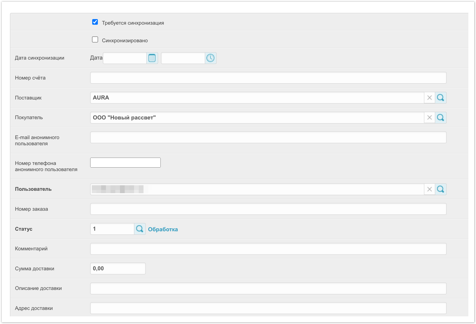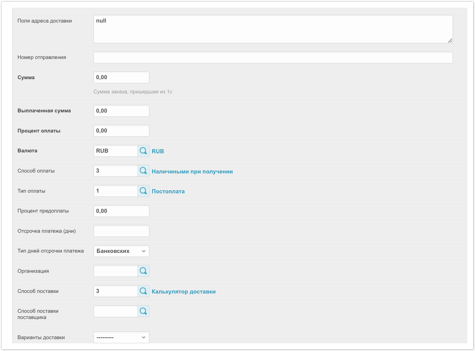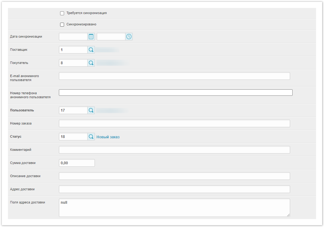 Чтобы открыть данный раздел, в административной панели, расположенной по адресу название_проекта.agora.ru/admin, зайдите в раздел Заказы. Появится таблица со всеми заказами, оформленными в личном кабинете: В таблице присутствуют следующие столбцыколонки: ID - уникальный номер заказа на платформе. Number - номер заказа для конкретного покупателя. Поставщик - наименовение наименование поставщика, на товары которого сделан заказ. Номер заказа - номер заказа, присвоенный ERP системой. Заполняется если настроена интеграция. Статус - текущий статус заказа. Новый заказ обозначает, что товары еще лежат в корзине и не были оформлены. Такому заказу номер не присваивается. Покупатель - наивенование наименование покупателя, сделавшего заказ. Sum - сумма заказа. Дата создания - дата формирования заказа. Дата закрытия - дата закрытия заказа. Заполняется, когда заказ переходит в статус Закрыт. При нажатии на ID заказа можно посмотреть данные по заказу: Требуется синхронизация - (не рекомендуем самостоятельно устанавливать данный чекбоксчек-бокс, если какой-либо заказ не выгрузился в Систему Agora, следует обратиться в службу технической поддержки) при установке данного чек-бокса заказы будут отправляться повторно, если информация по заказу не вернулась обратно из ERP-системы. Данная функция важна при работе сразу с несколькими ERP-системами. Синхронизировано - чек-бокс устанавливается, если заказ был успешно синхронизирован с учетной системой. Дата синхронизации - дата и время, когда была выполнена синхронизация заказа с ERP системой. Номер счета - ??? Поставщик - наименование поставщика, на товары которого сделан оформлен заказ. Покупатель - наименование покупателя, сделавшего заказ. E-mail анонимного пользователя, Номер телефона анонимного пользователя - данные пользователя, оформившего заказ, если он оформлялся без регистрации. Актуально для проектов с открытым каталогом и возможностью оформления заказа без регистрации. Пользователь - данные пользователя, оформившего заказ. Номер заказа - номер заказа, присвоенный ERP системой. Заполняется если настроена интеграция. Статус - текущий статус заказа. Новый заказ обозначает, что товары еще лежат в корзине и не были оформлены. Такому заказу номер не присваивается. Комментарий - комментарий к заказу, если он был заполнен. Сумма доставки, Описание доставки, Адрес доставки, Поля адреса доставки, Номер отправления - данные по доставке заказа. Сумма - сумма заказа, которая была выгружена из 1С системы. Выплаченная сумма - сумма, оплаченная по заказу. Процент оплаты - процент оплаты заказа. Валюта - валюта, оформленного заказа. Способ оплаты - способ оплаты заказа, указанный при его оформлении. Тип оплаты - тип оплаты заказа. От типа оплаты зависит линейка статусов, по которой заказ далее будет двигаться. Процент предоплаты - процент предоплаты заказа. Актуально для предоплатной линейки статусов. Отсрочка платежа (дни) - количество дней отсрочки оплаты по заказу. Тип дней отсрочки платежа - тип дней отсрочки: банковские, календарные или рабочие. Организация - организация оформившая заказ. Способ поставки - способ доставки товаров, указанный при оформлении заказа. Способ поставки поставщика - ??? Варианты доставки - ??? способ доставки товаров, указанный при оформлении заказа. Номер закупки - поле заполняется, если заказ был создан н