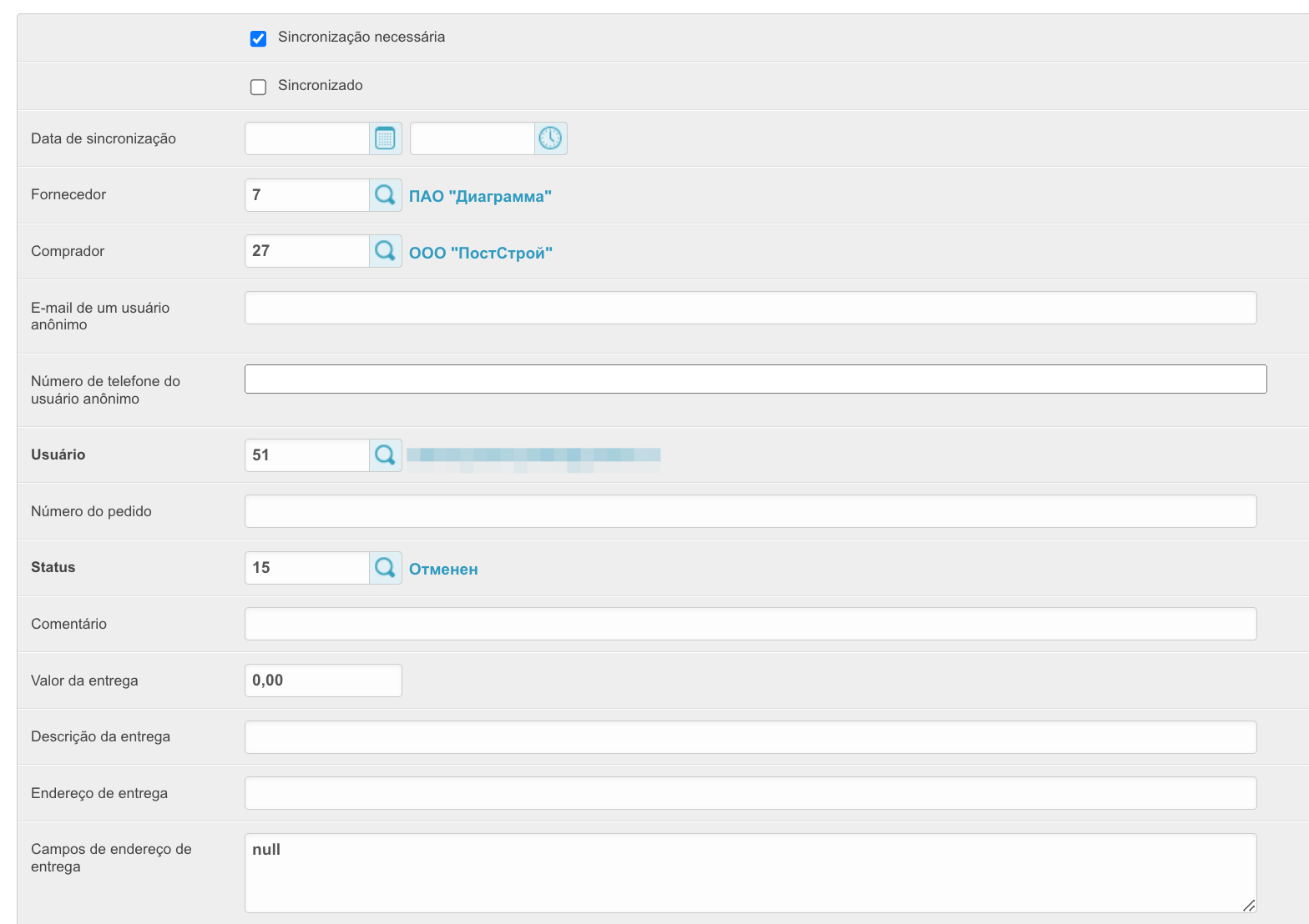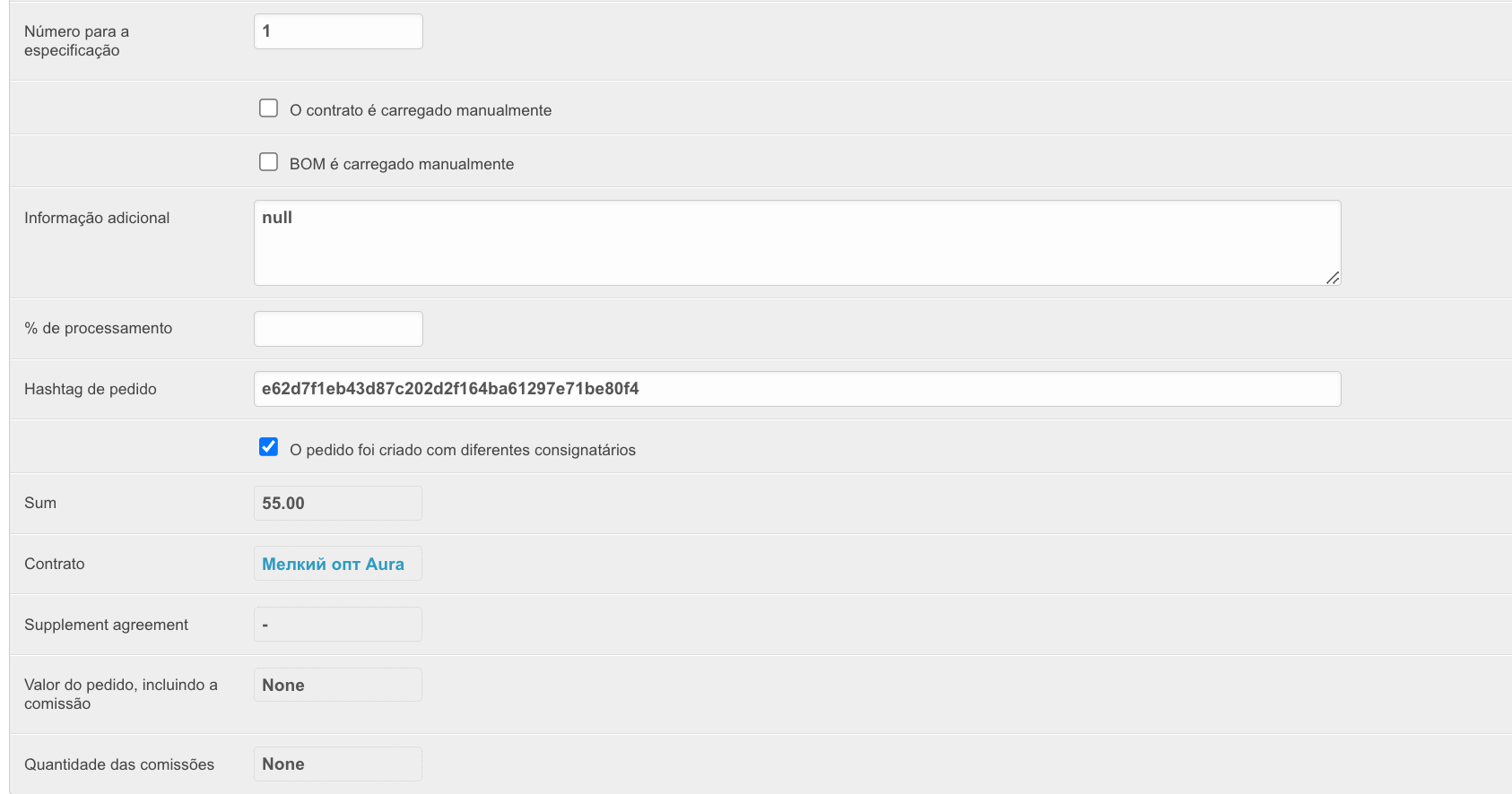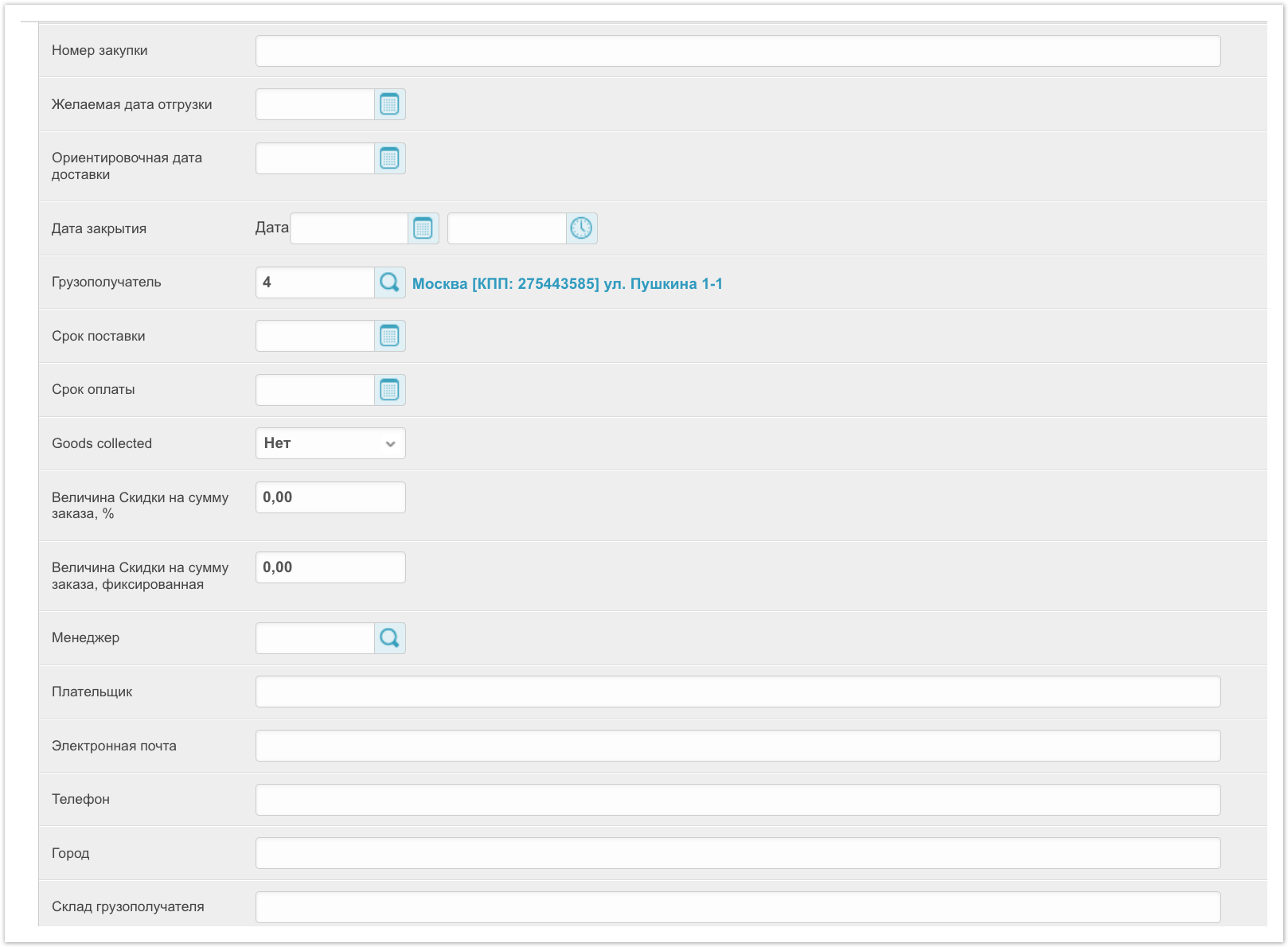 Para abrir esta seção, vá para a seção Pedidos no painel de administração localizado em project_name.agora.ru/admin. Uma tabela aparecerá com todos os pedidos feitos em sua conta pessoal: A tabela contém as seguintes colunas: ID - um número de pedido exclusivo na plataforma. Número - número do pedido de um cliente específico. Fornecedor - o nome do fornecedor para cuja mercadoria o pedido é feito. Número do pedido - o número do pedido atribuído pelo sistema ERP. A ser preenchido se a integração estiver configurada. Status - o status atual do pedido. Um novo pedido significa que os itens ainda estão no carrinho e não foram colocados. A tal pedido não é atribuído um número. Comprador - o nome do comprador que fez o pedido. Sum é o valor do pedido. Data de Criação - A data em que o pedido foi feito. Data de Encerramento - A data em que o pedido é fechado. Ele é preenchido quando o status do pedido é Fechado. Ao clicar no ID do pedido, você pode visualizar os dados do pedido: A sincronização é necessária - (não recomendamos instalar esta caixa de seleção, se algum pedido não tiver sido carregado no Sistema Agora, você deve entrar em contato com o suporte técnico) Ao instalar esta caixa de seleção, os pedidos serão enviados novamente se as informações do pedido não forem devolvidas do sistema ERP. Esse recurso é importante quando se trabalha com vários sistemas ERP ao mesmo tempo. Sincronizado - a caixa de seleção será instalada se o pedido tiver sido sincronizado com êxito com o sistema de contabilidade. Data de sincronização - a data e hora em que o pedido foi sincronizado com o sistema ERP. Fornecedor - o nome do fornecedor para cuja mercadoria o pedido é feito. Comprador - o nome do comprador que fez o pedido. E-mail de um usuário anônimo, Número de telefone de um usuário anônimo - os dados do usuário que fez o pedido, se ele foi feito sem registro. É relevante para projetos com um catálogo aberto e a capacidade de fazer um pedido sem registro. Usuário - os dados do usuário que fez o pedido. Número do pedido - o número do pedido atribuído pelo sistema ERP. A ser preenchido se a integração estiver configurada. Status - o status atual do pedido. Um novo pedido significa que os itens ainda estão no carrinho e não foram colocados. A tal pedido não é atribuído um número. Comentário - comente o pedido, caso tenha sido preenchido. Valor da Entrega, Descrição da Entrega, Endereço de Entrega, Campos Endereço de Entrega, Número da envio - Dados de Entrega do Pedido. O valor - o valor do pedido que foi baixado do sistema 1C. Valor pago - o valor pago pelo pedido. Porcentagem de pagamento - A porcentagem de pagamento para o pedido. Moeda - a moeda da ordem. Método de pagamento - o método de pagamento para o pedido especificado quando foi feito. Tipo de pagamento - o tipo de pagamento para o pedido. Dependendo do tipo de pagamento, depende da linha de status ao longo da qual o pedido será movido. Porcentagem de pré-pagamento - A porcentagem do pagamento antecipado do pedido. Relevante para a linha de status pré-paga. Pagamento diferido (dias) - o número de dias de pagamento diferido para o pedido. Tipo de dias de aula - o tipo de dias diferidos: banco, calendário ou trabalho. Organização - a organização que fez o pedido. Método de entrega - o método de entrega das mercadorias especificado ao fazer o pedido. Método de Entrega do Fornecedor - o método de entrega das mercadorias especificado ao fazer um pedido. Número de compra - o campo é preenchido se o pedido foi criado com base em um contrato concluído após a compra ter sido feita. A colocação de uma encomenda com base no resultado de uma compra pertence ao sistema SRM. Data de envio desejada - Data de envio desejada. A ser preenchido no checkout. Data estimada de entrega - Data de entrega recebida do sistema ERP. Data de fechamento - A data em que o pedido é fechado. Ele é preenchido quando o status do pedido é Fechado. Destinatário - o destinatário do pedido, é preenchido quando o pedido é feito pelo comprador. Prazo de entrega - A data de entrega do pedido. Data de Vencimento - a data de pagamento do pedido. Valor do desconto para o valor do pedido, % - se um desconto percentual sobre o valor do pedido foi aplicado ao pedido, ele será fixado neste campo. Valor do desconto para o valor do pedido, fixo - se um desconto fixo sobre o valor do pedido foi aplicado ao pedido, ele será especificado neste campo. Gerente - o gerente a quem pertence a ordem. Pagador, E-mail, Telefone, Cidade, Armazém do consignatário - dados do consignatário. Sinal de download do sistema externo - se o pedido foi baixado de um sistema externo, e não gerado na plataforma, então este parâmetro será preenchido. Promocode - ao aplicar um código promocional a um pedido, ele será indicado neste campo. Congelamento de preços no carrinho - se o pedido ainda não foi feito e está no carrinho, essa configuração será ativada. Rascunho - se a ordem for movida para rascunhos, a configuração será habilitada. Pedido de avaliação enviado - se uma solicitação tiver sido enviada para uma ordem para estimá-la, a configuração será habilitada. Nome do rascunho - Se a ordem for adicionada aos rascunhos, o nome do rascunho será preenchido neste campo. Fonte de pedido - mostra se o pedido foi feito na plataforma ou não. Approved by - o usuário que confirmou o pedido durante a aceitação. Confirmação do status do comprador, Confirmação do status pelo vendedor - se a barra de status implica a confirmação do pedido pelo comprador e pelo vendedor, então esses campos serão preenchidos dependendo da disponibilidade das confirmações. Número Interno do Documento do Comprador - Número do Documento do Comprador. Número Interno do documento do fornecedor - O número do documento do fornecedor. Número para a especificação - O número da lista técnica do