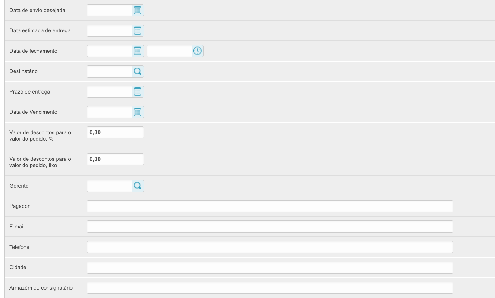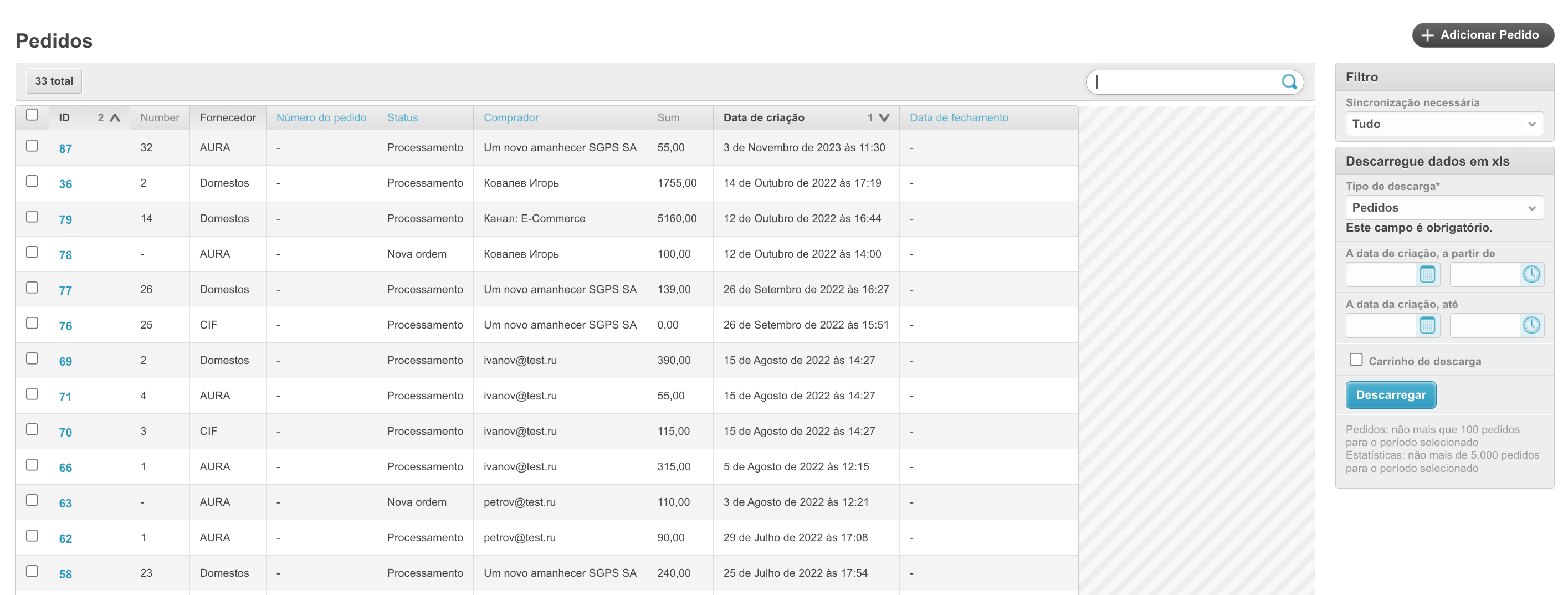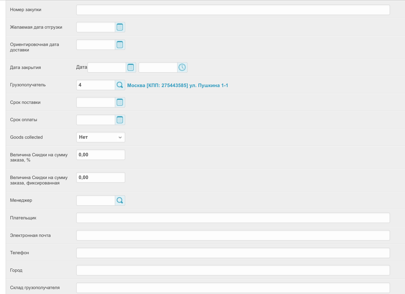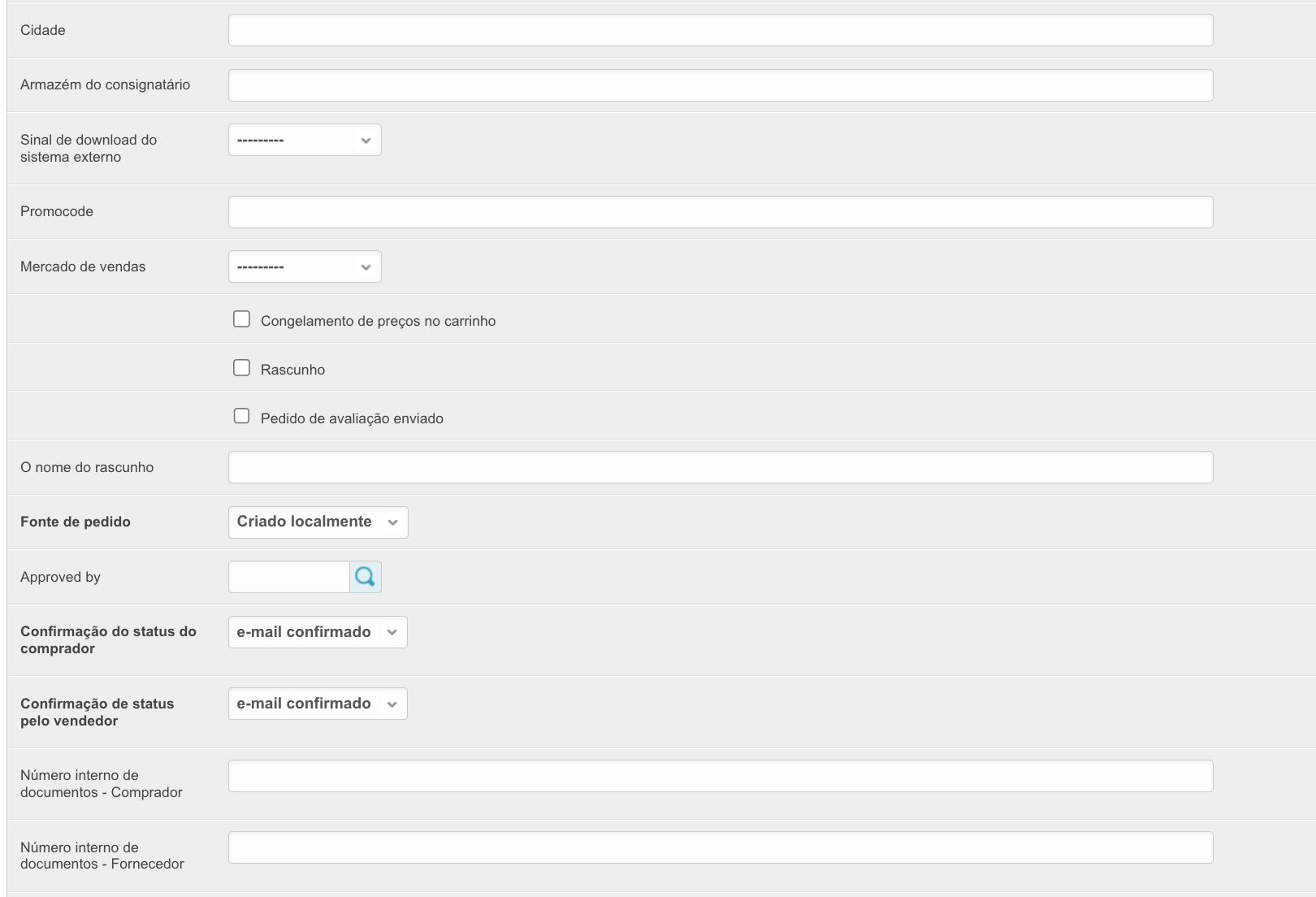 Para abrir esta seção, vá para a seção Pedidos no painel de administração localizado em project_name.agora.ru/admin. Uma tabela aparecerá com todos os pedidos feitos em sua conta pessoal: A tabela contém as seguintes colunas: ID - um número de pedido exclusivo na plataforma. Número - número do pedido de um cliente específico. Fornecedor - o nome do fornecedor para cuja mercadoria o pedido é feito. Número do pedido - o número do pedido atribuído pelo sistema ERP. A ser preenchido se a integração estiver configurada. Status - o status atual do pedido. Um novo pedido significa que os itens ainda estão no carrinho e não foram colocados. A tal pedido não é atribuído um número. Comprador - o nome do comprador que fez o pedido. Sum é o valor do pedido. Data de Criação - A data em que o pedido foi feito. Data de Encerramento - A data em que o pedido é fechado. Ele é preenchido quando o status do pedido é Fechado. Ao clicar no ID do pedido, você pode visualizar os dados do pedido: A sincronização é necessária - (não recomendamos instalar esta caixa de seleção, se algum pedido não tiver sido carregado no Sistema Agora, você deve entrar em contato com o suporte técnico) Ao instalar esta caixa de seleção, os pedidos serão enviados novamente se as informações do pedido não forem devolvidas do sistema ERP. Esse recurso é importante quando se trabalha com vários sistemas ERP ao mesmo tempo. Sincronizado - a caixa de seleção será instalada se o pedido tiver sido sincronizado com êxito com o sistema de contabilidade. Data de sincronização - a data e hora em que o pedido foi sincronizado com o sistema ERP. Fornecedor - o nome do fornecedor para cuja mercadoria o pedido é feito. Comprador - o nome do comprador que fez o pedido. E-mail de um usuário anônimo, Número de telefone de um usuário anônimo - os dados do usuário que fez o pedido, se ele foi feito sem registro. É relevante para projetos com um catálogo aberto e a capacidade de fazer um pedido sem registro. Usuário - os dados do usuário que fez o pedido. Número do pedido - o número do pedido atribuído pelo sistema ERP. A ser preenchido se a integração estiver configurada. Status - o status atual do pedido. Um novo pedido significa que os itens ainda estão no carrinho e não foram colocados. A tal pedido não é atribuído um número. Comentário - comente o pedido, caso tenha sido preenchido. Valor da Entrega, Descrição da Entrega, Endereço de Entrega, Campos Endereço de Entrega, Número da envio - Dados de Entrega do Pedido. O valor - o valor do pedido que foi baixado do sistema 1C. Valor pago - o valor pago pelo pedido. Porcentagem de pagamento - A porcentagem de pagamento para o pedido. Moeda - a moeda da ordem. Método de pagamento - o método de pagamento para o pedido especificado quando foi feito. Tipo de pagamento - o tipo de pagamento para o pedido. Dependendo do tipo de pagamento, depende da linha de status ao longo da qual o pedido será movido. Porcentagem de pré-pagamento - A porcentagem do pagamento antecipado do pedido. Relevante para a linha de status pré-paga. Pagamento diferido (dias) - o número de dias de pagamento diferido para o pedido. Tipo de dias de aula - o tipo de dias diferidos: banco, calendário ou trabalho. Organização - a organização que fez o pedido. Método de entrega - o método de entrega das mercadorias especificado ao fazer o pedido. Método de Entrega do Fornecedor - o método de entrega das mercadorias especificado ao fazer um pedido. Número de compra - o campo é preenchido se o pedido foi criado com base em um contrato concluído após a compra ter sido feita. A colocação de uma encomenda com base no resultado de uma compra pertence ao sistema SRM. Data de envio desejada - Data de envio desejada. A ser preenchido no checkout. Data estimada de entrega - Data de entrega recebida do sistema ERP. Data de fechamento - A data em que o pedido é fechado. Ele é preenchido quando o status do pedido é Fechado. Destinatário - o destinatário do pedido, é preenchido quando o pedido é feito pelo comprador. Prazo de entrega - A data de entrega do pedido. Data de Vencimento - a data de pagamento do pedido. Valor do desconto para o valor do pedido, % - se um desconto percentual sobre o valor do pedido foi aplicado ao pedido, ele será fixado neste campo. Valor do desconto para o valor do pedido, fixo - se um desconto fixo sobre o valor do pedido foi aplicado ao pedido, ele será especificado neste campo. Gerente - o gerente a quem pertence a ordem. Pagador, E-mail, Telefone, Cidade, Armazém do consignatário - dados do consignatário. Sinal de download do sistema externo - se o pedido foi baixado de um sistema externo, e não gerado na plataforma, então este parâmetro será preenchido. Promocode - ao aplicar um código promocional a um pedido, ele será indicado neste campo. Congelamento de preços no carrinho - se o pedido ainda não foi feito e está no carrinho, essa configuração será ativada. Rascunho - se a ordem for movida para rascunhos, a configuração será habilitada. Pedido de avaliação enviado - se uma solicitação tiver sido enviada para uma ordem para estimá-la, a configuração será habilitada. Nome do rascunho - Se a ordem for adicionada aos rascunhos, o nome do rascunho será preenchido neste campo. Fonte de pedido - mostra se o pedido foi feito na plataforma ou não. Approved by - o usuário que confirmou o pedido durante a aceitação. Confirmação do status do comprador, Confirmação do status pelo vendedor - se a barra de status implica a confirmação do pedido pelo comprador e pelo vendedor, então esses campos serão preenchidos dependendo da disponibilidade das confirmações. Número Interno do Documento do Comprador - Número do Documento do Comprador. Número Interno do documento do fornecedor - O número do documento do fornecedor. Número para a especificação - O número da lista técnica do