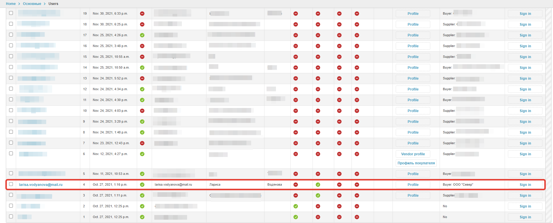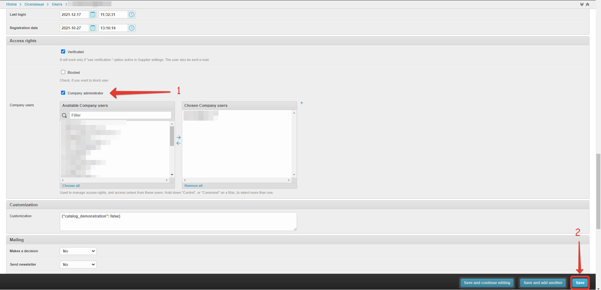 Выберите нужного пользователя, которому вы хотите предоставить возможность заводить пользователей связанных с покупателем, и перейдите на страницу настроек, кликнув по логину: В разделе Права доступа установите чекбокс установите чек-бокс Администратор компании и (1) и нажмите Сохранить (2): В меню этого личного кабинета появится раздел Админ.Компании: Для создания нового Пользователя необходимо кликнуть по кнопке Создать пользователя: Далее необходимо заполнить данные пользователя и сохранить изменения, кликнув по кнопке "Сохранить": После сохранения данных будет показано уведомление о успешном создании Пользователя: При клике на кнопку Вернуться к списку откроется страница со списком созданных пользователей через этот аккаунт: Пользователь также доступен в разделе Пользователи административной панели проекта: Пользователю будет доступен обычный функционал личного кабинета Покупателя. Администратор компании может заблокировать и разблокировать созданных пользователей в разделе Администрирование компании: Администратор компании может авторизоваться в созданном аккаунте пользователя компании с помощь кнопки Вход в блоке Личный кабинет: |