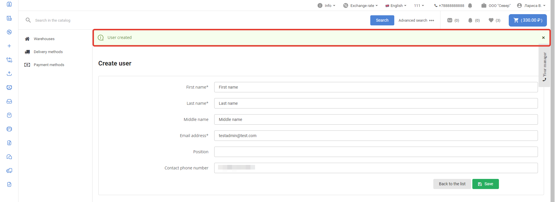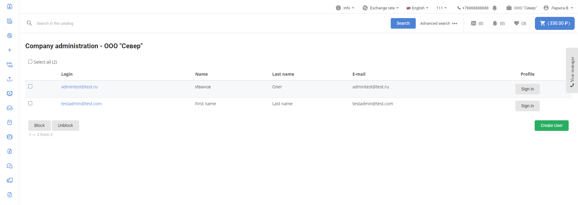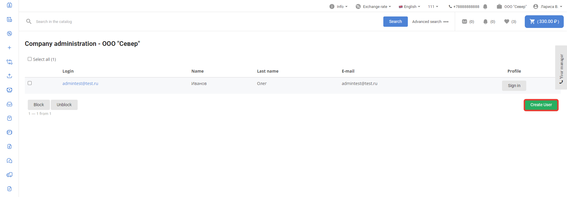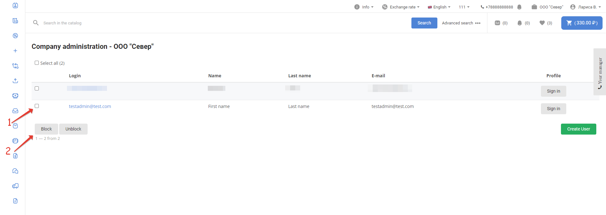 After logging in, go to the Users section: Select the user who will have to create users associated with the customer, and go to the settings page by clicking on the login: In the Permissions section, select the Company administrator checkbox and click Save: The administrator section will appear in the menu of this personal account. To create a new User, click on the Create User button: Next, fill in the user data: After saving the data, a notification about successful creation of the User will be displayed: When you click on the Back to the list button, a page with a list of created users through this account will open: The user is also available in the Users section of the project administrative panel: The user will have access to the usual functionality of the Customer's personal account. The company administrator can lock and unlock created users in the Administration section of the company: The company administrator can log in to the created user account of the company using the Login button in the Personal Account section: |