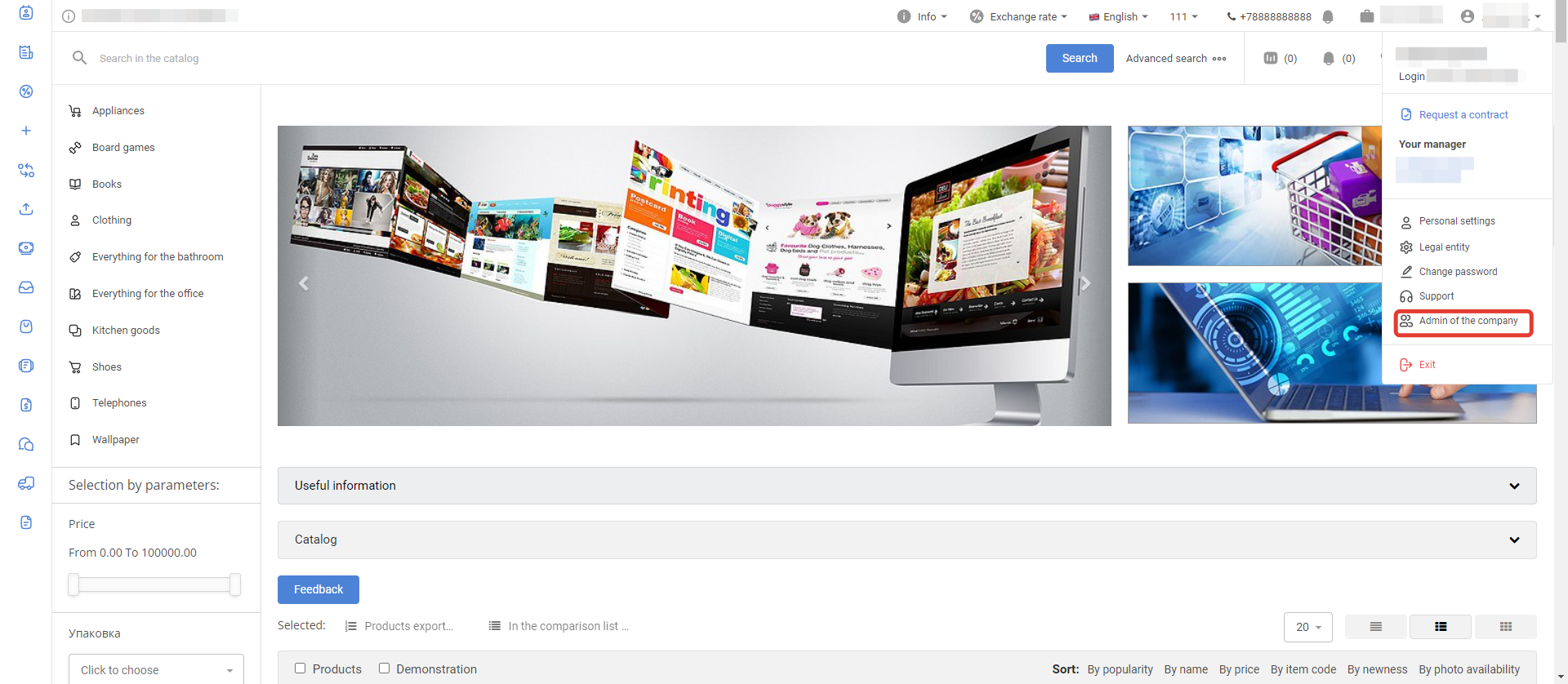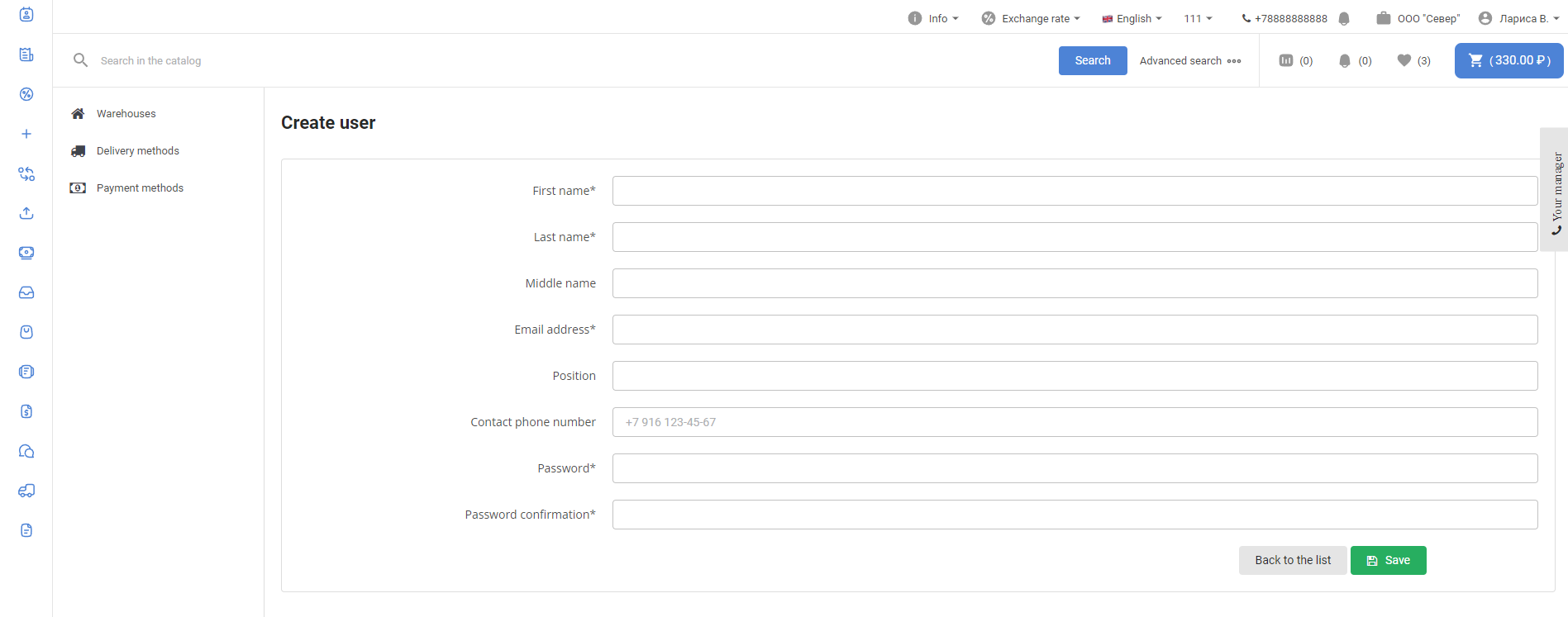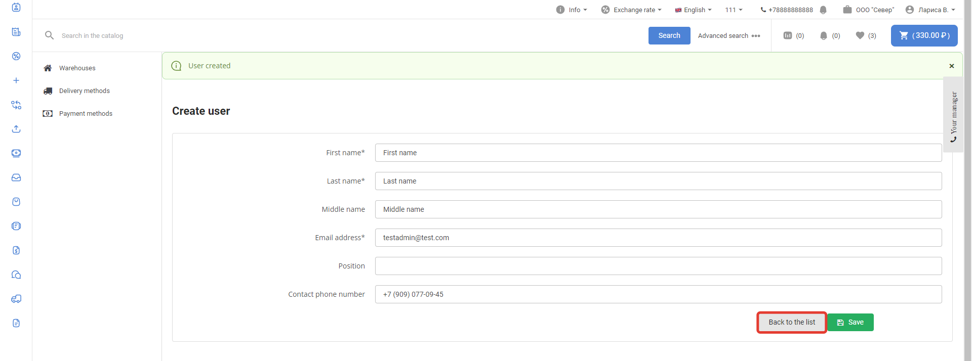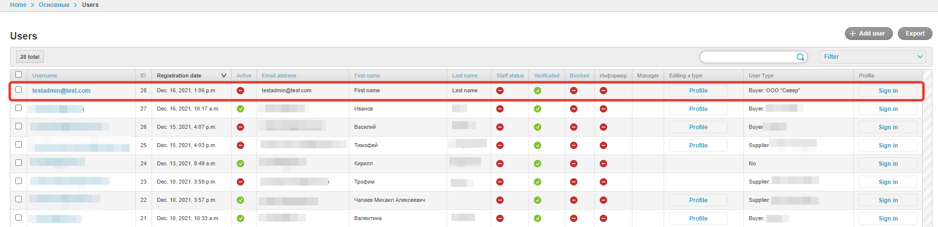 After logging in, go to the Users section: Select the user who will have to create users associated with the customer, and go to the settings page by clicking on the login: In the Permissions section, select the Company administrator checkbox and click Save: The administrator section will appear in the menu of this personal account. To create a new User, click on the Create User button: Next, fill in the user data: After saving the data, a notification about successful creation of the User will be displayed: When you click on the Back to the list button, a page with a list of created users through this account will open: The user is also available in the Users section of the project administrative panel: The user will have access to the usual functionality of the Customer's personal account. The company administrator can lock and unlock created users in the Administration section of the company: The company administrator can log in to the created user account of the company using the Login button in the Personal Account section: |
