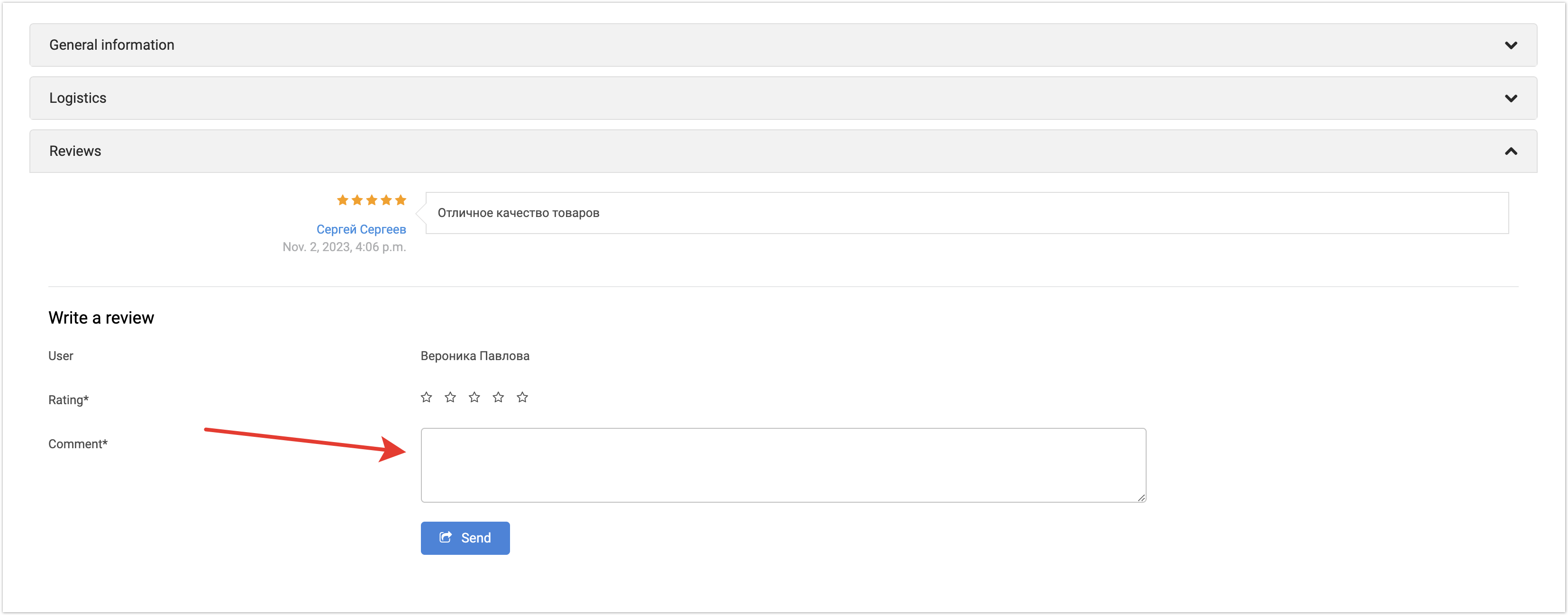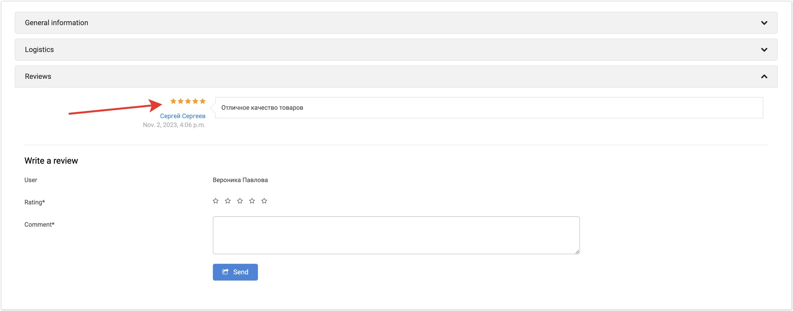 View supplier ratingsTo view a supplier's rating, the buyer must go to his personal account, open the Suppliers section, and click on the name of the supplier of interest. The Reviews field displays the rating given to the supplier. Rating the supplier1. The buyer can rate the supplier and write a comment in his personal account in the Suppliers section (you must click on the name of the supplier company and go to the Reviews tab). 2. The buyer can also give a rating when ordering the product. To do this, in the Orders section, open the desired order and at the bottom of the order, put a rating and write a comment (the ability to set a rating for each order status is configured in the administrative panel in the Manage order statuses section). 3. The buyer can leave a comment on the product by going to the card of the desired product: 4. The rating of the supplier company can also be set by the System administrator in the administrative panel. Go to the Suppliers section, select the required supplier by clicking on its name, in the window that opens, go to the Supplier Profile section and find the Rating field. In this field, set the rating value from 1 to 5: 1 is 1 star, 5 is 5 stars. |