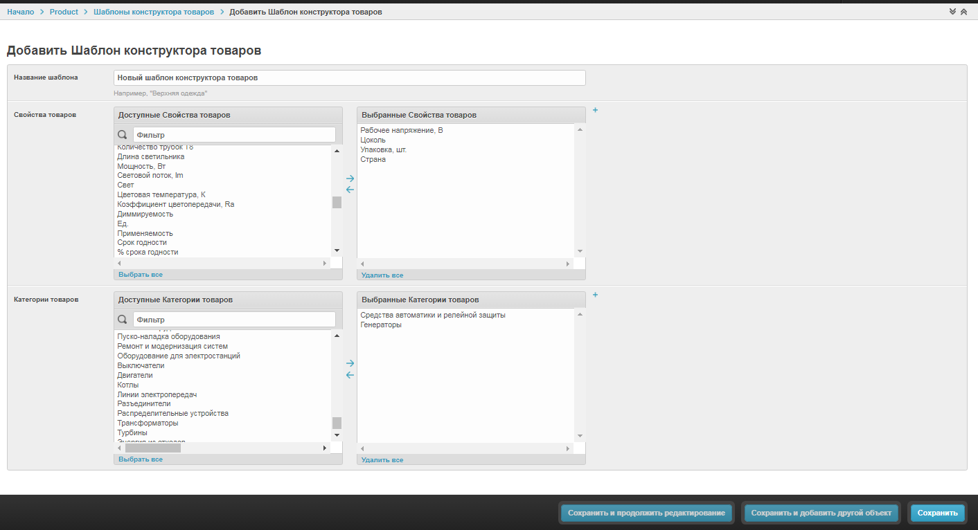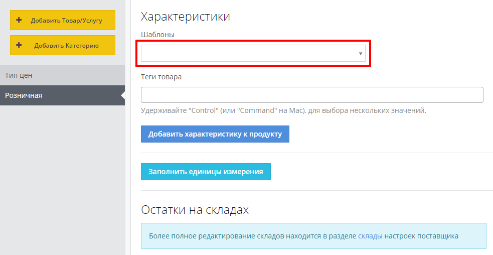 The creation of templates with a list of properties for a better description of products in a particular product category is supported. Then, when adding products manually, a list of required properties for this product category will be displayed.