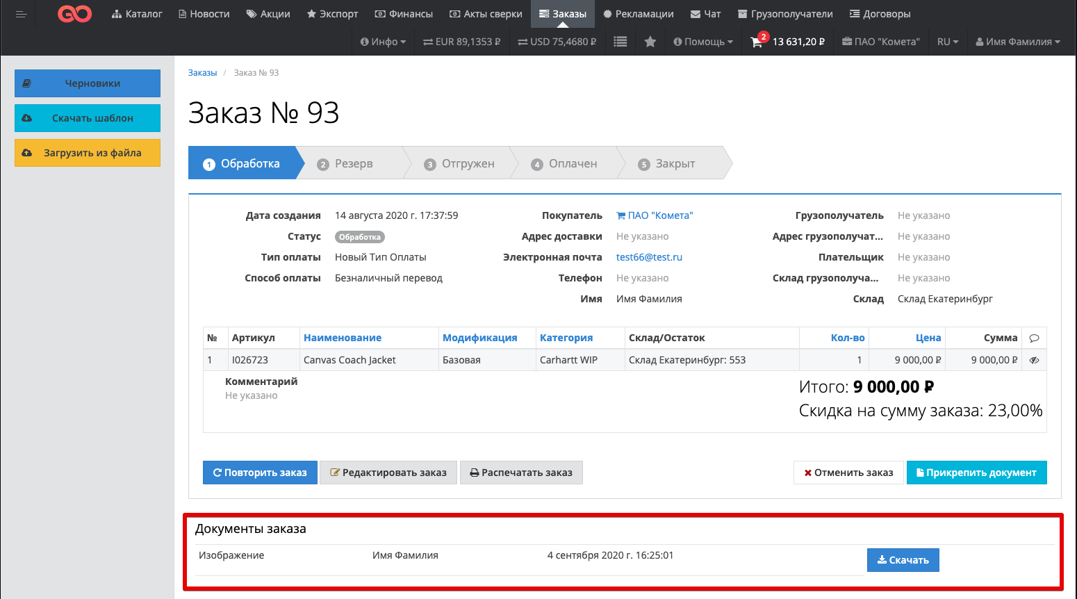 The statuses that can be changed are highlighted in red. To switch to another status, click the Edit status button and select the required status (if possible). Below the statuses, General information on the order is displayed: date of creation, name of the supplier / buyer, type and methods of payment, name and contact information of the buyer, warehouse, contract number, percentage of payment, consignee, internal document number etc. The table contains all the products of the order with the following data (some columns may be hidden depending on the supplier's settings):