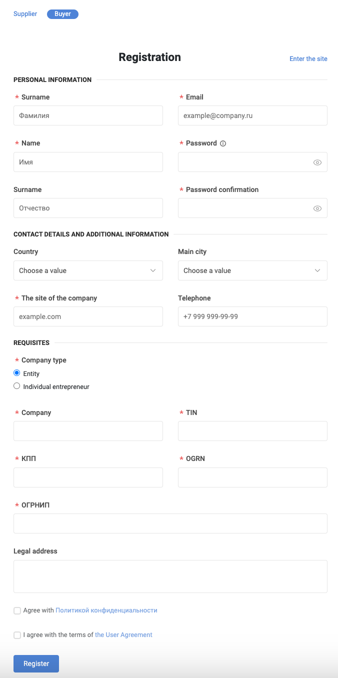 В процессе регистрации заполните следующие группы полей. Данные пользователя (ФИО*, Адрес электронной почты (e-mail)*, Пароль*, Подтверждение пароля*). Контактные данные и дополнительная информация (Сайт компании*, Страна, Основной город, Телефон). Реквизиты компании (Тип компании, Наименование, ИНН, должность, КПП, ОГРН, Юридический адрес и проч.). Запрашиваемые при регистрации реквизиты отличаются для юридического лица и индивидуального предпринимателя. Если в Системе уже был зарегистрирован вводимый ИНН, то Система выведет предупреждающее сообщение с предложение обратиться в службу поддержки или восстановить пароль. Налоговые идентификаторы, такие как CPF, CNPJ для Бразилии, проверяются автоматически, поэтому если они являются недействительными, зарегистрироваться не получится. CPF используется только для регистрации, CNPJ используется при оформлении сделок. Логи записываются в административной панели в разделе Ошибки проверки CPF и CNPJ. Для каждого налогового идентификатора записывается статус передачи (успешно или нет), числовое значение идентификатора, ссылка на JSON, который был возвращен SerPro в ответ, дата и время отправки POST-запроса в API SerPro, дата и время возвращаемого JSON из API SerPro. Согласие на обработку персональных данных и регистрация контрагента Для завершения процесса регистрации пользователь должен подтвердить согласие на обработку персональных данных и нажать кнопку Регистрация. После успешной регистрации, пользователь получит уведомление об успешной регистрации по указанному адресу электронной почты.