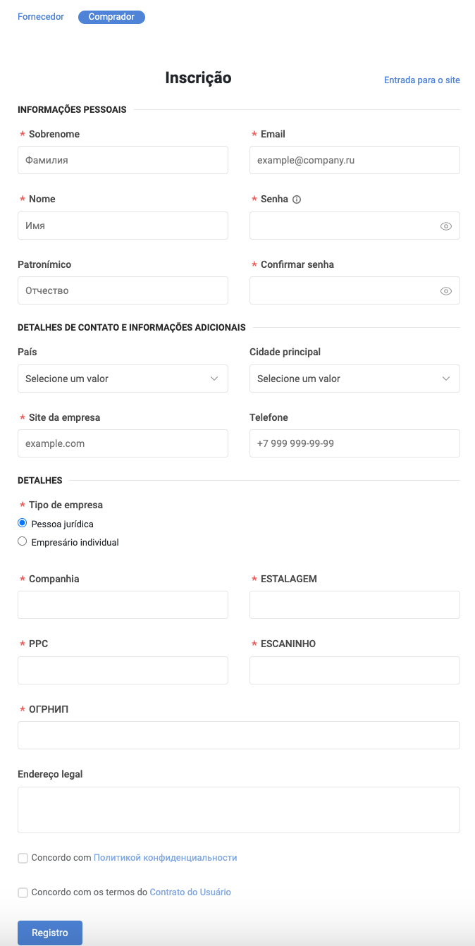 Informações pessoais (nome *, endereço de e-mail (e-mail)*, Senha*, Confirmar senha*). Detalhes de contato e informações adicionais (Site da empresa*, País, Principal cidade, Telefone). Os requisitos (Tipo de Empresa, Nome, TIN, Posição, KPP, OGRN, Endereço Legal, etc.).Os detalhes solicitados durante a inscrição são diferentes para uma pessoa jurídica e um empreendedor individual. Se a TIN inserida já tiver sido registrada no Sistema, o Sistema exibirá uma mensagem de aviso com a proposta de entrar em contato com o serviço de suporte ou restaurar a senha. Identificadores fiscais como CPF, CNPJ para o Brasil são verificados automaticamente, portanto, se forem inválidos, o registro não funcionará. CPF é utilizado apenas para cadastro, CNPJ é utilizado para registro de transações. Os registros são registrados no painel administrativo na seção de erros de validação de CPF e CNPJ. Para cada ID fiscal, a situação da transferência (bem sucedida ou não), o valor numérico do identificador, uma referência ao JSON que foi devolvido pelo SerPro na resposta, a data e a hora em que a solicitação post foi enviada à API SerPro, e a data e a hora do json retornado da API SerPro são registradas. Consentimento para o processamento de dados pessoais e registro da contraparte Para concluir o processo de registro, o usuário deve confirmar o consentimento para o processamento de dados pessoais e clicar no botão Registrar. Após o registro bem-sucedido, o usuário receberá uma notificação de registro bem-sucedido no endereço de e-mail especificado.