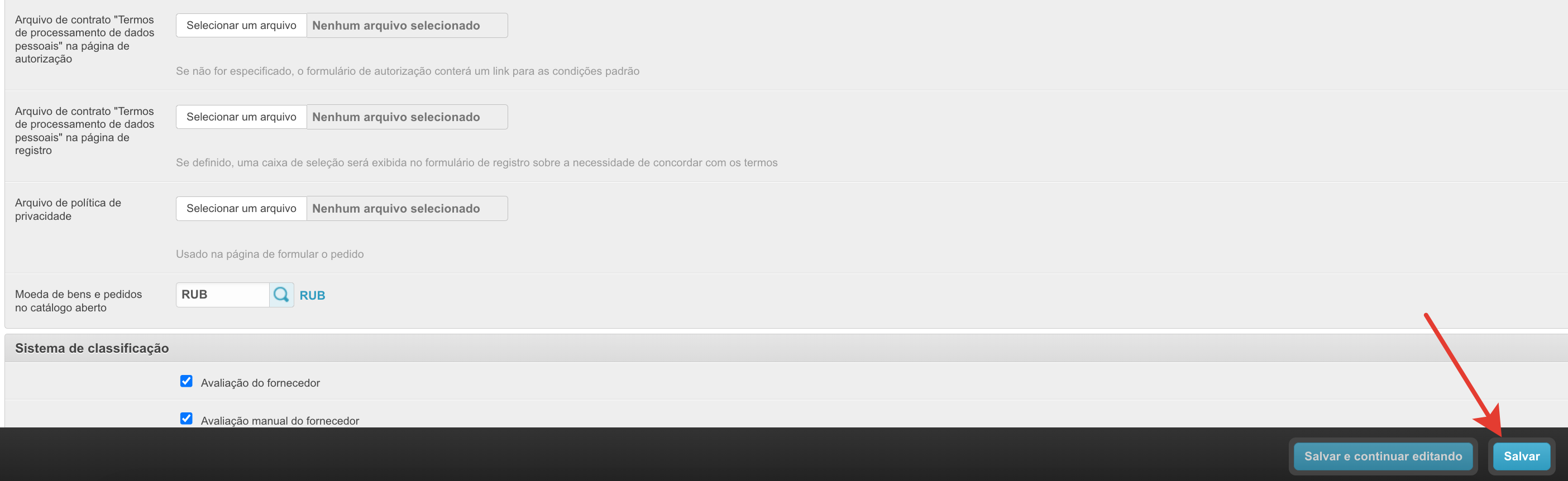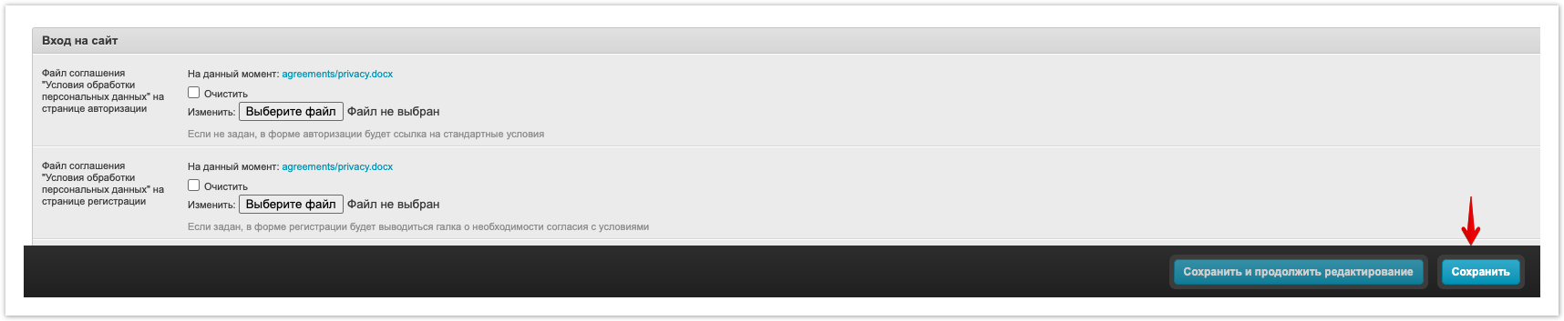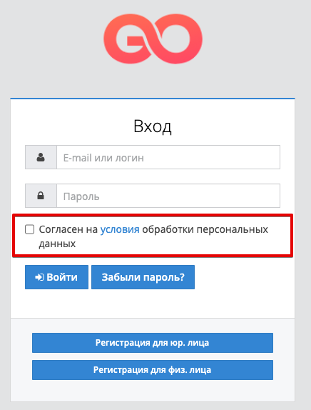 Ao autorizar e se cadastrar no portal, o sistema oferecerá ao usuário que concorde com os termos de processamento de dados pessoais: Quando você clica no botão Termos e Condições, uma página com condições padrão para o processamento de dados pessoais será aberta. O administrador do portal tem a oportunidade de carregar seus próprios termos de processamento de dados pessoais. Para fazer isso, você deve: Faça login no painel administrativo do projeto e vá para a seção Configurações do Portalda plataforma No login para o bloco do site há configurações: Arquivo de contrato "Termos de processamento de dados pessoais" na página de autorização Arquivo de contrato "Termos de processamento de dados pessoais" na página de registro Usando o botão Selecionar um arquivo, você pode selecionar o arquivo desejado e carregá-lo na página apropriada. É permitido usar arquivos de texto em diferentes formatos (por exemplo: txt, doc, pdf, etc.) Depois de carregar suas próprias condições, clicar no botão Termos salvará o arquivo baixado no computador do usuário. |