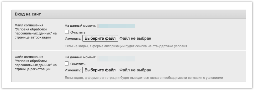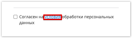 При авторизации и регистрации на портале, система предложит пользователю согласится с условиями обработки персональных данных: При клике на кнопку Условия откроется страница со стандартными условиями обработки персональных данных. Администратор портала имеет возможность загрузить собственные условия обработки персональных данных. Авторизоваться в административной панели проекта и перейти в раздел Настройки порталаплатформы. В блоке Вход на сайт присутствуют настройки: Файл соглашения "Условия обработки персональных данных" на странице авторизации Файл соглашения "Условия обработки персональных данных" на странице регистрации С помощью кнопки Выберите файл вы можете выбрать нужный файл и загрузить его на соответствующую страницу. Допускается использование текстовых файлов в разных форматах (например: txt, doc, pdf итд) После загрузки собственных условий при клике на кнопку Условия на компьютер пользователя будет сохранен загруженный файл. |